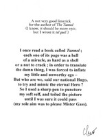 "Not a Very Good Limerick" by Claro "Not a Very Good Limerick" by Claro--the French translator of The Tunnel. Claro sent this limerick to Gass. -