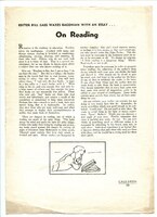 "Editor Bill Gass Waxes Baconian With an Essay...On Reading" "Editor Bill Gass Waxes Baconian With an Essay...On Reading," an essay by William H. Gass for his high school newspaper, The Cauldron, circa 1942. -