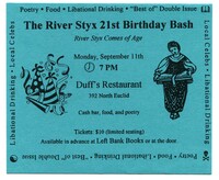 "River Styx 21st Birthday Bash" Invitation A postcard invitation to a celebration of River Styx's 21st anniversary at Duff's Restaurant. -
