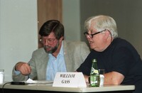 Wayne Fields and William Gass at the Writer and Religion Conference Wayne Fields and William Gass speaking as panelists at William Gaddis's presentation at the Writer and Religion Conference on October 24, 1994. -