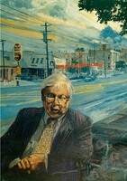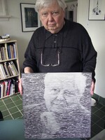 William H. Gass holding artwork by Buzz Spector William H. Gass holding Author (White Haired Man) by Buzz Spector. -