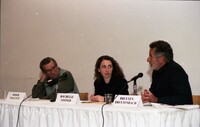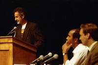 Breyten Breytenbach, Nuruddin Farah, and Steven Meyer at the Writer in Politics Conference Breyten Breytenbach presenting at podium with panelists Nuruddin Farah and Steven Meyer listening at the Writer in Politics Conference on October 21, 1992 -