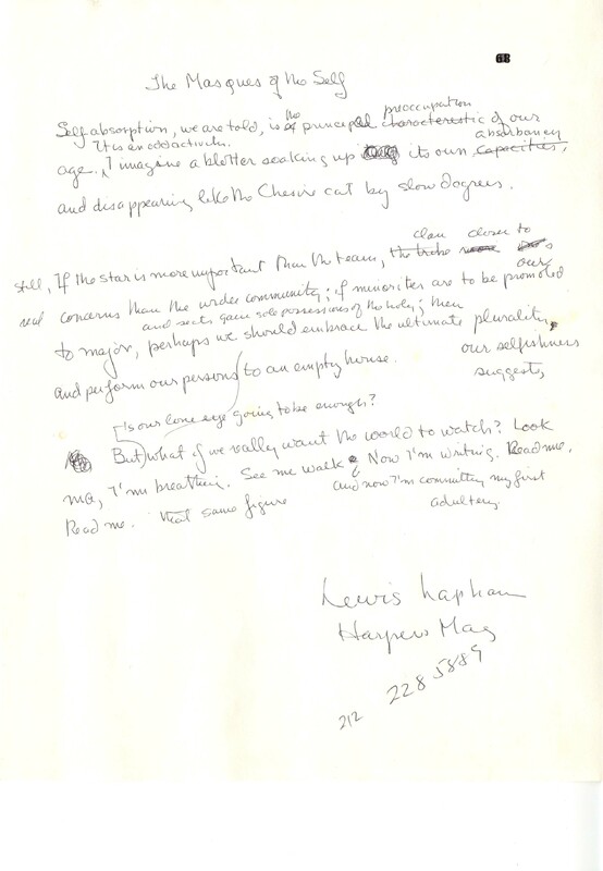 Gass had by this time become a regular contributor to Harper's Magazine, and eventually he became a contributing editor. The essay "Autobiography" first appeared in Harper's Magazine as "The Art of Self: Autobiography in the Age of Narcissism." Shown here is an early manuscript draft--somewhat rare in the William H. Gass Papers--of the essay, as well as a version published in the first Washington University Modern Literature Collection newsletter.