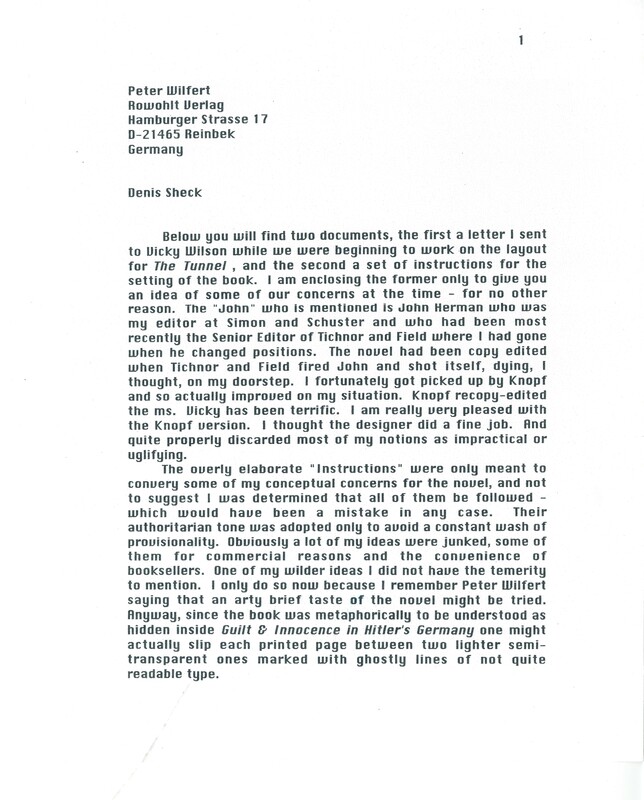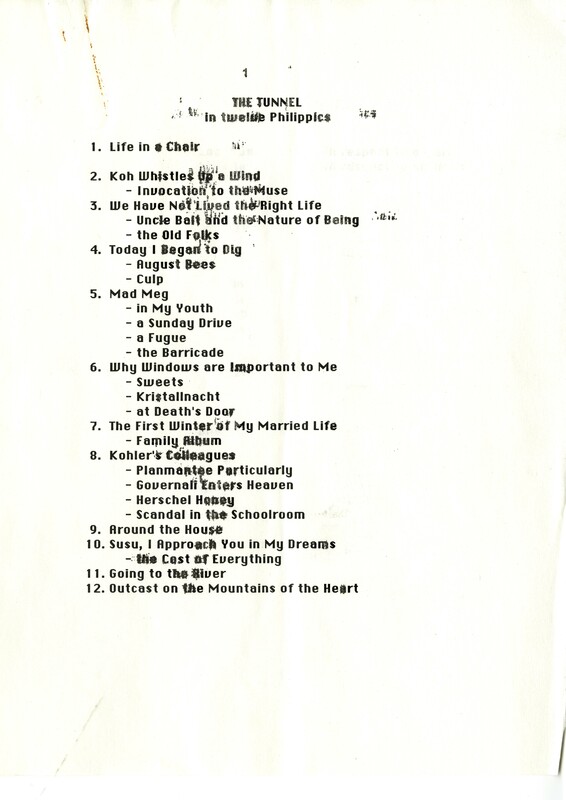 The layout and design instructions, as well as the typed outline notes, will be of particular interest to fans and scholars of The Tunnel. In these documents Gass explicates some of his original ideas for how the book should be presented, and the organizational scheme and thematic characteristics of the story. (Note: as with the outlines and notes for the other books included in this exhibit, these documents do not necessarily reflect the final text.