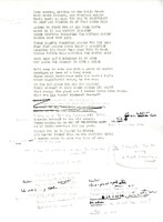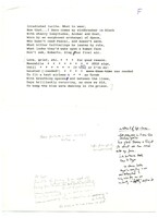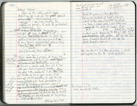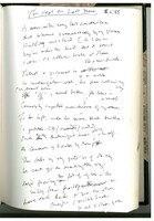 "The Thousand and Second Night" Notebook pages showing the first title of and early notes toward the pivotal, experimental, multifaceted poem "The Thousand and Second Night," which was based partly upon Merrill's Bell's palsy experience. These notes capture Merrill's uncertainty what is happening to his half-paralyzed face, and his realization the condition can be a metaphor for his soul. These are just three of a total sixty-eight manuscript pages in the collection. The drafts includes pages toward a pseudo quote about the soul and abuse of the earth, two major themes of the epic Ouija board poems that came later.