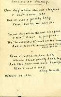 "Looking at Mummy" "Looking at Mummy," Merrill's first poem at age 6, written in his mother's hand (so how much of it she may have written herself remains a question). This experience/poem later influenced “The Broken Home.”