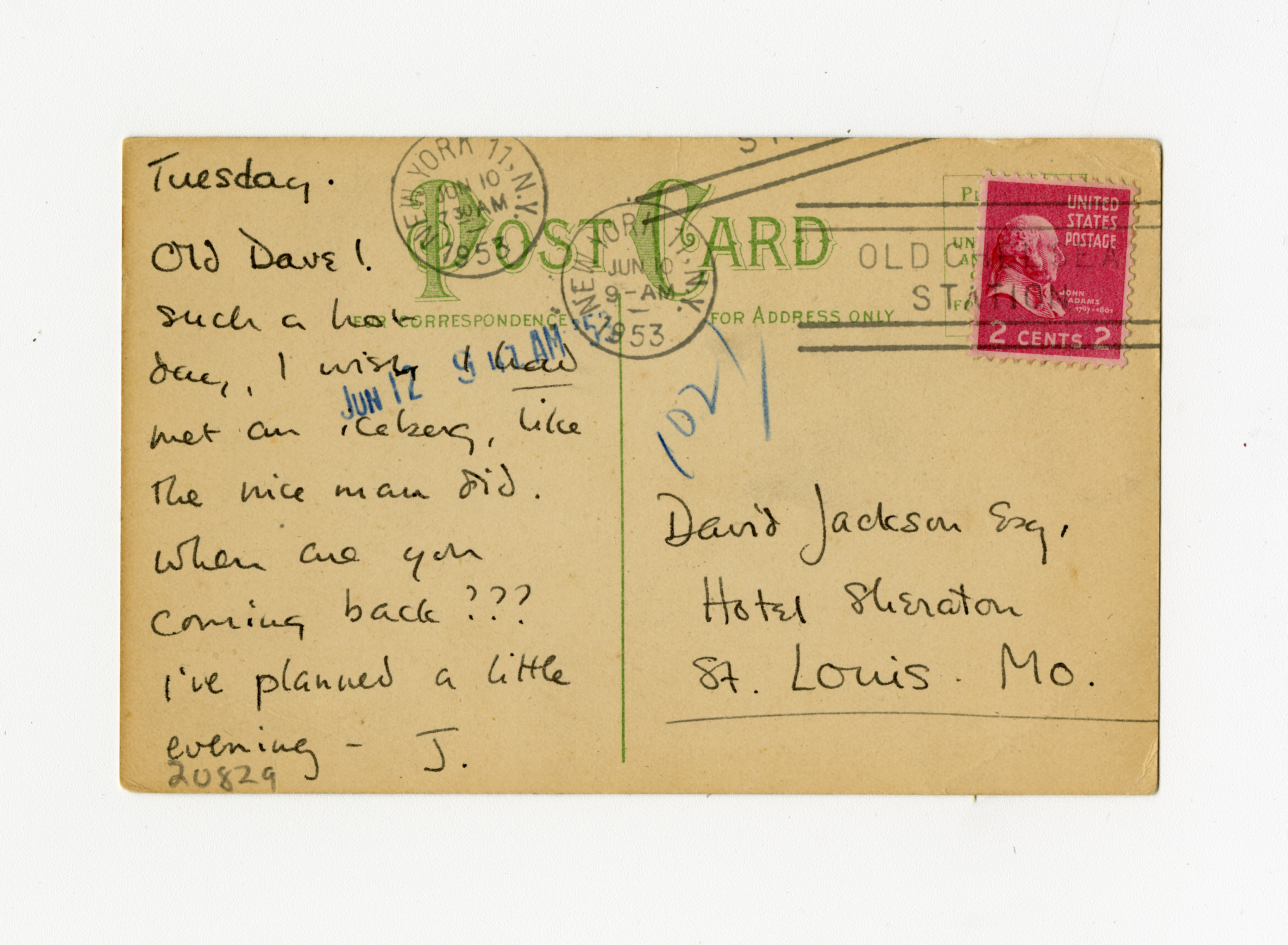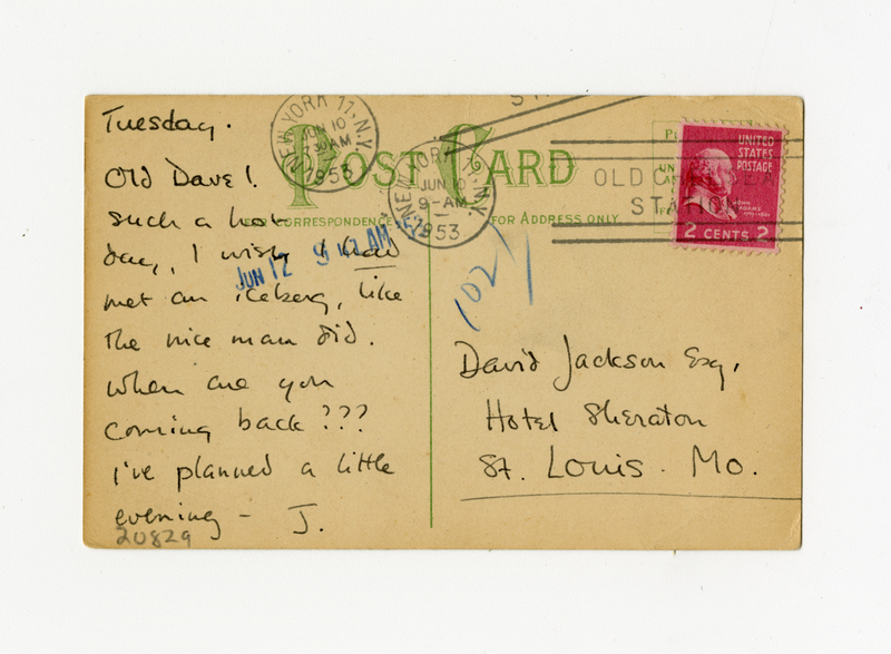 Merrill, James. 1953. “James Merrill postcard to David Jackson”. Series_I_Correspondence, James Merrill: Life and Archive, accessed February 11, 2026, https://digitalexhibits.library.wustl.edu/s/james-merrill-life-and-archive/item/38382