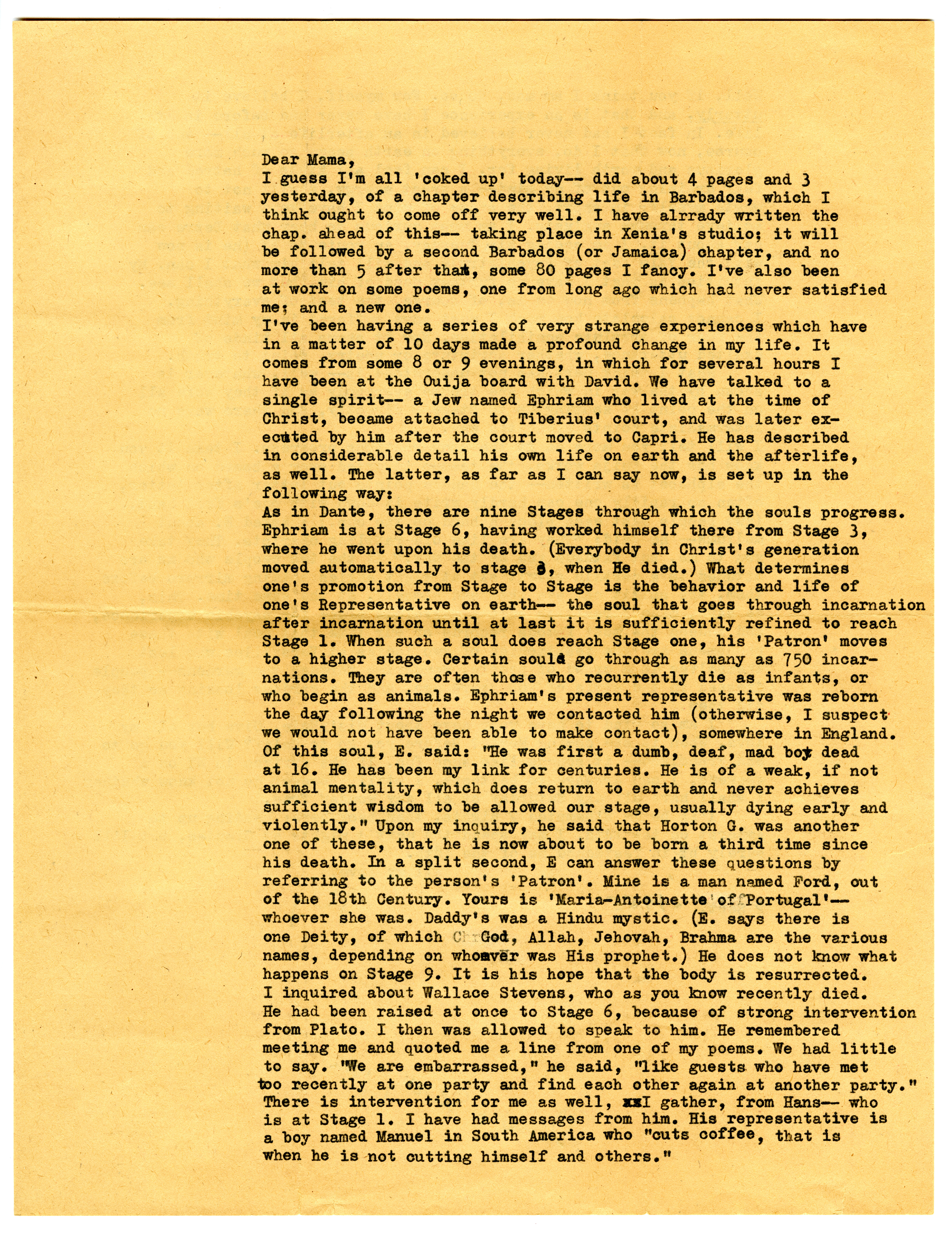 - Typed letter from James Merrill to his mother Hellen Ingram Plummer, explaining the spirit Ephraim and what Merrill is learning about patrons, representatives, and other topics.