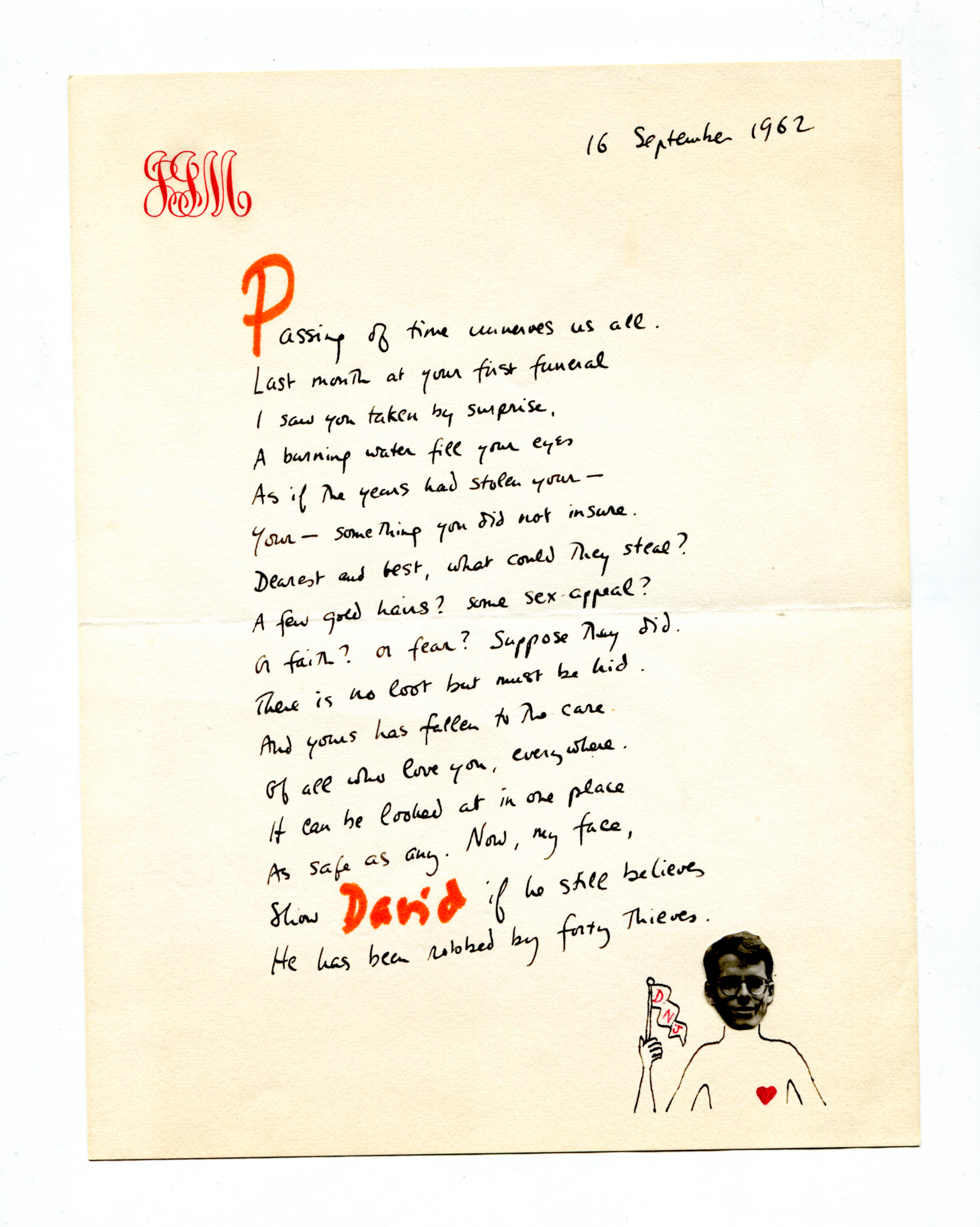 - James Merrill letter to David Jackson with a poem, drawings, and a photo Merrill made for Jackson's 40th birthday.