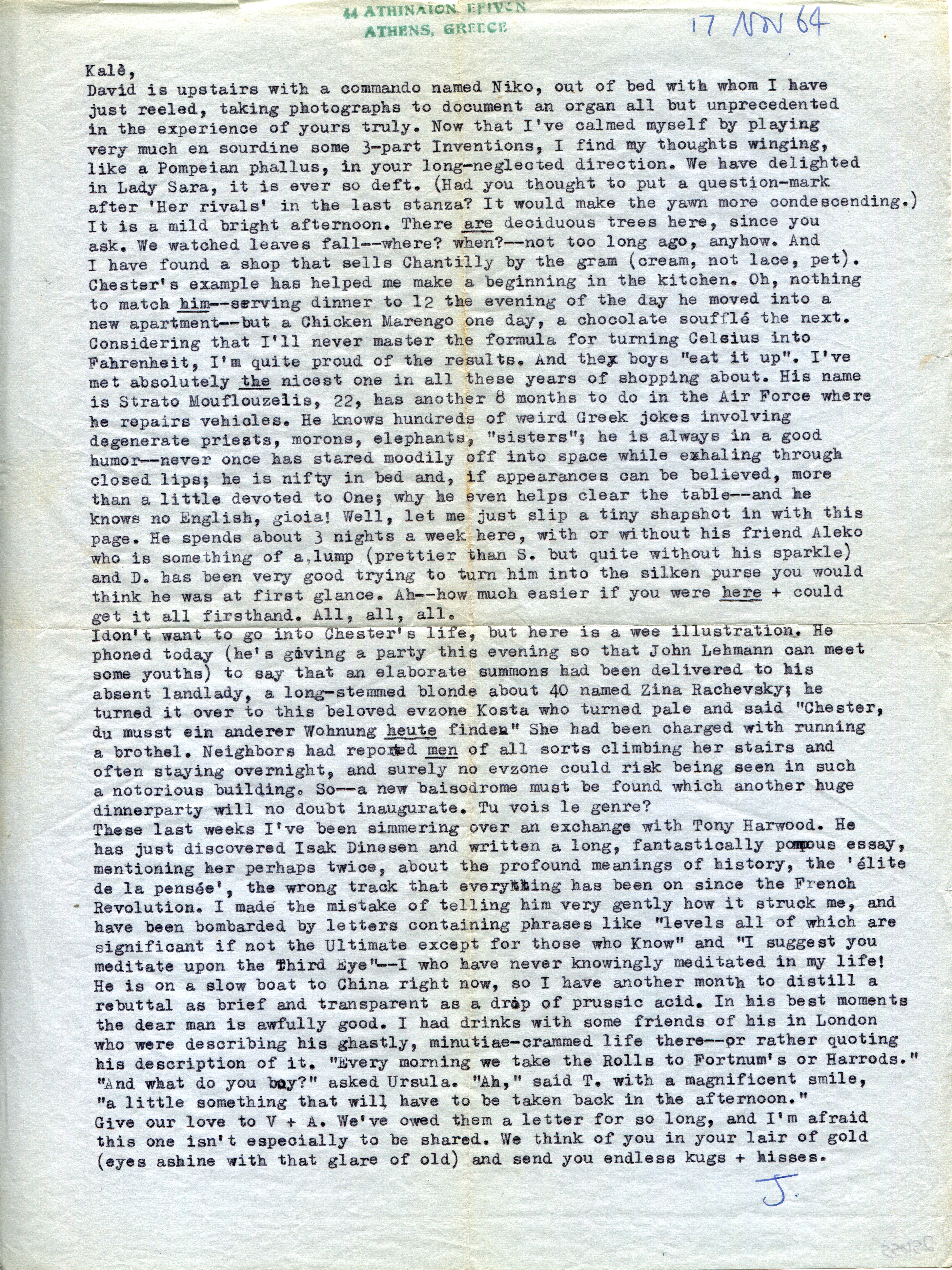 James Merrill letter to Daryl Hine describing his and David Jackson's latest sexual partner. Merrill mentions his new relationship with Strato Mouflouzelis and also complains of spiritual and historical debates with Tony Harwood.