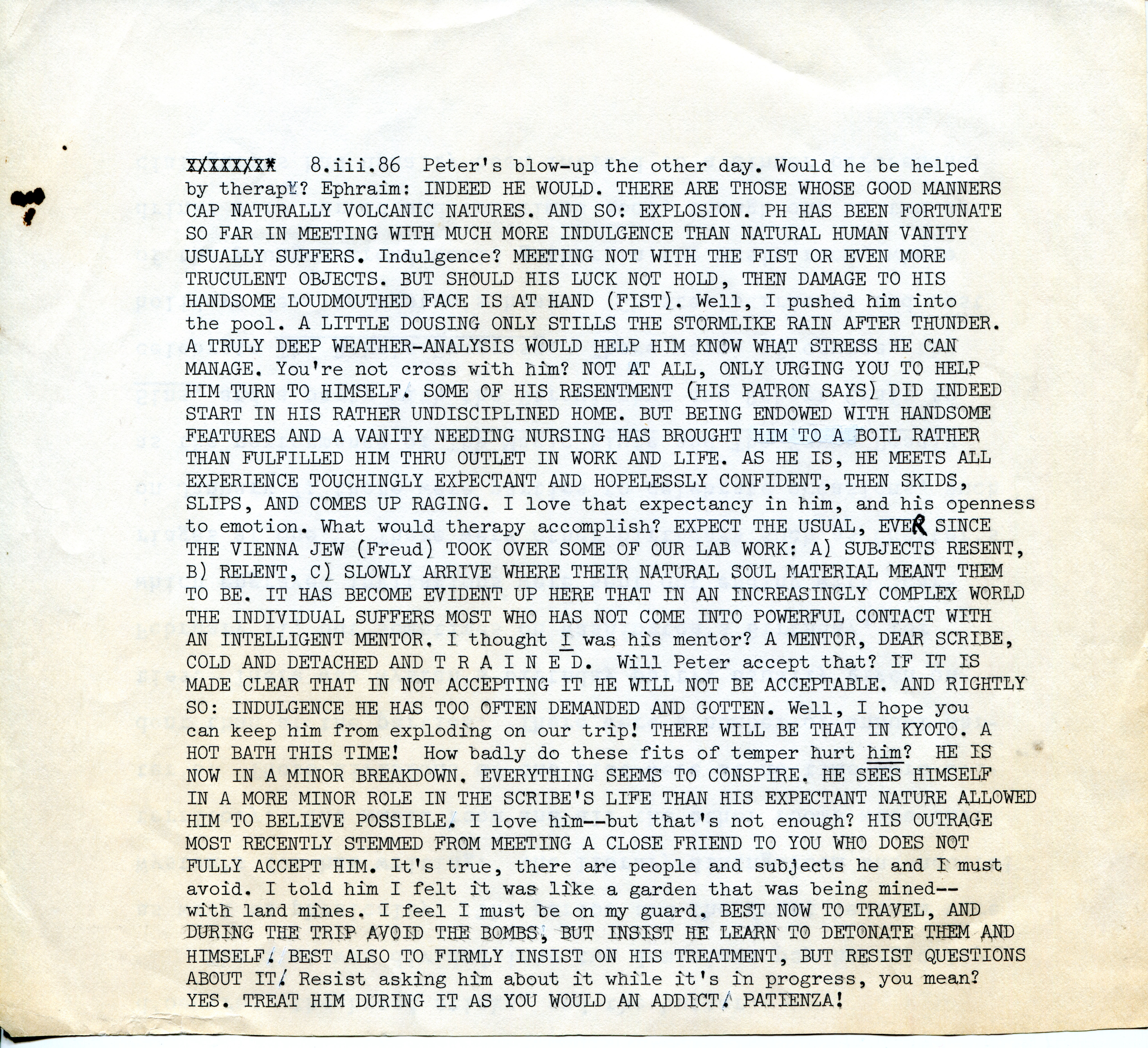 - During the March 8, 1986 séance James Merrill gets relationship advice from Ephraim concerning Peter Hooten, with mention of the fight that led to Merrill pushing Hooten into the pool.
