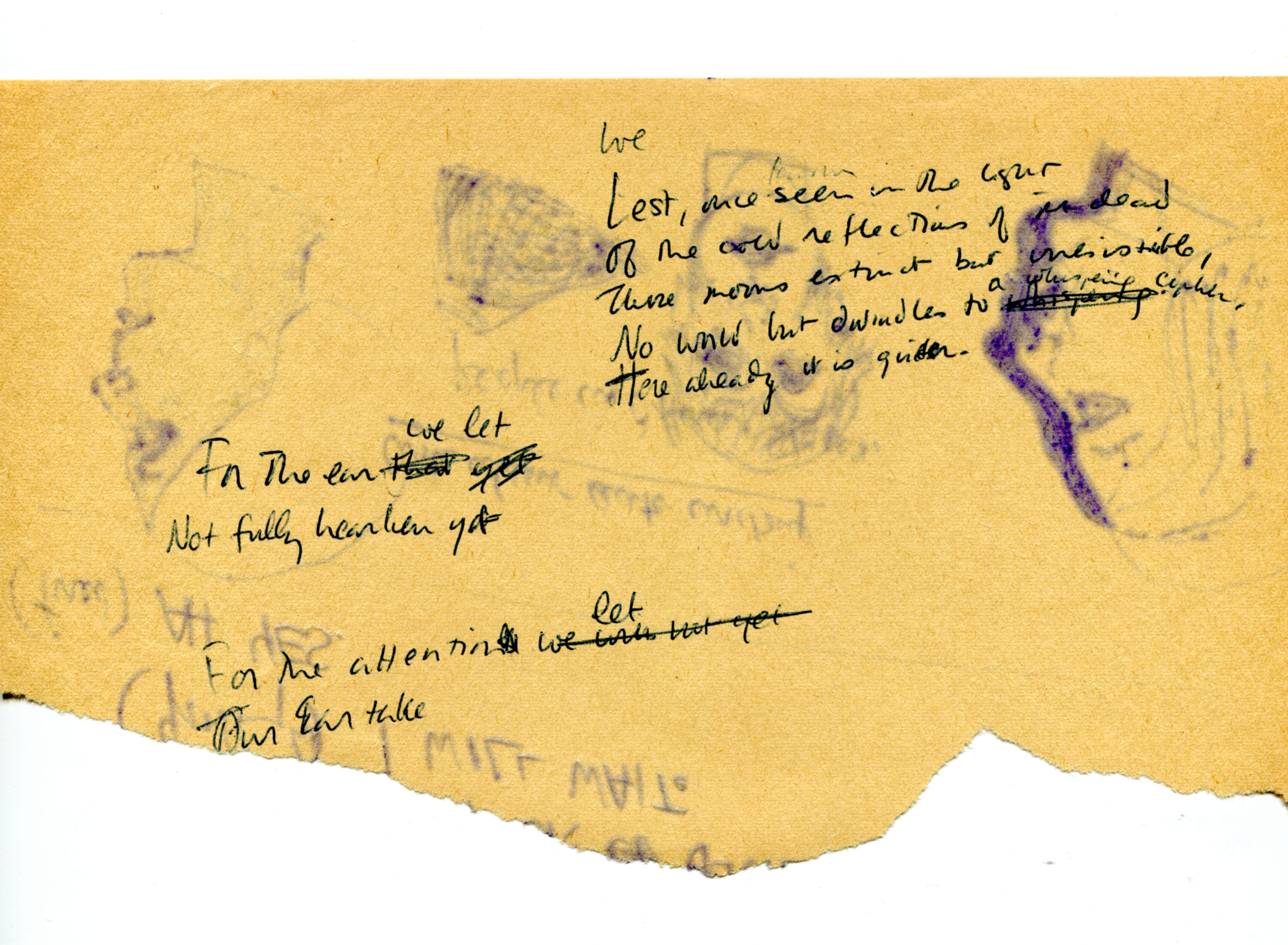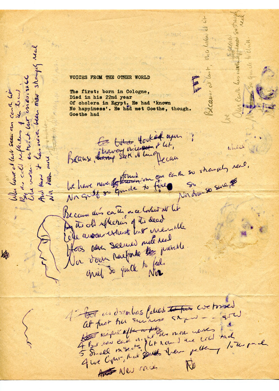 - "Voices from the Other World," published in The Country of a Thousand Years of Peace, was James Merrill's first--and for many years, only--treatment of the Ouija board séances in a poem. Merrill's supernatural and domestic life with Jackson both enter his poetry here as subjects for the first time. Included here are two double-sided pages from a total of 27 draft pages, which show Merrill's fondness for doodling faces--especially female faces--as he composed poems.
