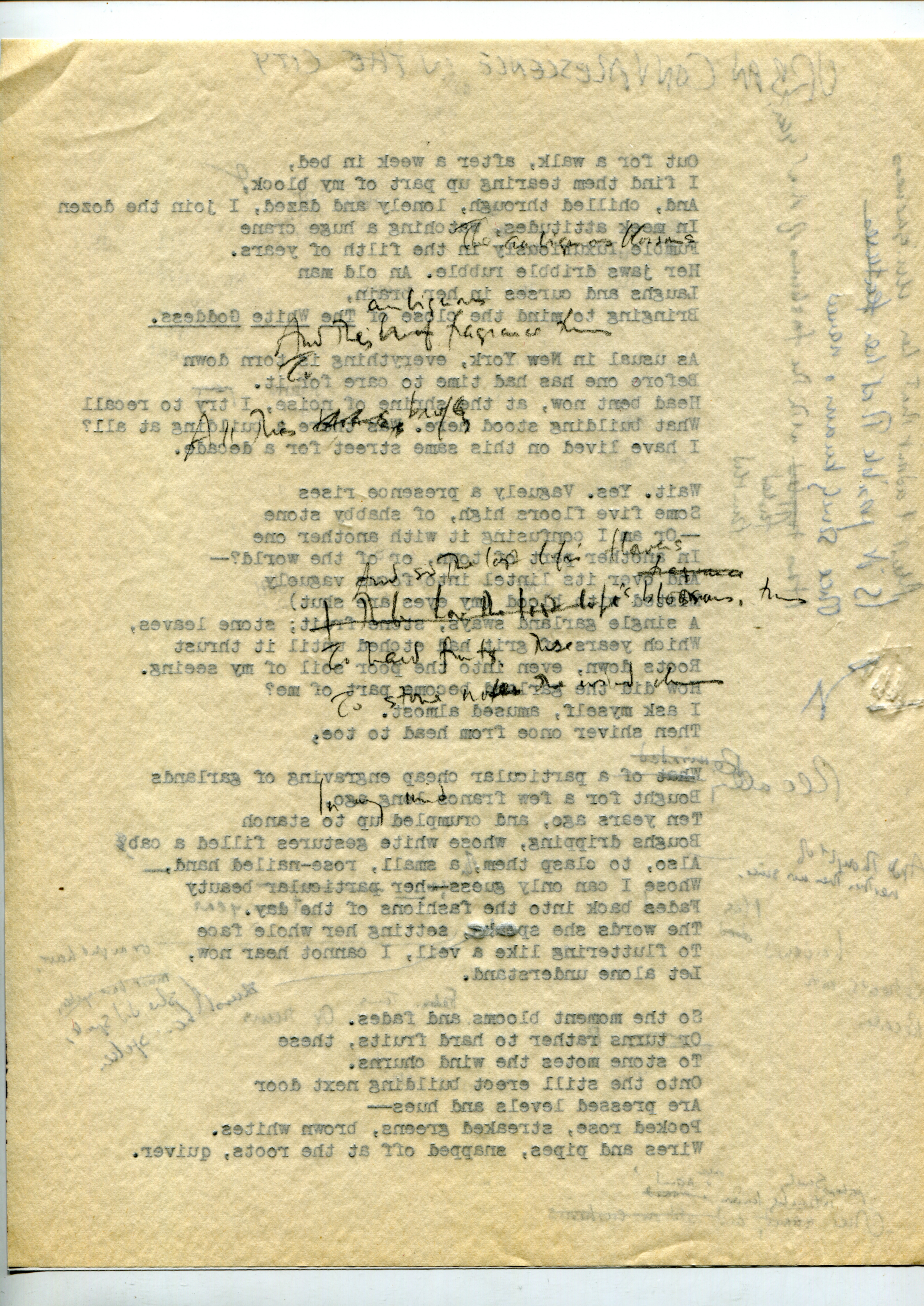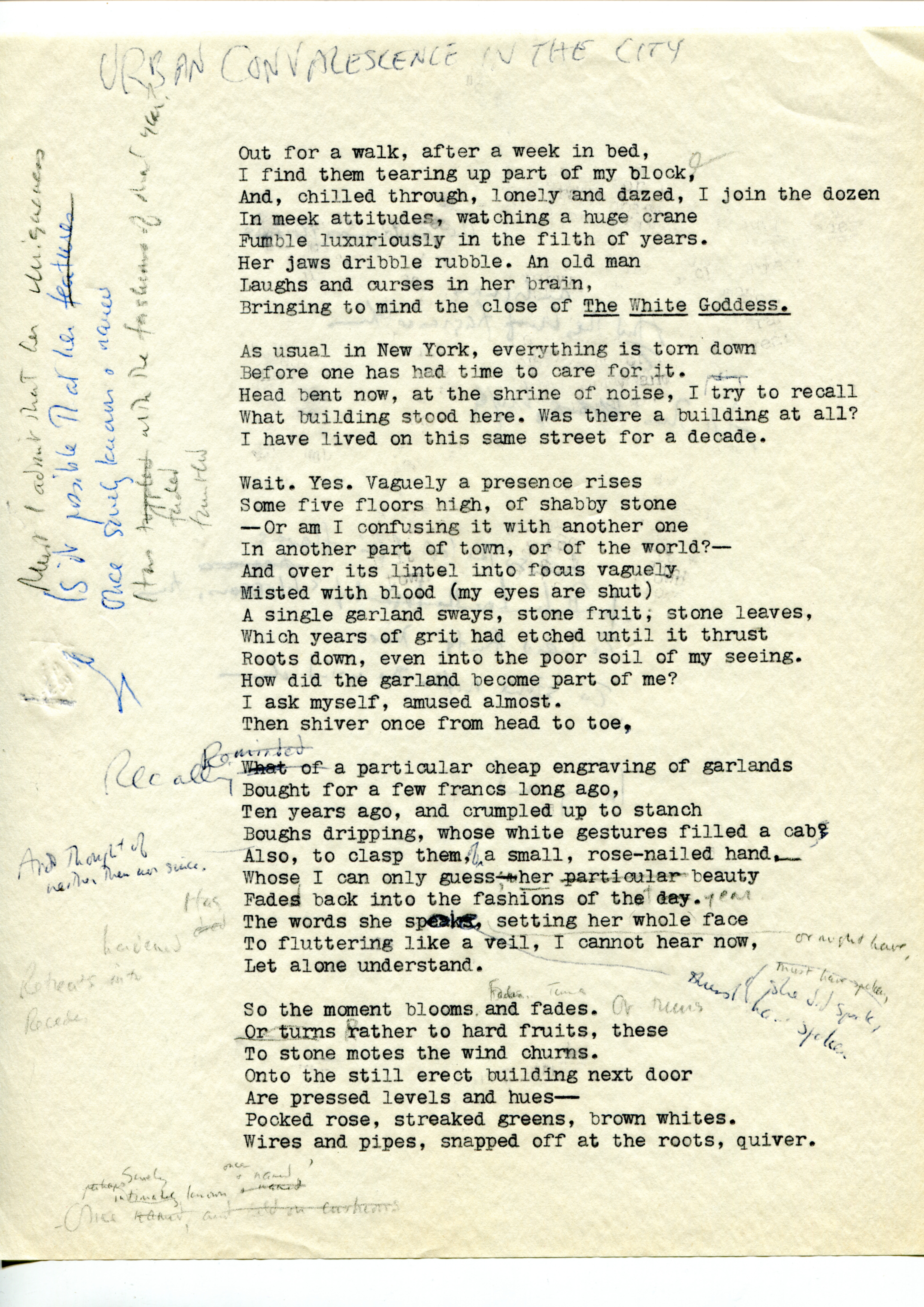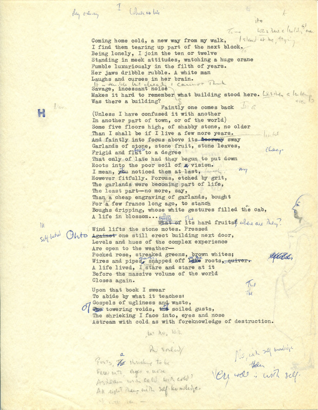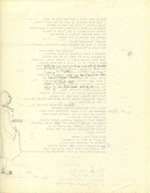- This entry includes two typescript draft pages (among the 40 worksheets Merrill saved) with holograph corrections and drawings showing his "engagement in verbal self-analysis" and reflecting "the intimate, brooding voice in Merrill's notebooks." The finished poem shows the early influence of Elizabeth Bishop and a reaction to Robert Lowell and Confessional poetry. "An Urban Convalescence" was published in Water Street.