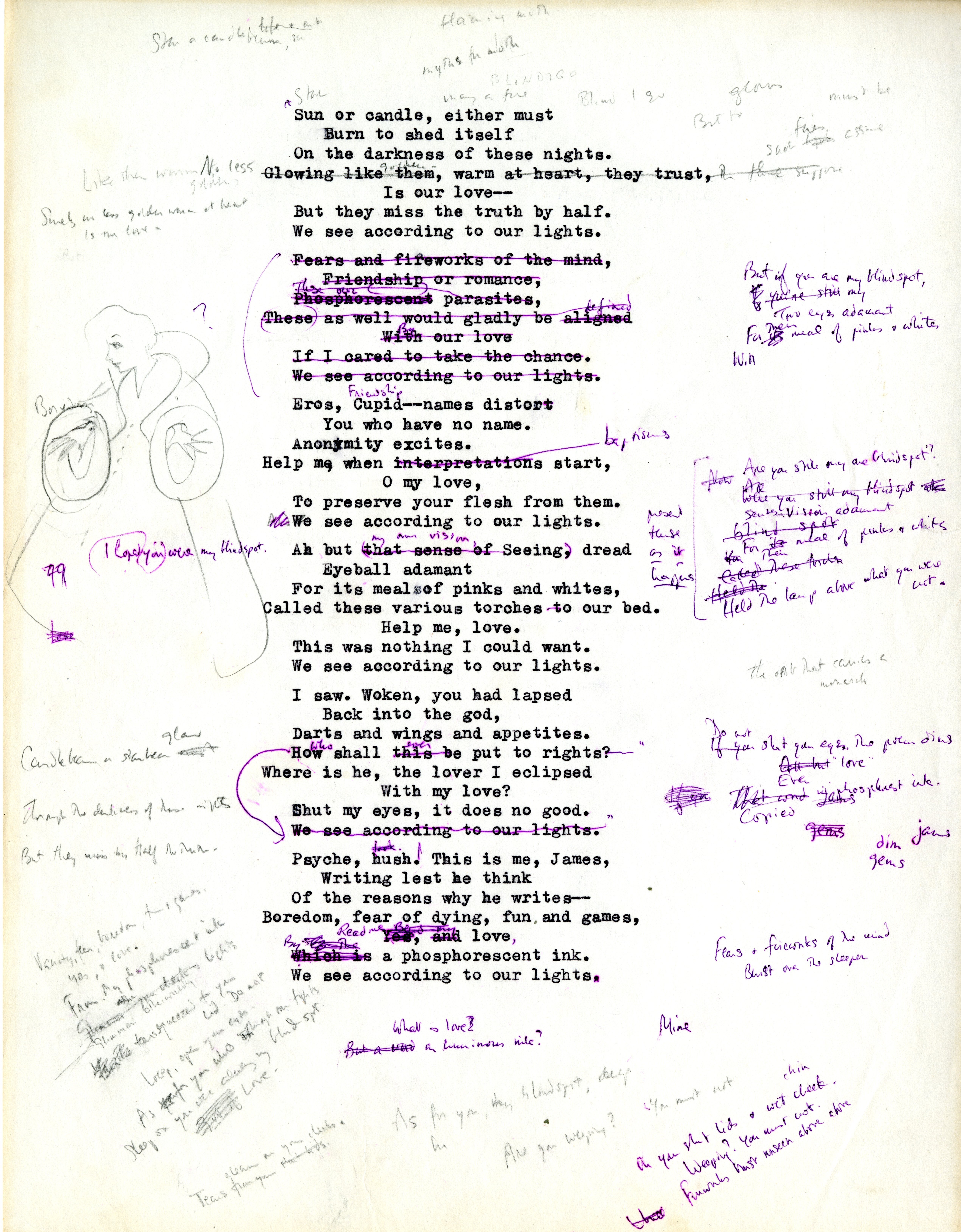 - This typescript draft page (one among 265 draft pages) centers on James Merrill comforting Psyche (and himself) over her (and his) realization of the limitations of love and self-knowledge. "From the Cupola" was published in Nights and Days. See also February 18, 1965 note to Irma Brandeis.