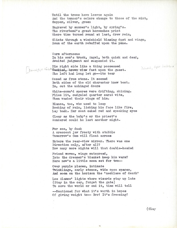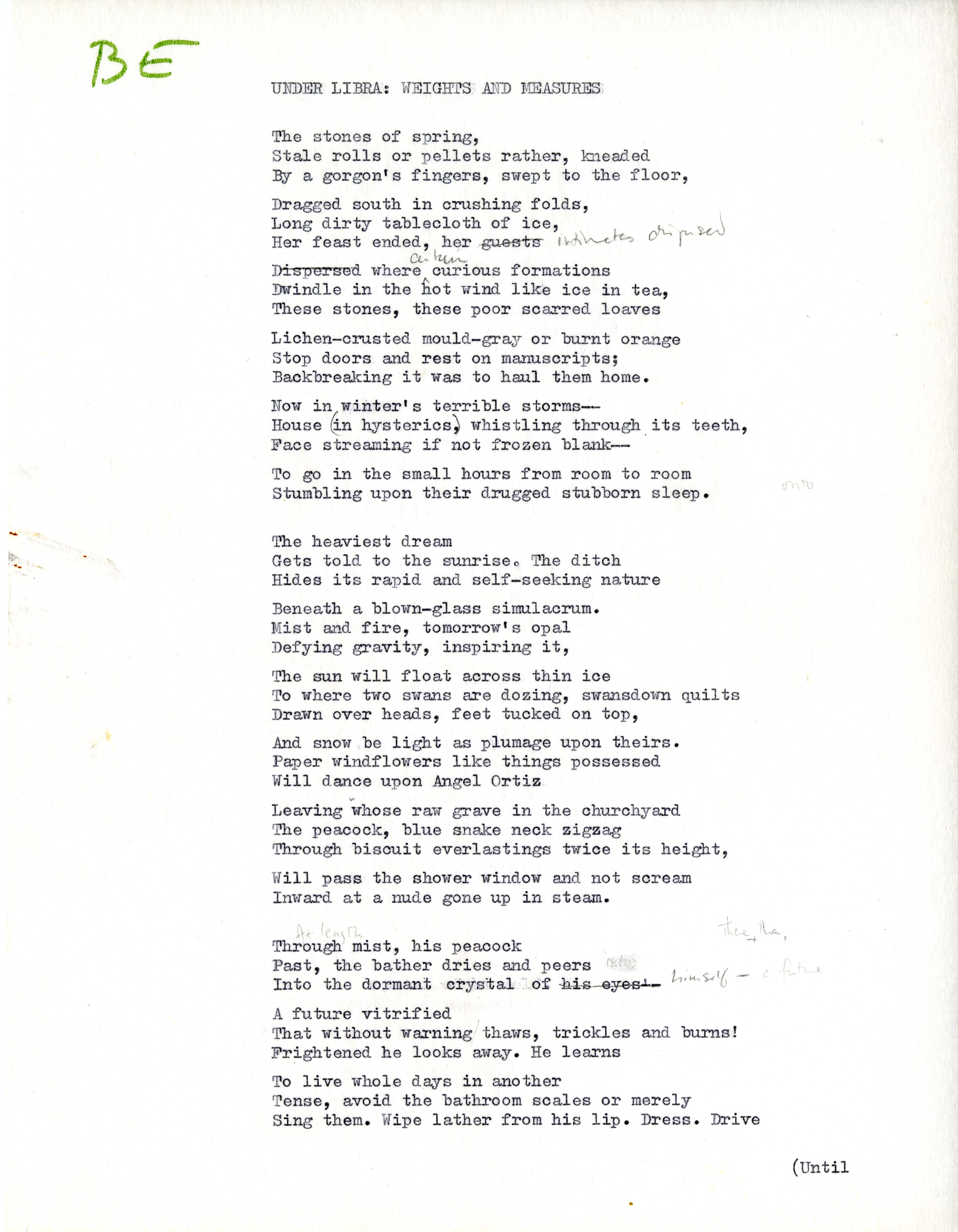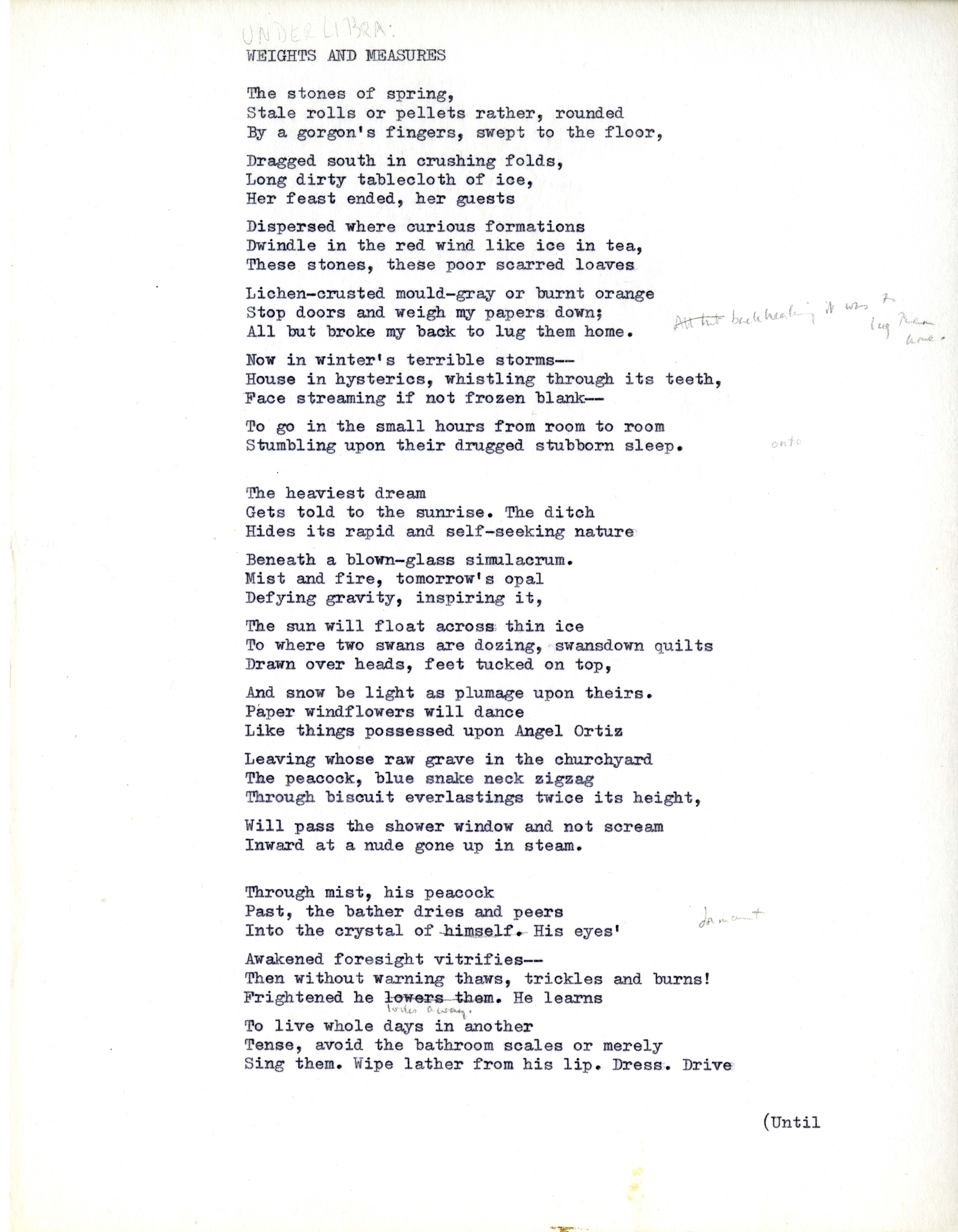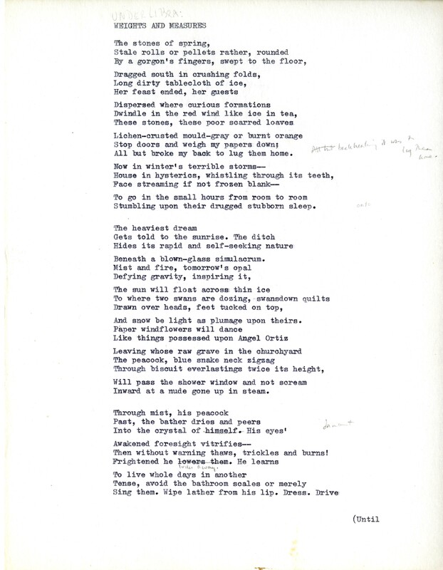 - "Under Libra: Weights and Measures," published in Braving the Elements, was dedicated to David McIntosh. Included here are two corrected typescript drafts of the poem. Through this seemingly impersonal poem Merrill realized, with the help of his therapist, that his life and art are equally present and giving each other meaning.