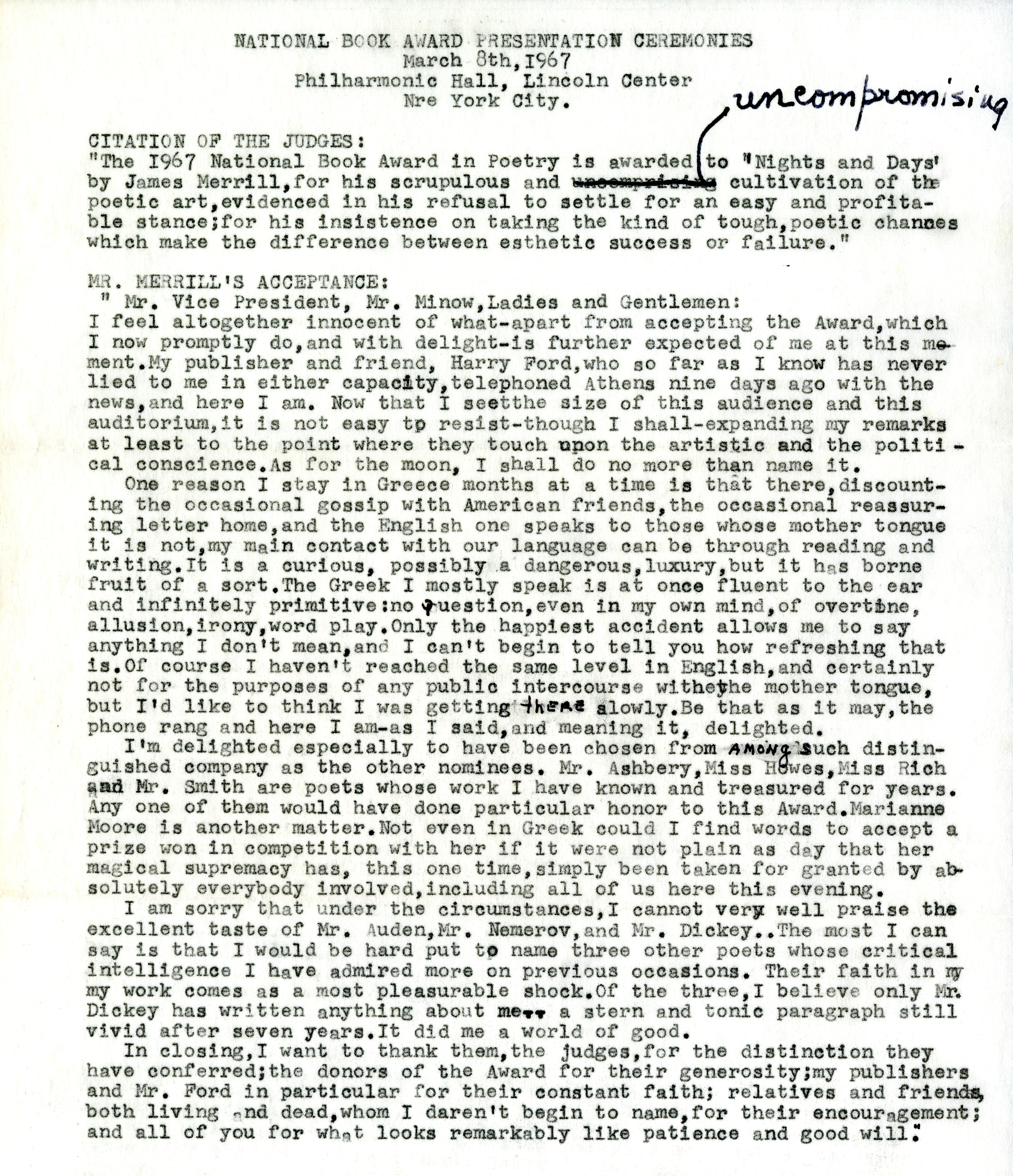 Merrill, James. 1967. “National Book Award Acceptance Speech”. Series_IV_Manuscripts, James Merrill: Life and Archive, accessed February 11, 2026, https://digitalexhibits.library.wustl.edu/s/james-merrill-life-and-archive/item/38528