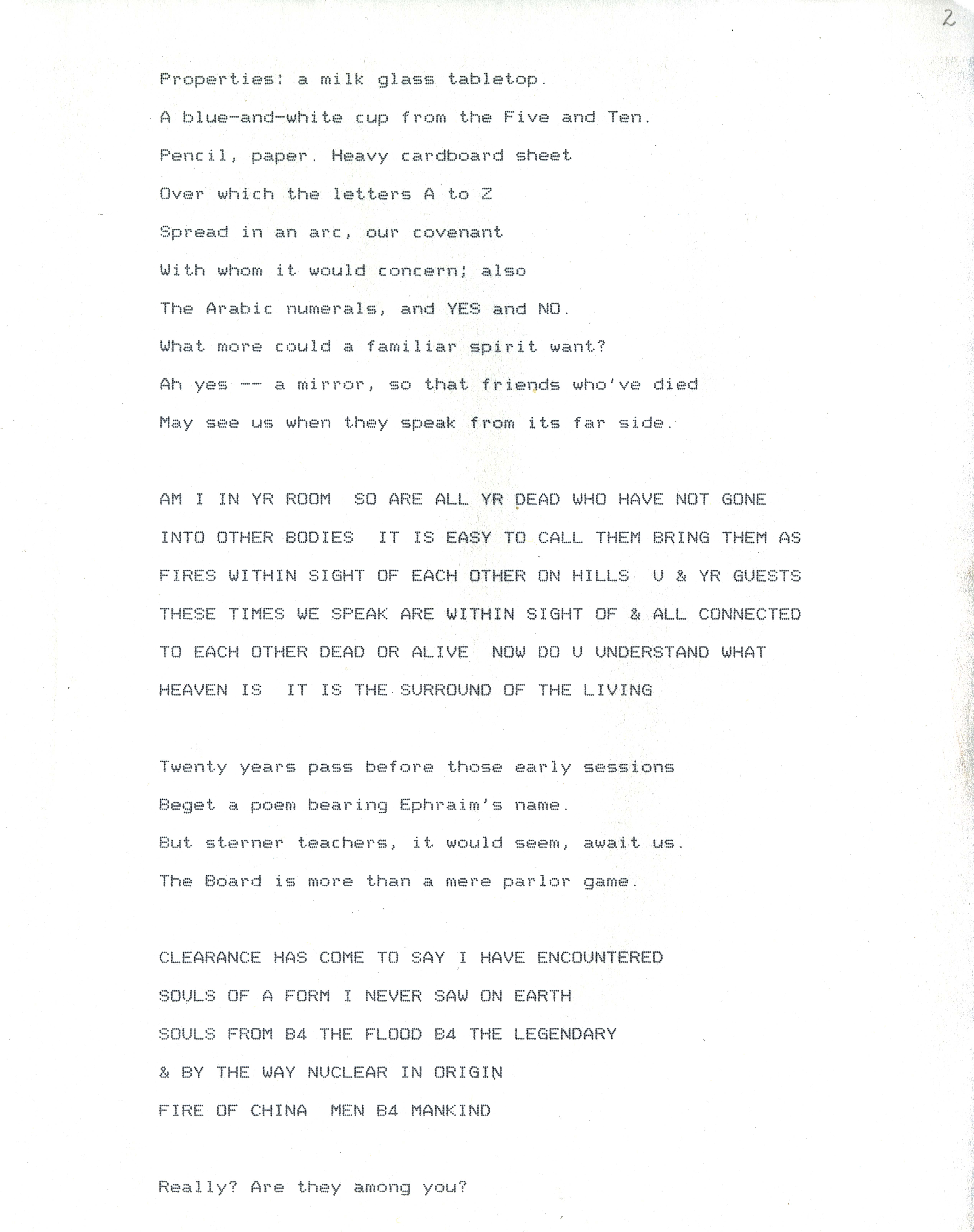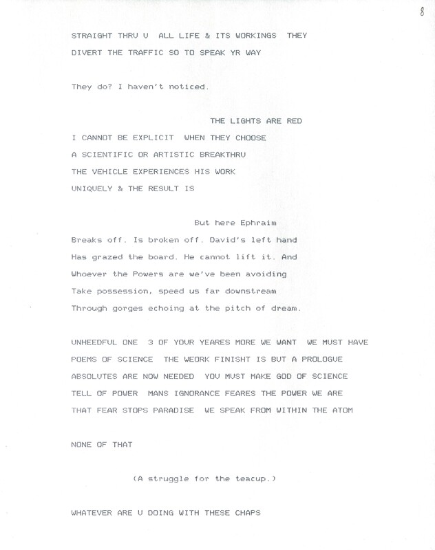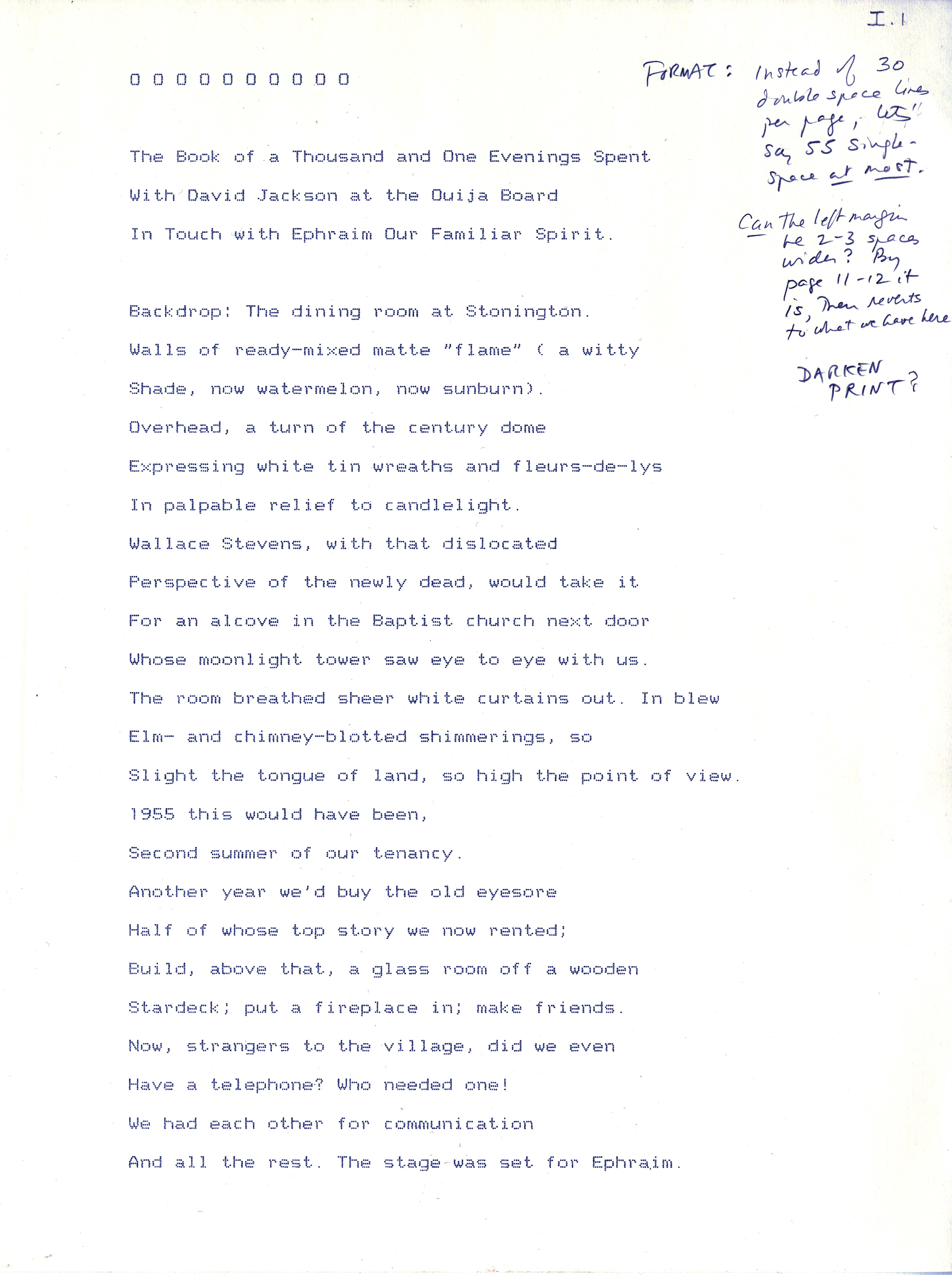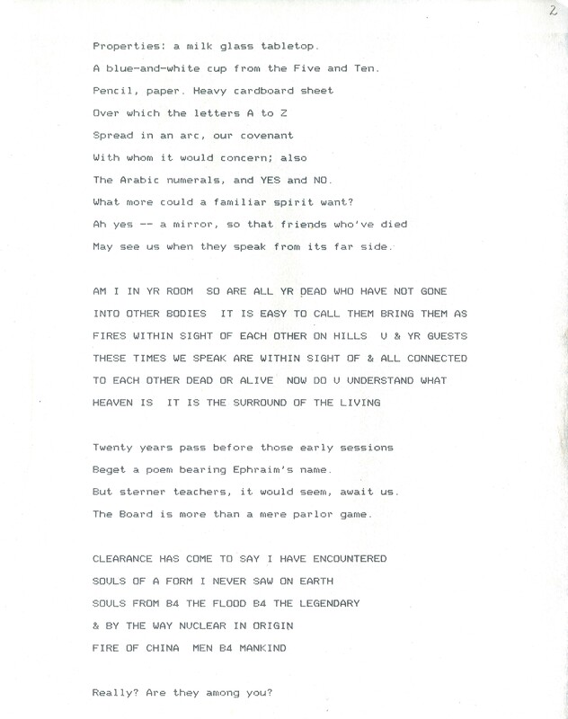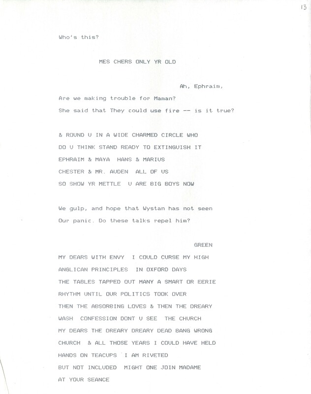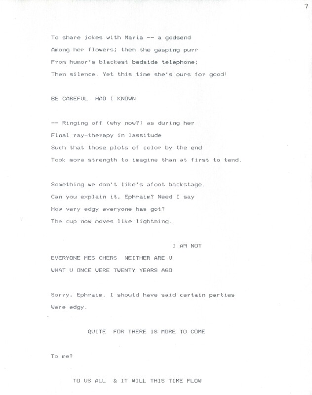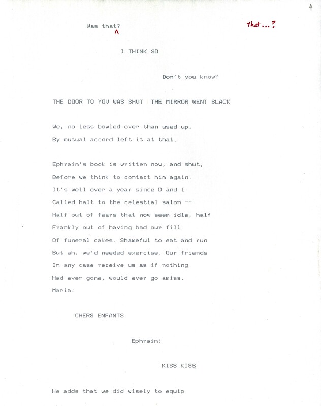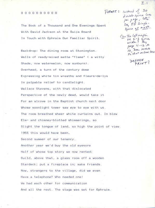 - Fifteen pages (out of sixty total) of a corrected typescript draft of An Evening at Sandover, Merrill's first stage adaptation of the Ouija board epic, performed as part of the revived Poets' Theatre at Hasty Pudding theater at Harvard. Peter Hooten worked with Merrill on both a stage and video adaptation, to very mixed results.