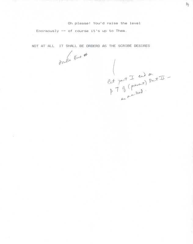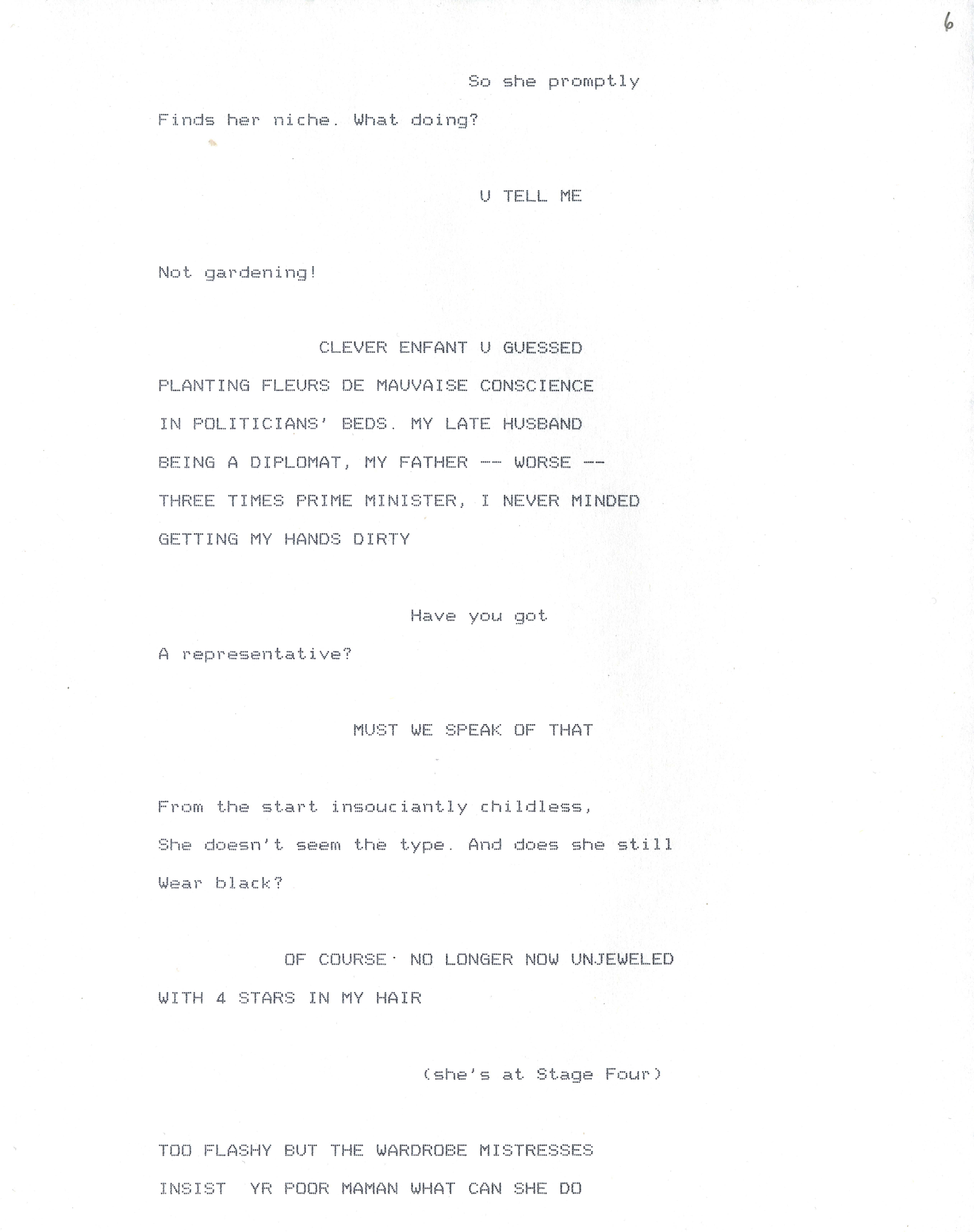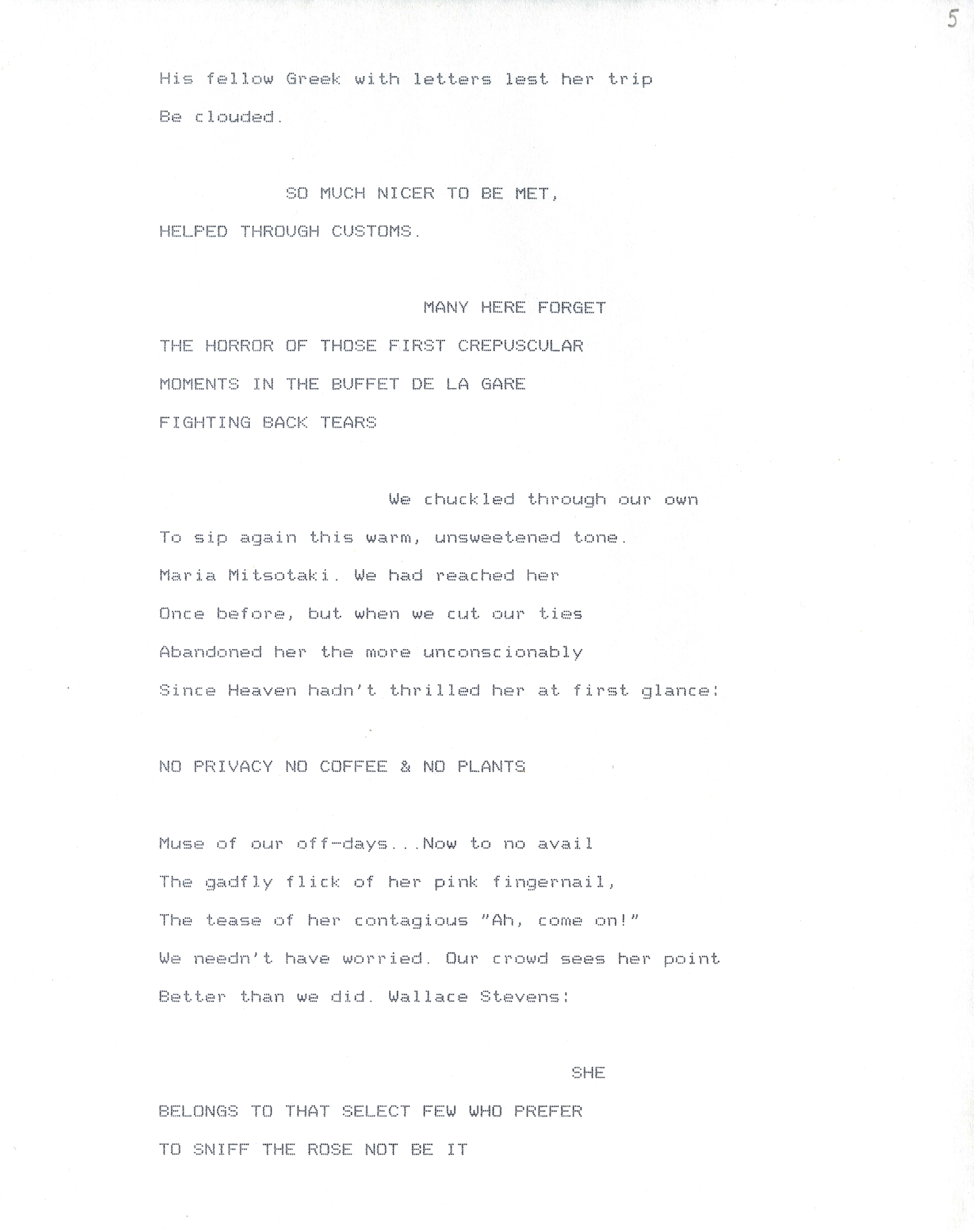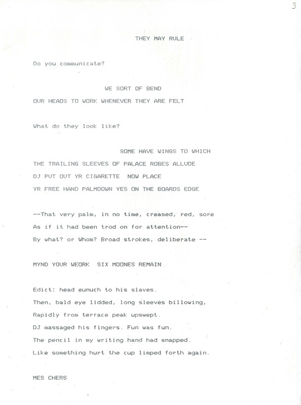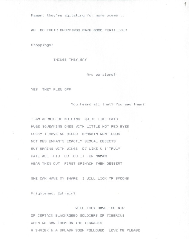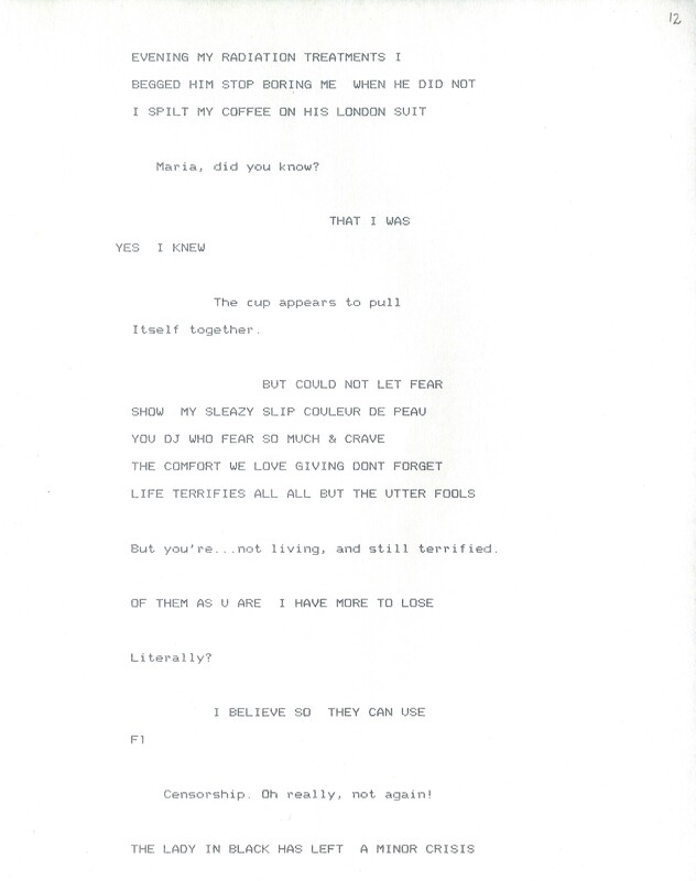 - Fifteen pages (out of sixty total) of a corrected typescript draft of An Evening at Sandover, Merrill's first stage adaptation of the Ouija board epic, performed as part of the revived Poets' Theatre at Hasty Pudding theater at Harvard. Peter Hooten worked with Merrill on both a stage and video adaptation, to very mixed results.