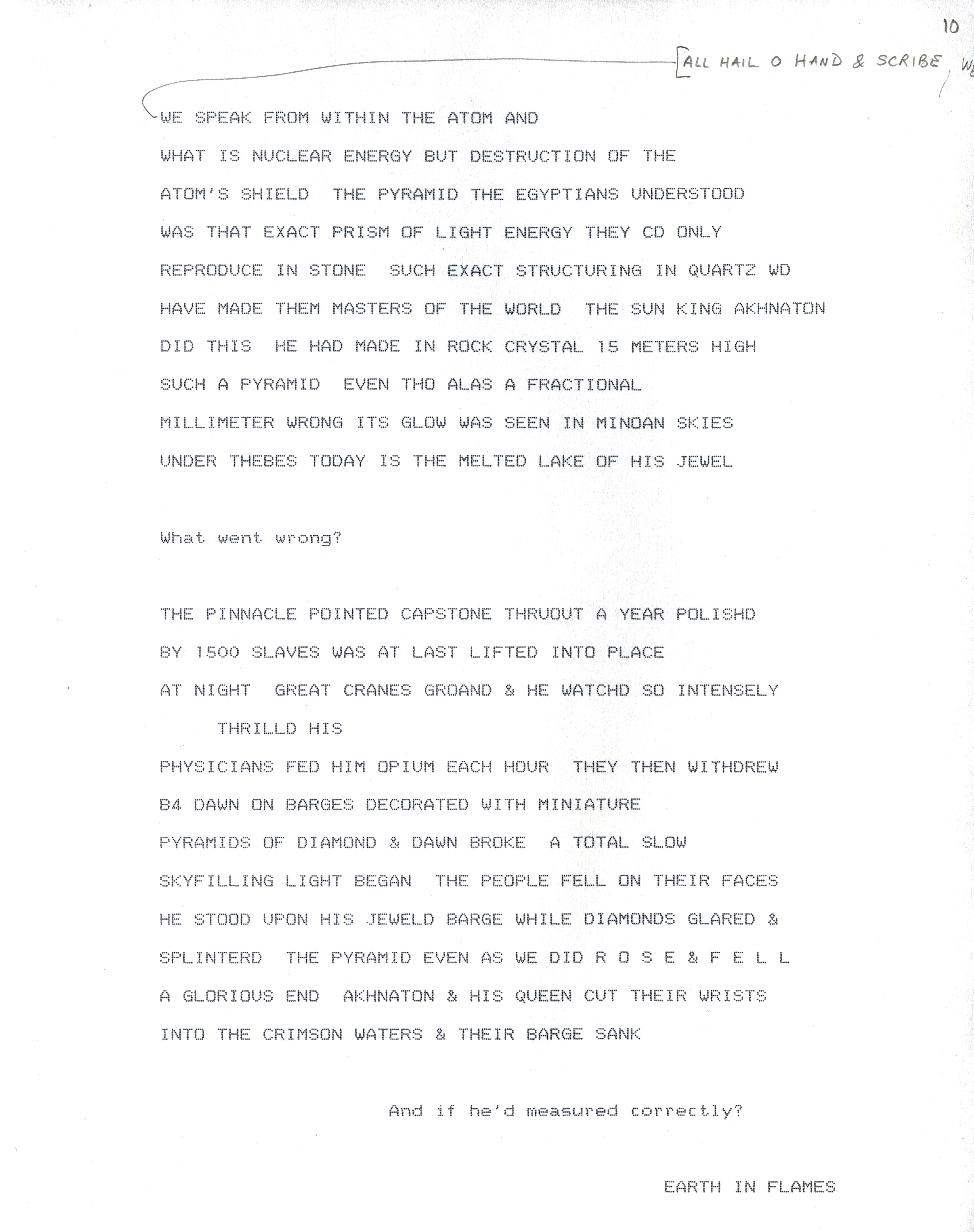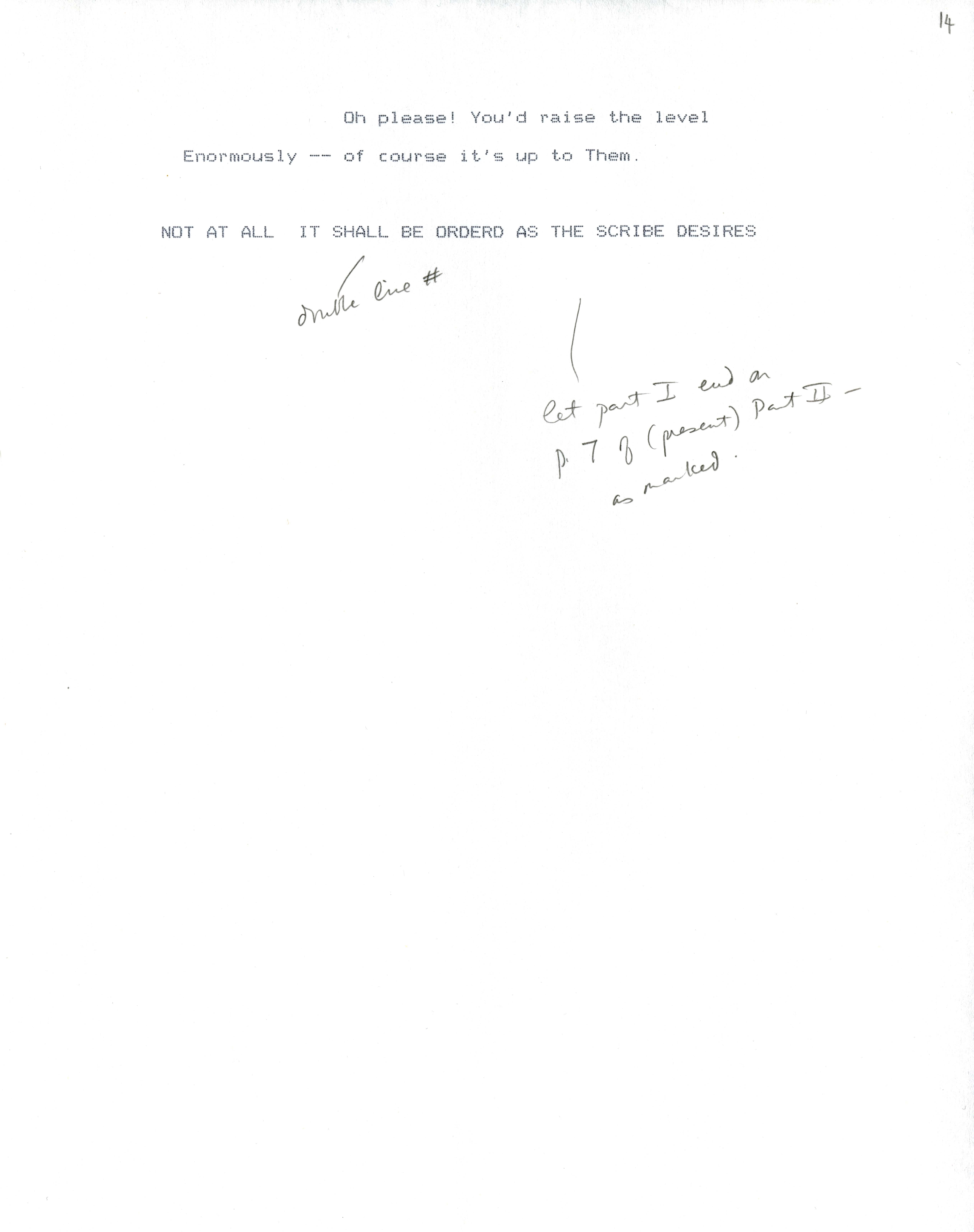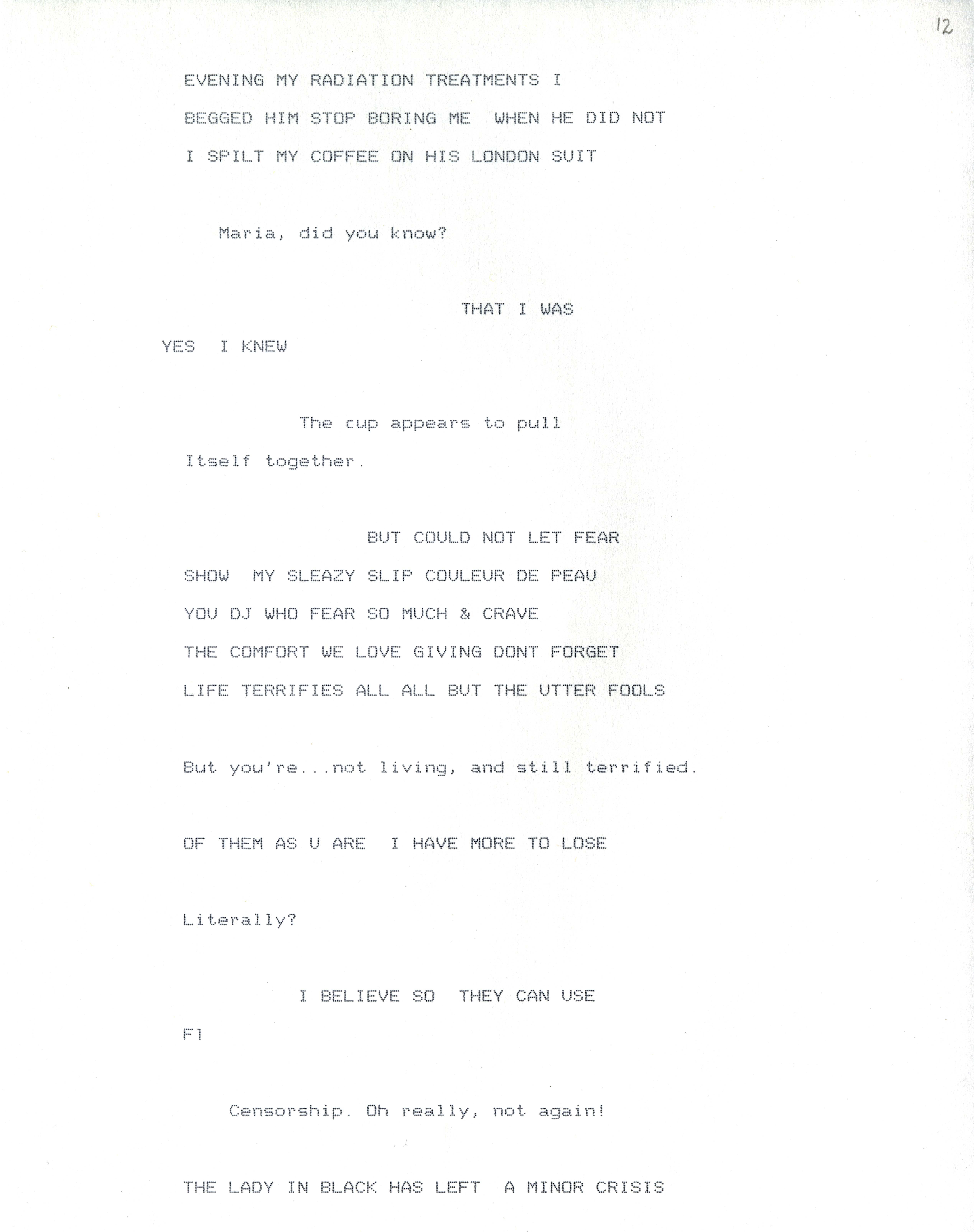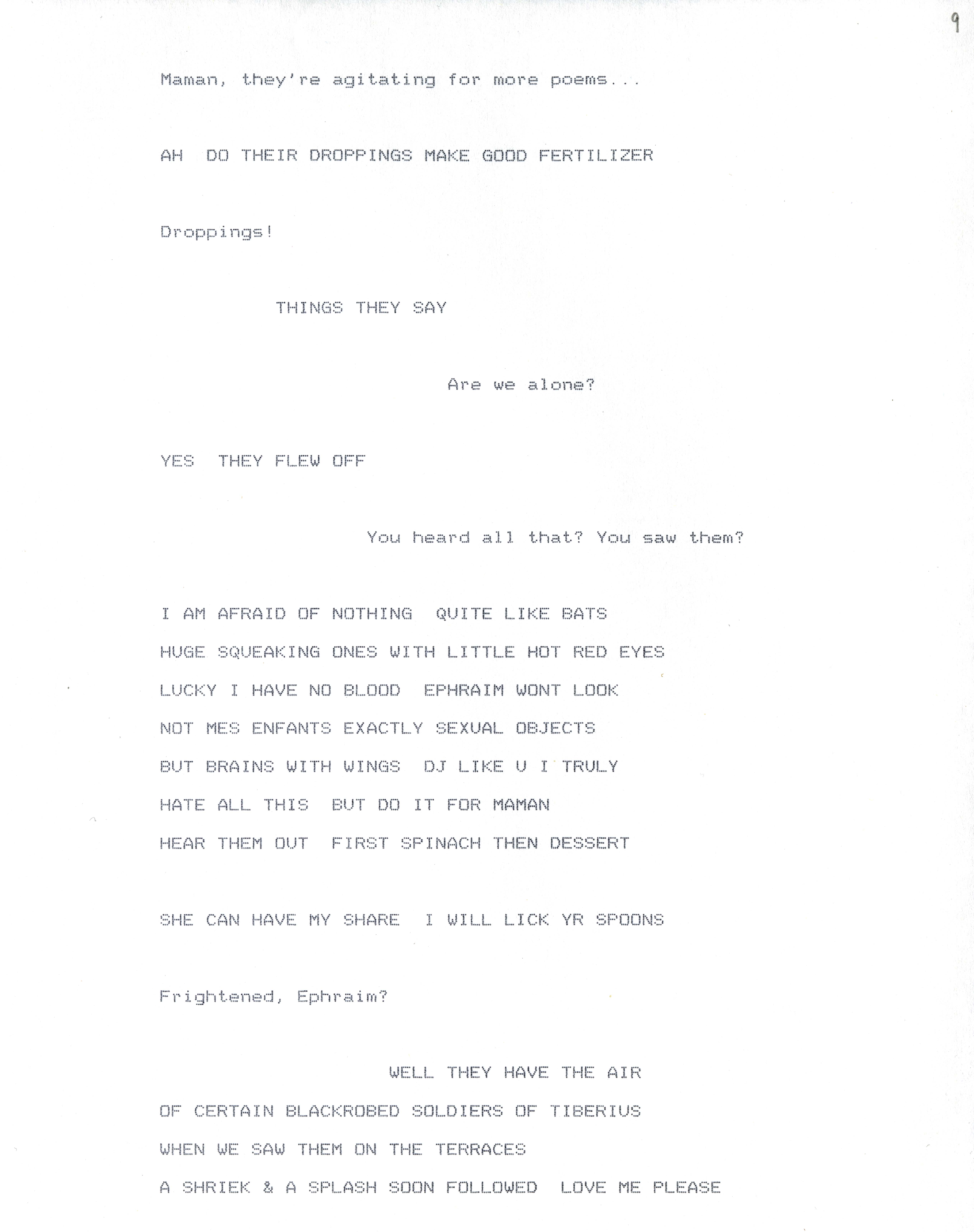 - Fifteen pages (out of sixty total) of a corrected typescript draft of An Evening at Sandover, Merrill's first stage adaptation of the Ouija board epic, performed as part of the revived Poets' Theatre at Hasty Pudding theater at Harvard. Peter Hooten worked with Merrill on both a stage and video adaptation, to very mixed results.