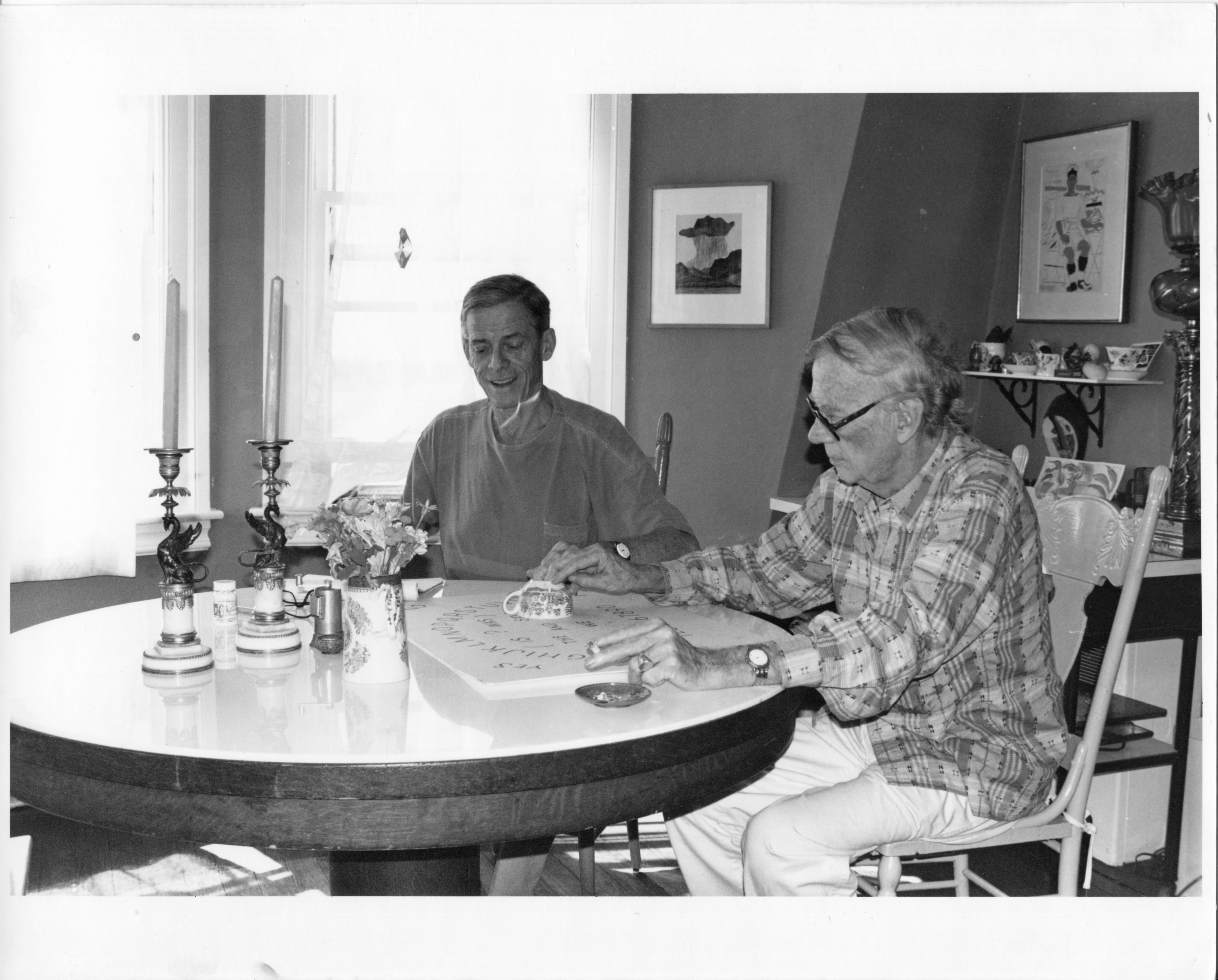 - James Merrill and David Jackson at Ouija board in Stonington. The photo was taken by Harry Pemberton, who took a roll of the mediums in action.