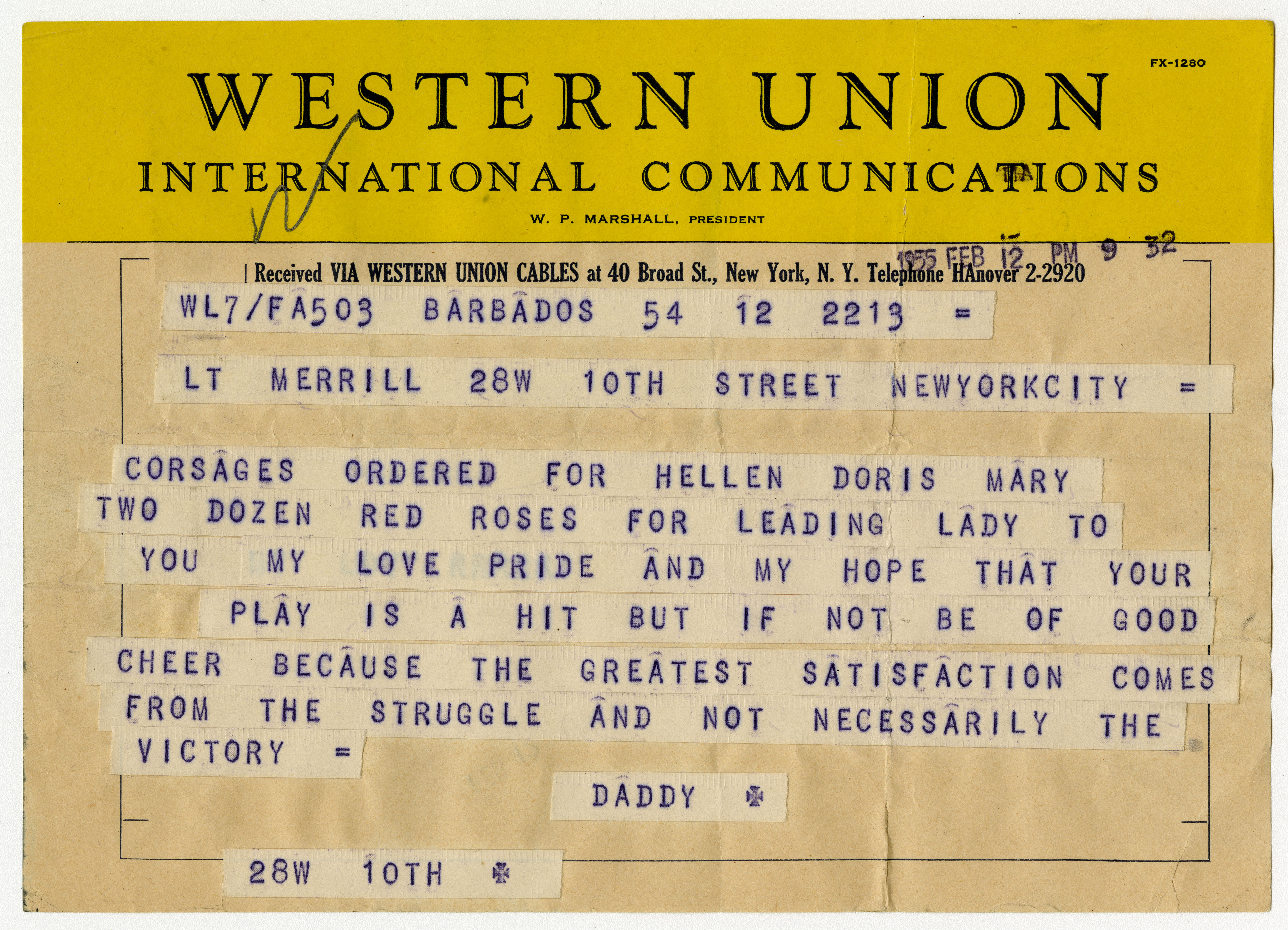 - Telegram from Charles Merrill to James Merrill, taken from "The Immortal Husband" scrapbook in the James Merrill Papers. The telegram includes advice on how to take failure if the play is not "a hit."