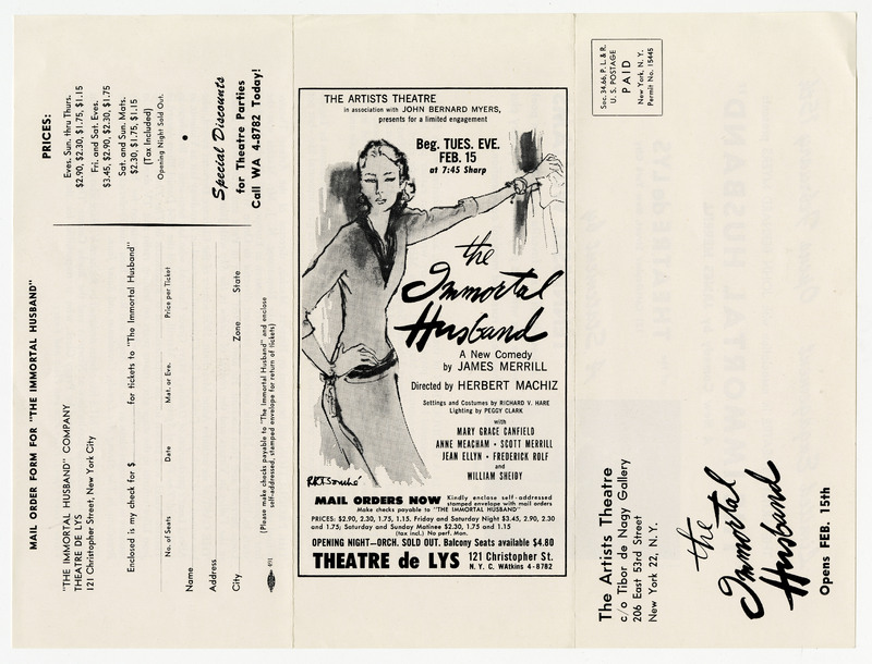 - A mailer advertising the opening of The Immortal Husband, including an order form and a laudatory statement by Tennessee Williams.