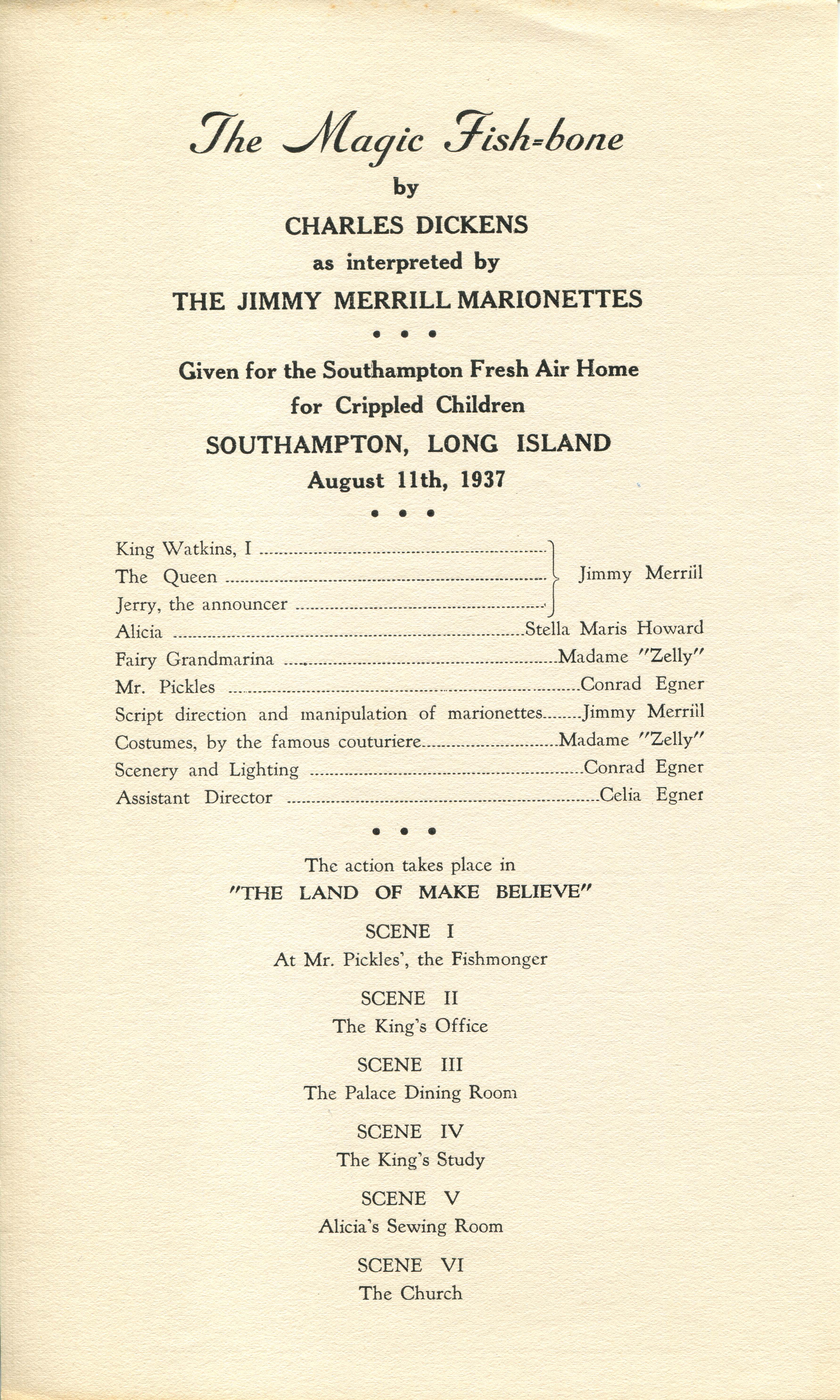 - Program for the "Jimmy Merrill Marionettes" during which he performed "The Magic Fish-bone" in an ambitious production of the Charles Dickens children's story, which Merrill staged at age 11. Puppets always fascinated Merrill, and he created his own puppet theater at the Orchard.