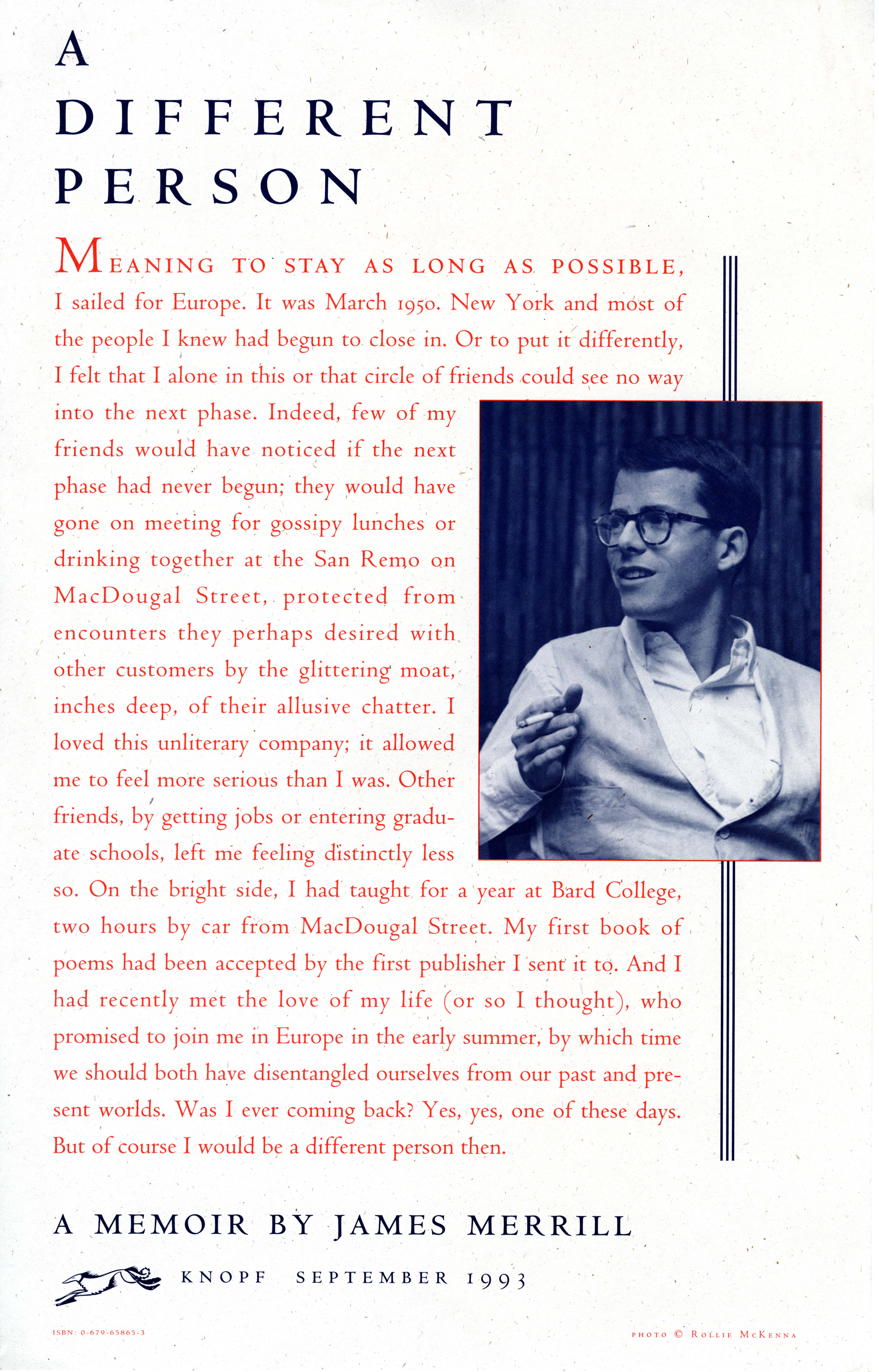 - Promotional poster for James Merrill's memoir A Different Person. Merrill continued revising the memoir into the galleys stage and sent to friends chapters that included them, making changes accordingly.