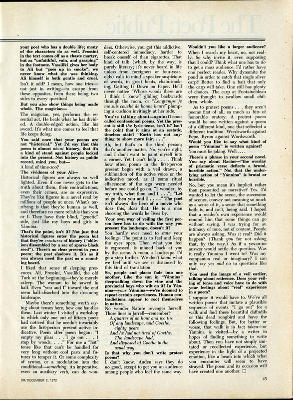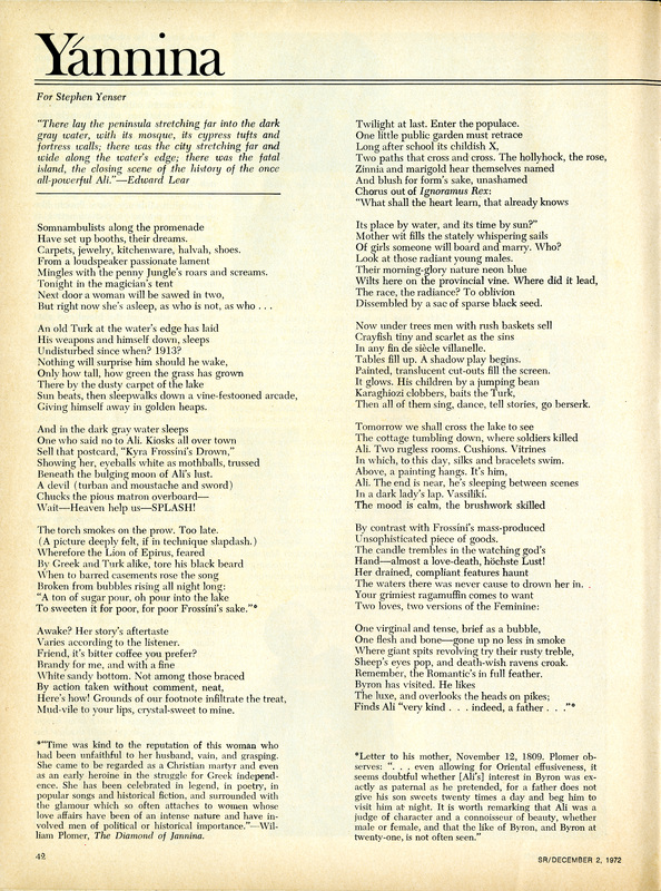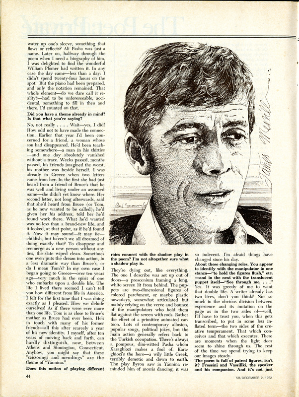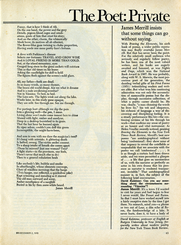 - "The Poet: Private" in Saturday Review, featuring the poem "Yannina" and an interview with literary critic and good friend, David Kalstone. They discuss "Yannina," a poem about coming to terms with the past, and dedicated to Stephen Yenser. In the interview Merrill reveals he would rather cultivate an ideal reader than appeal to a mass audience.