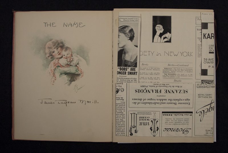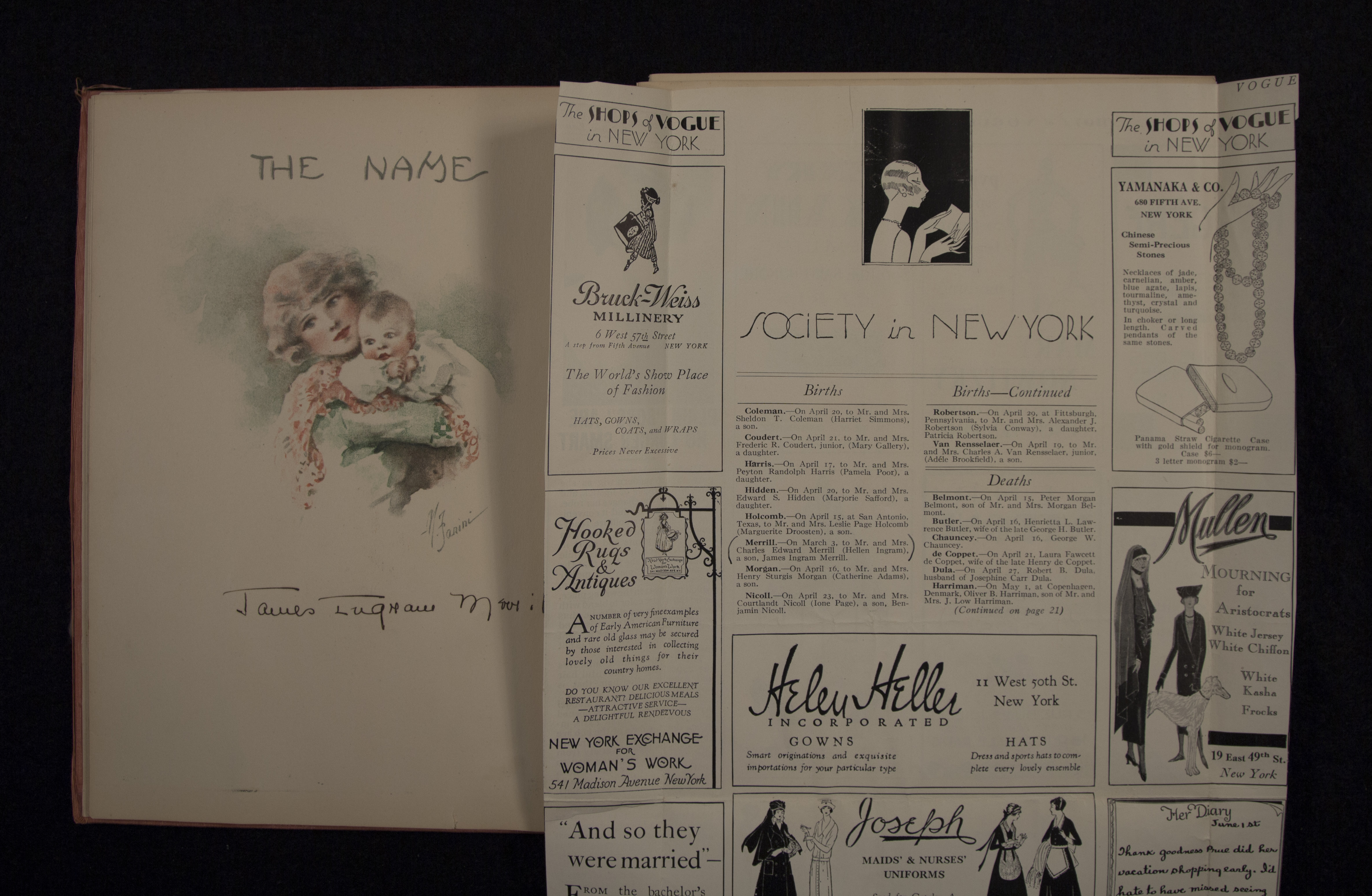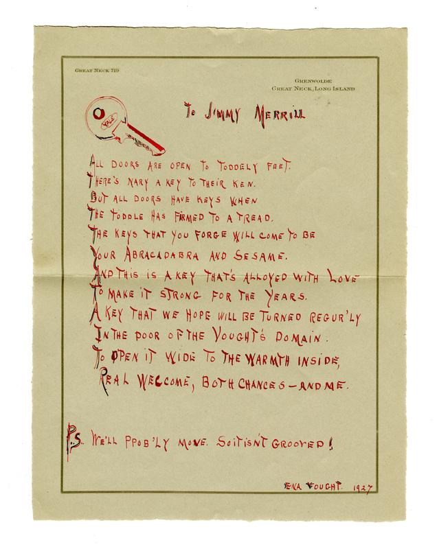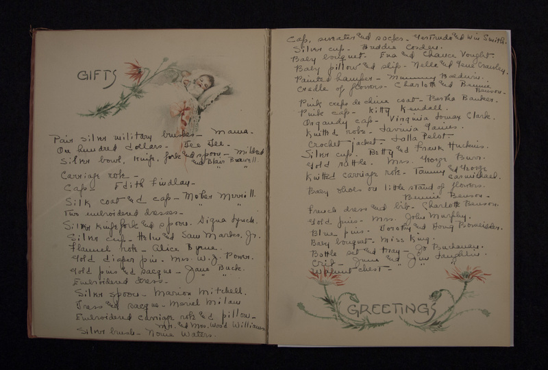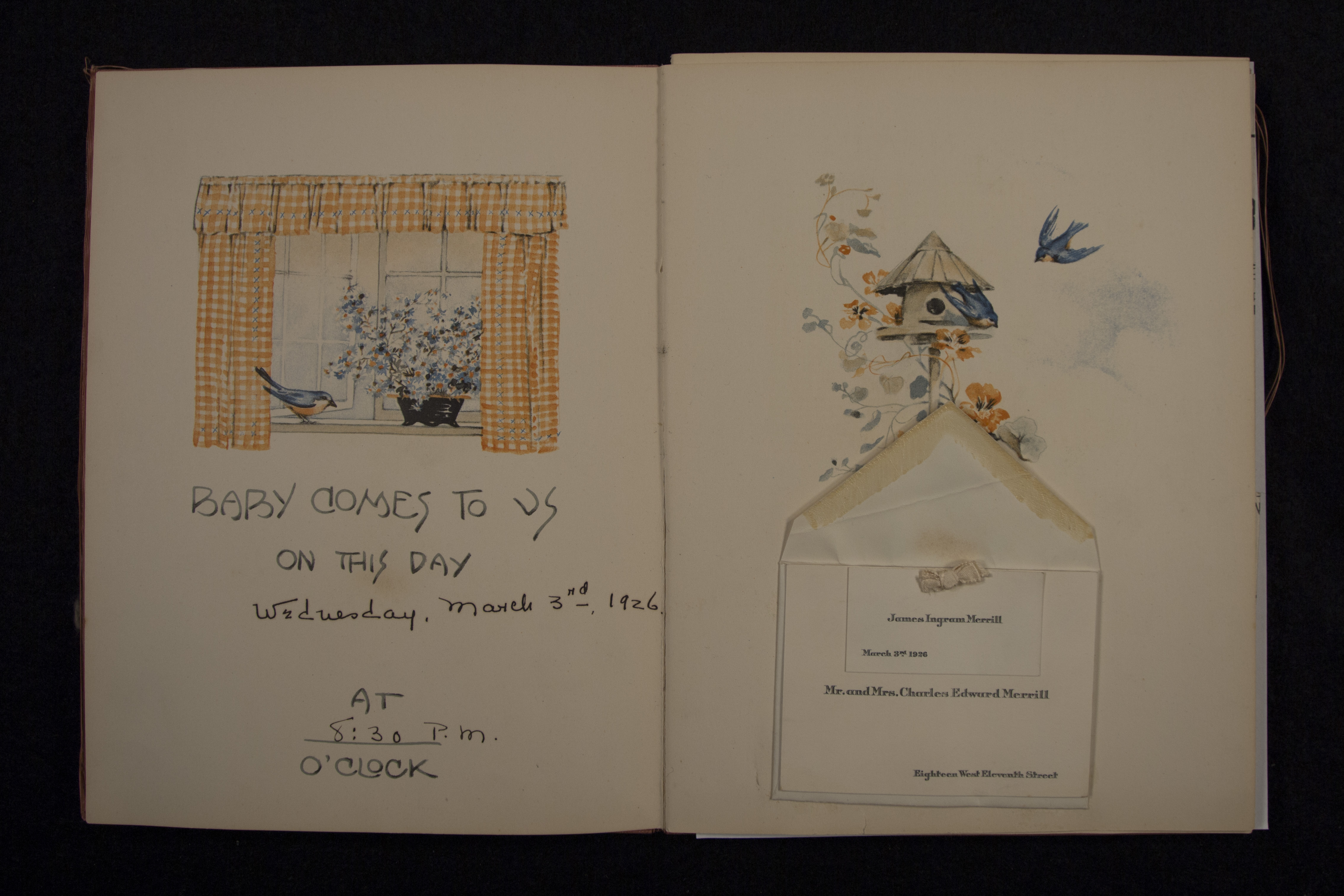 - James Merrill's baby book with birth announcement. Discussed in Merrill's memoir, A Different Person, the baby book contains the list of gifts Merrill received at birth, including stock shares, silver spoons, gold diaper pins, etc.