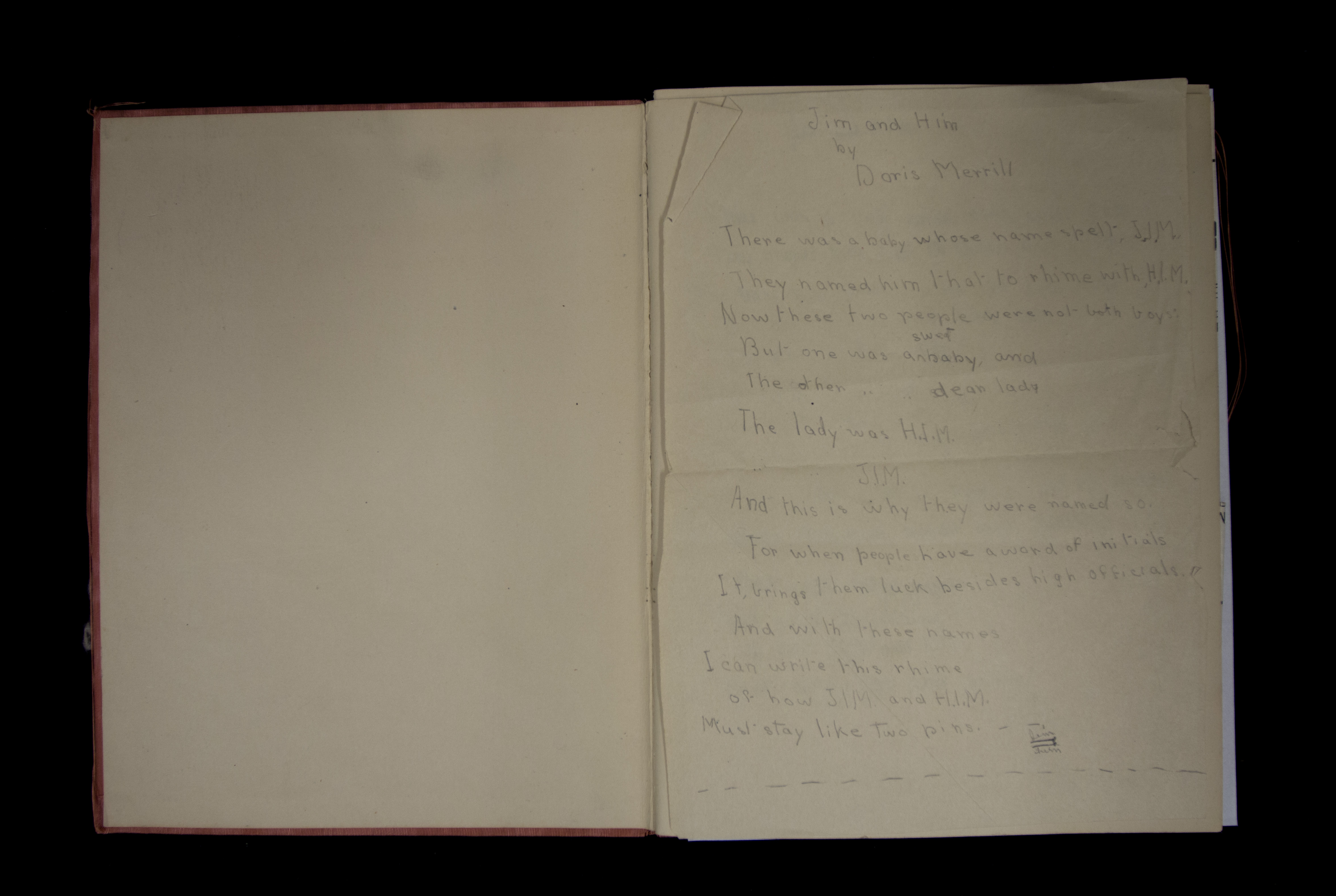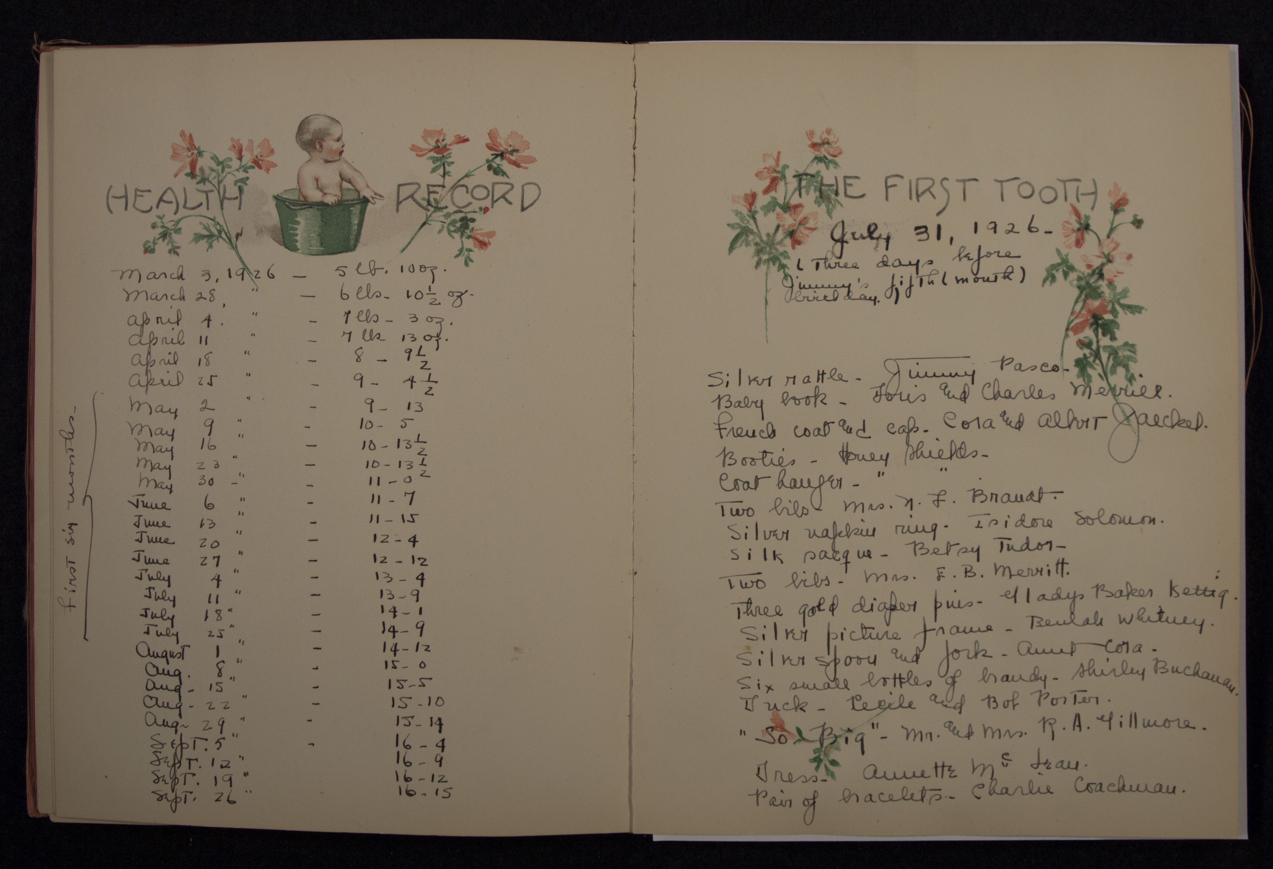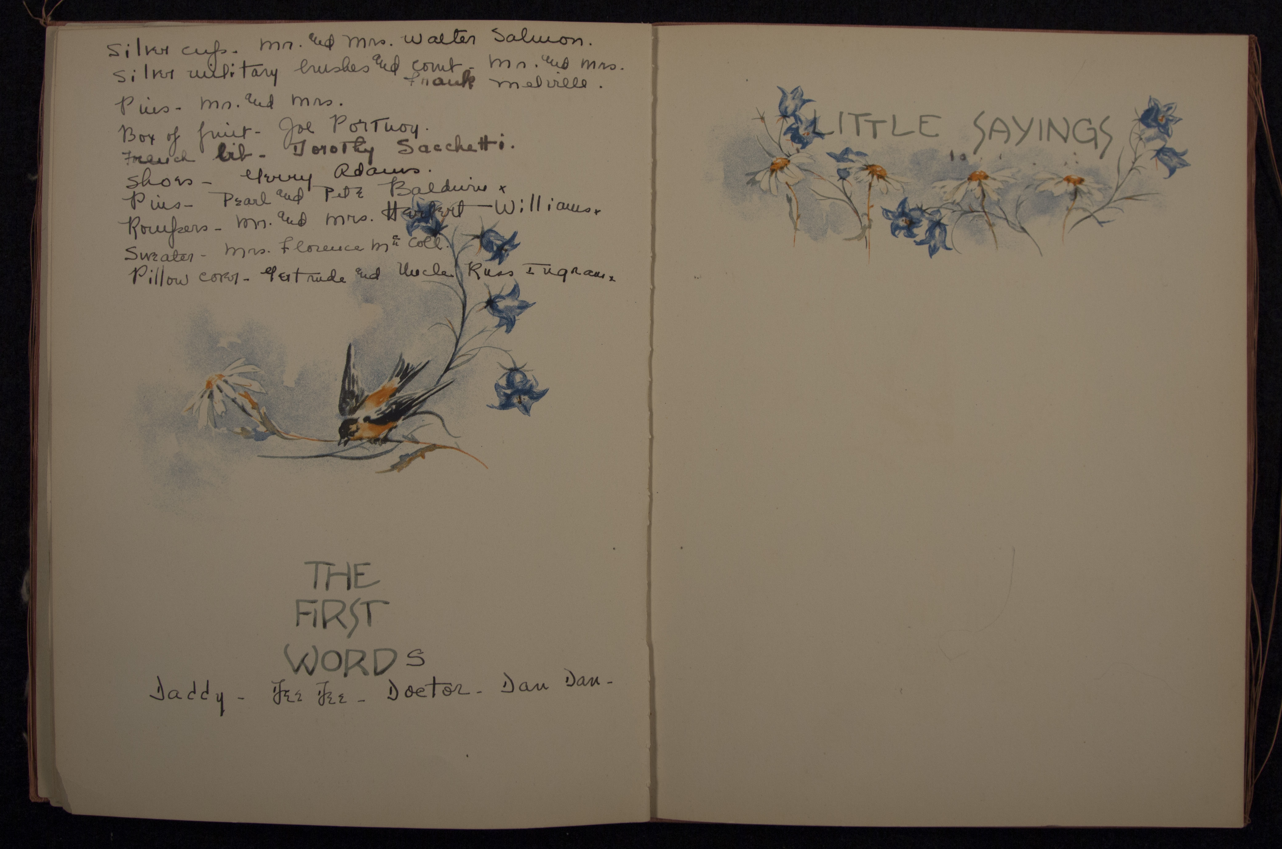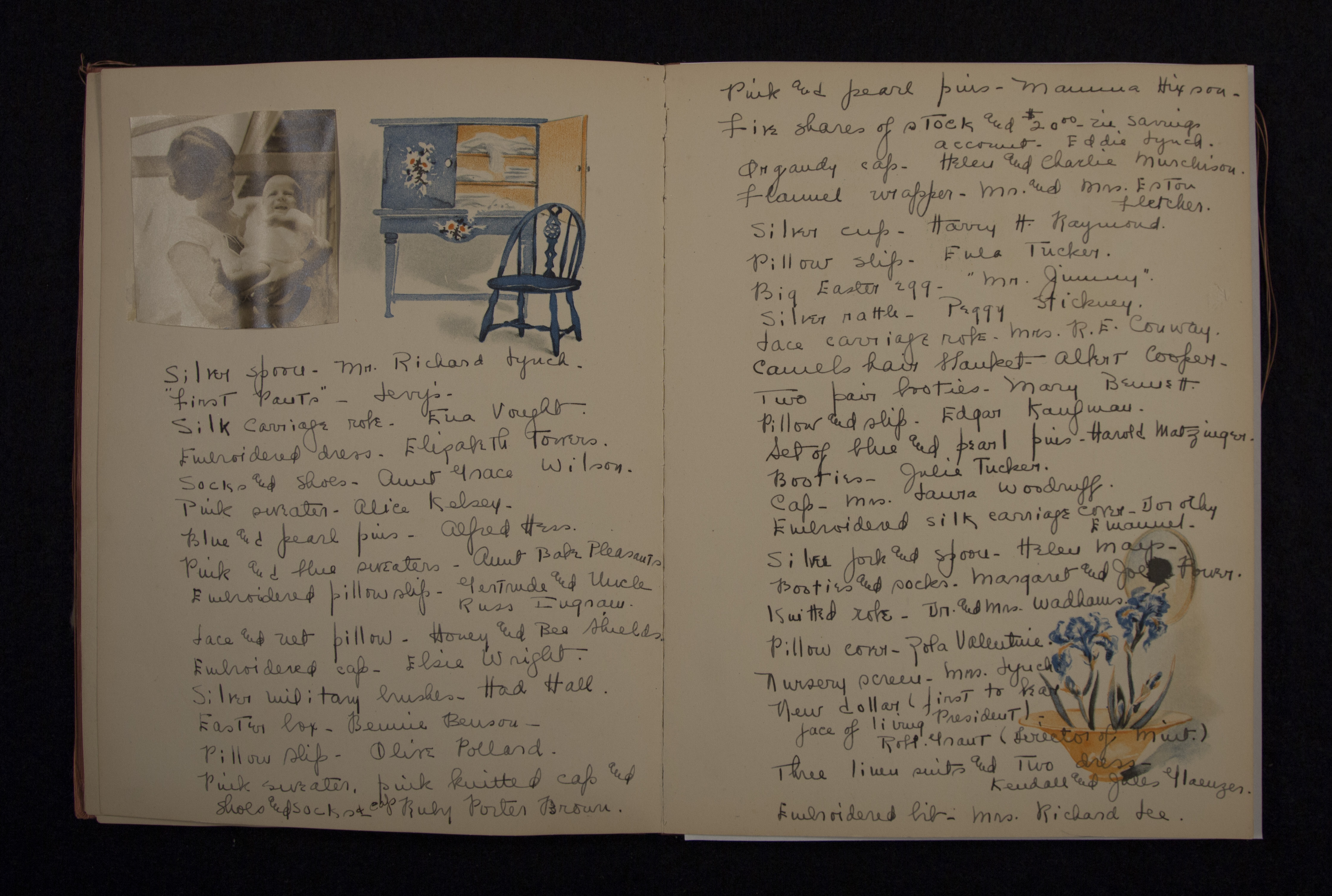 - James Merrill's baby book with birth announcement. Discussed in Merrill's memoir, A Different Person, the baby book contains the list of gifts Merrill received at birth, including stock shares, silver spoons, gold diaper pins, etc.