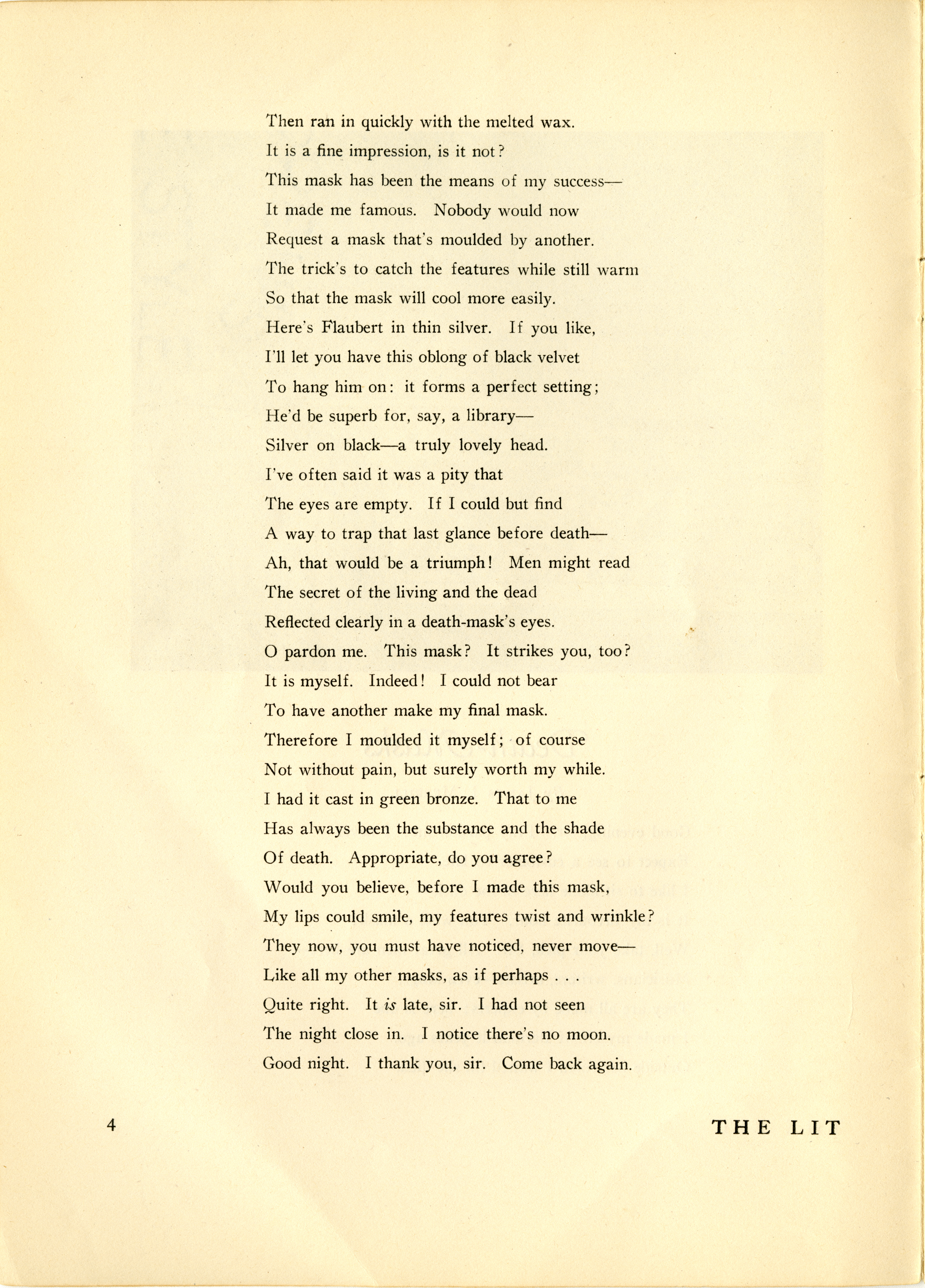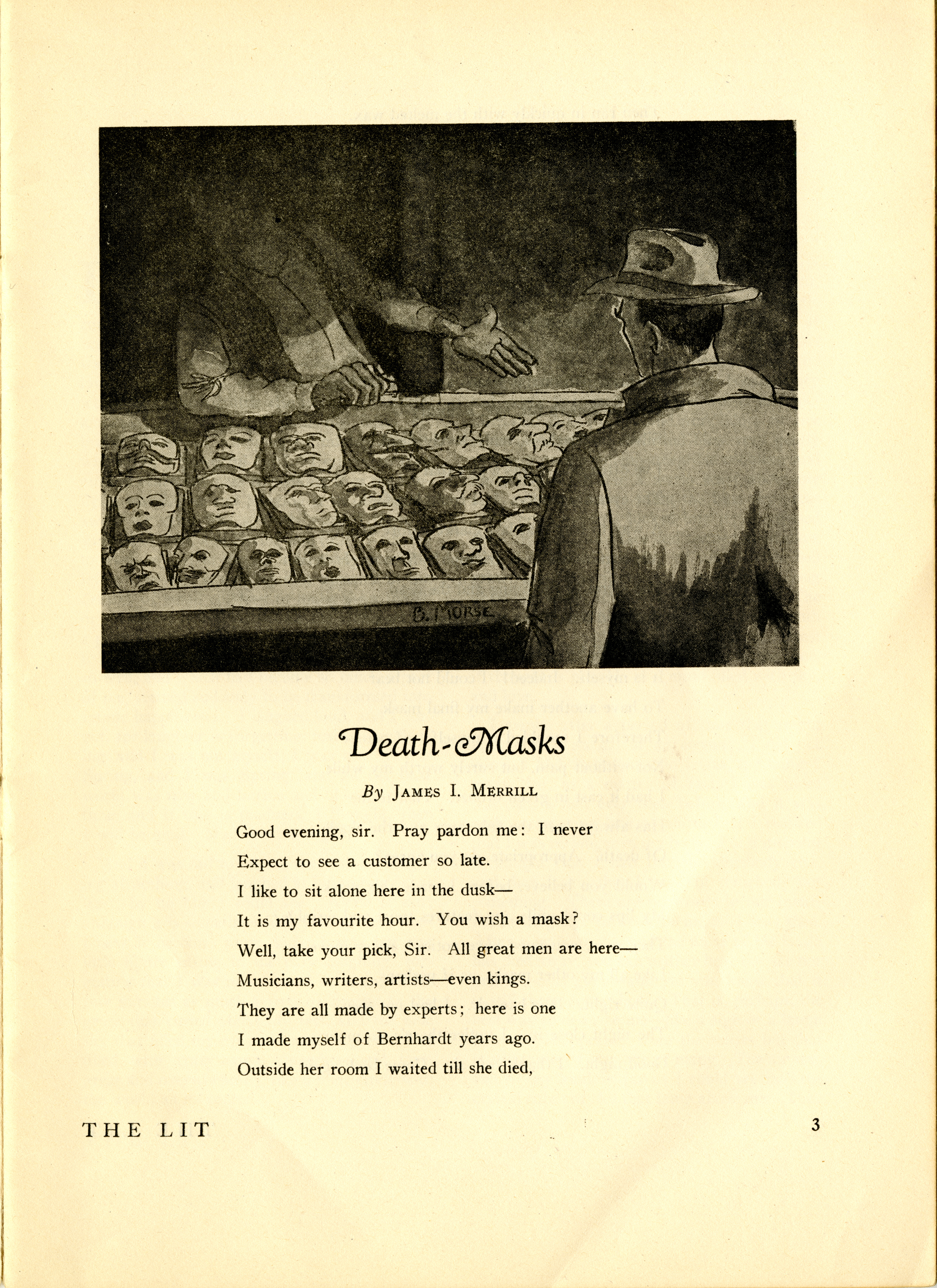 - James Merrill's poem "Death Masks" from an issue of the Lawrenceville publication The Lit. The poem is a dramatic monologue spoken by a man who sells death masks made from the faces of artists.