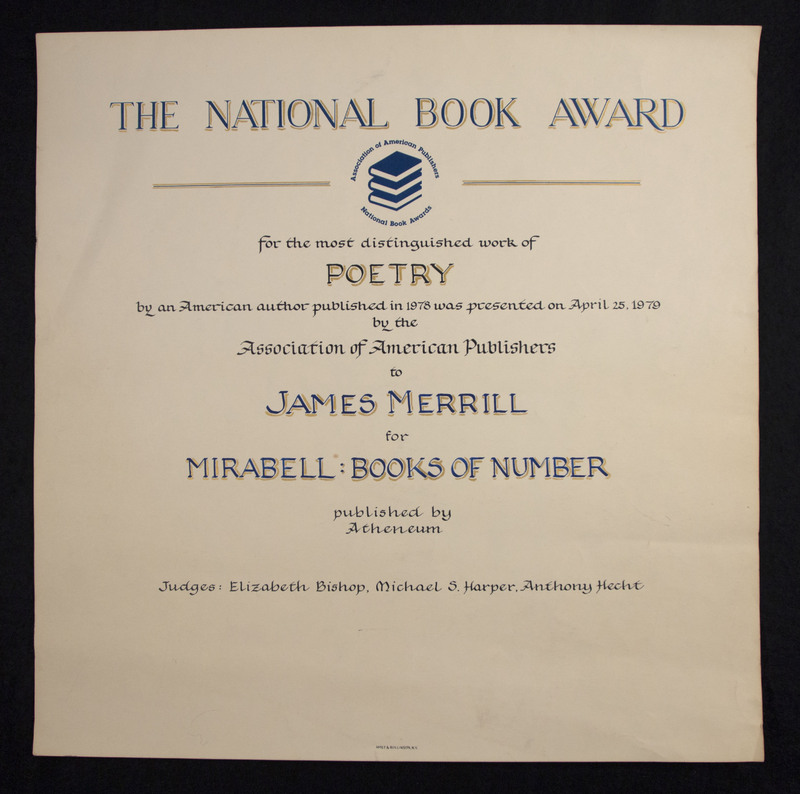 - James Merrill's National Book Award for Mirabell: Books of Number. It was Merrill's second National Book Award win in 12 years. Merrill gave the prize money to Hubbell Pierce, inventor of the bat wallpaper at 107 Water Street where many séances took place.