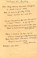 Looking at Mummy Merrill poem as transcribed by his mother. McClatchy published a facsimile of the poem in his article "The Inner Room," Raritan (Summer 1999), 19.1: 1-22. He wrote that "Because he was a devoted mother's only child or because he was the pampered son of a wealthy man, every scrap of his childhood seems to have been preserved--drawings, report cards, letters, and cards. And among all this I found a little verse, copied out in his mother's hand, and dated 29 October 1932. Its author was six years old" (12). © Literary Estate of James Merrill at Washington University Libraries. -