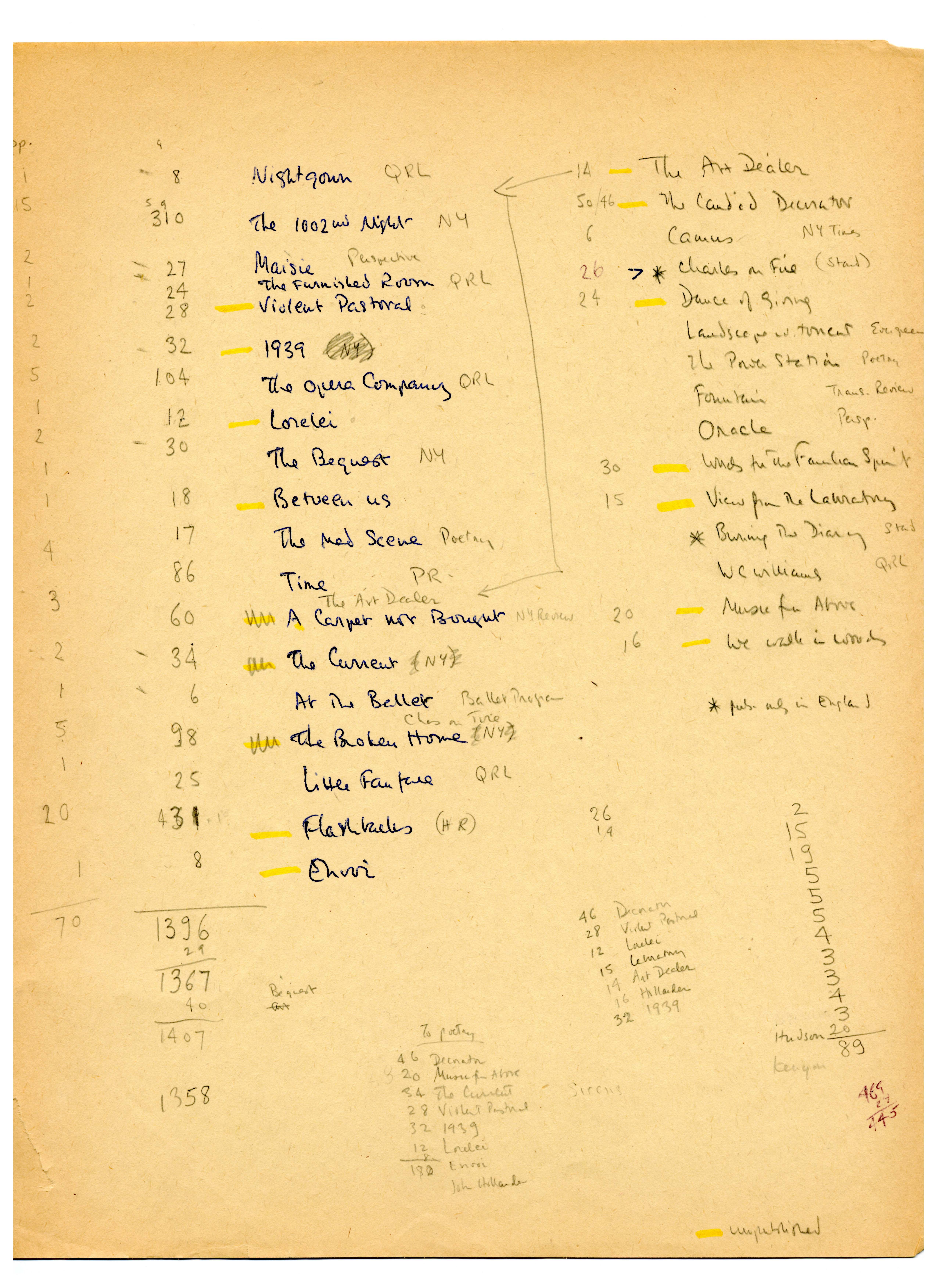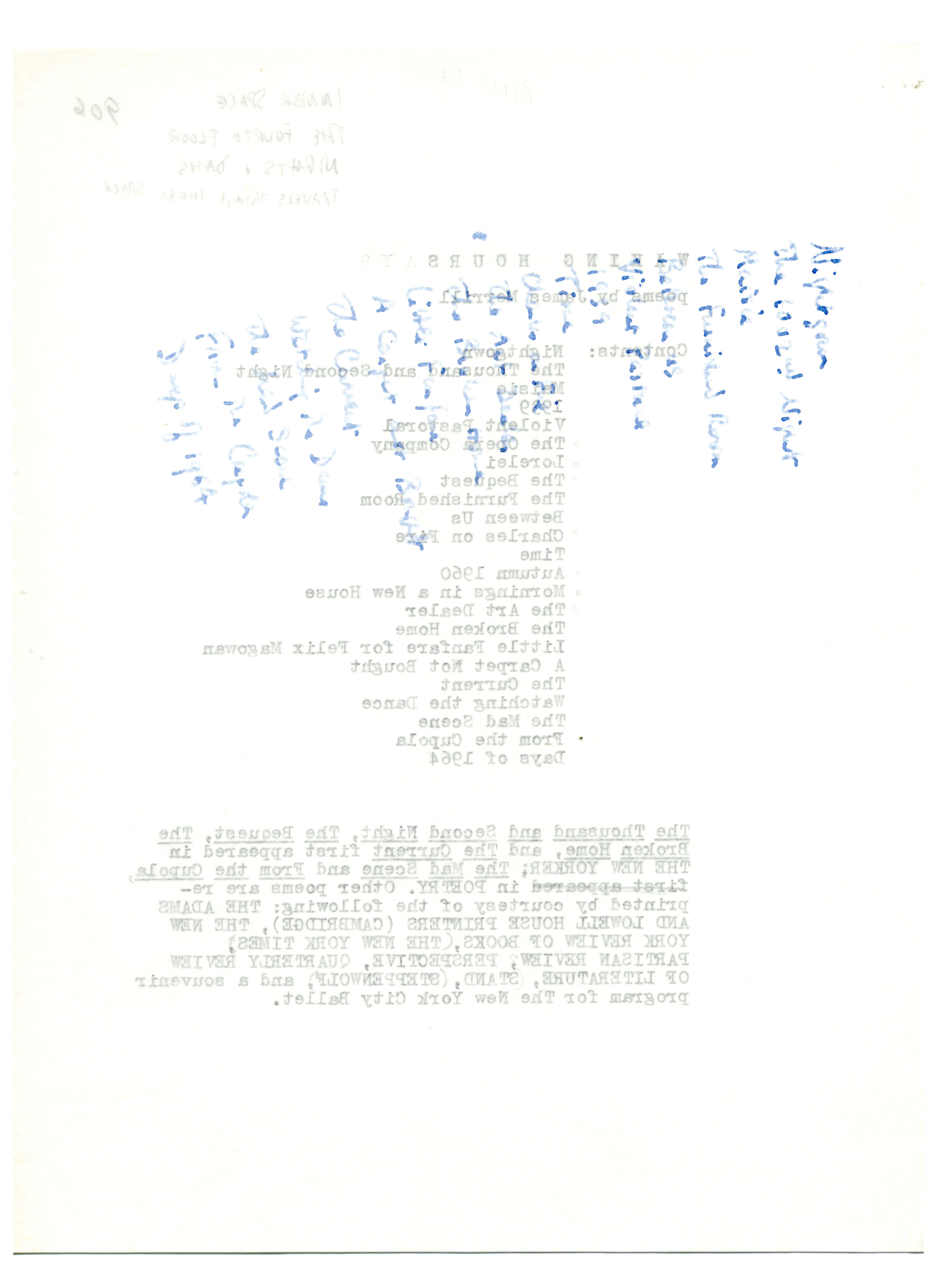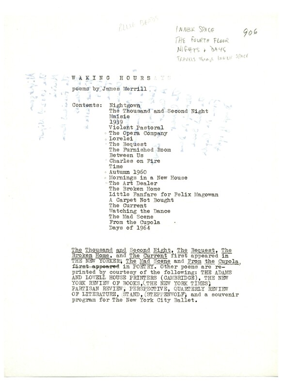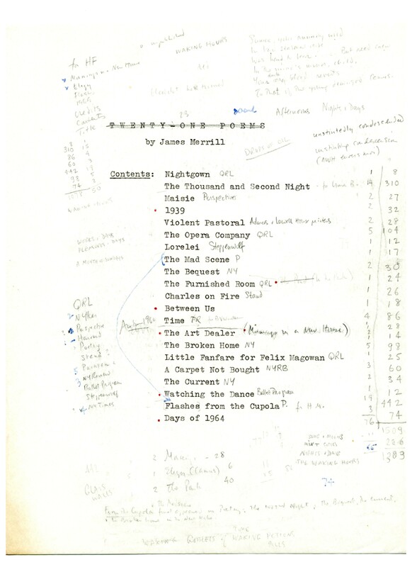 - Autograph and typescript draft of table of contents for Nights and Days by James Merrill.