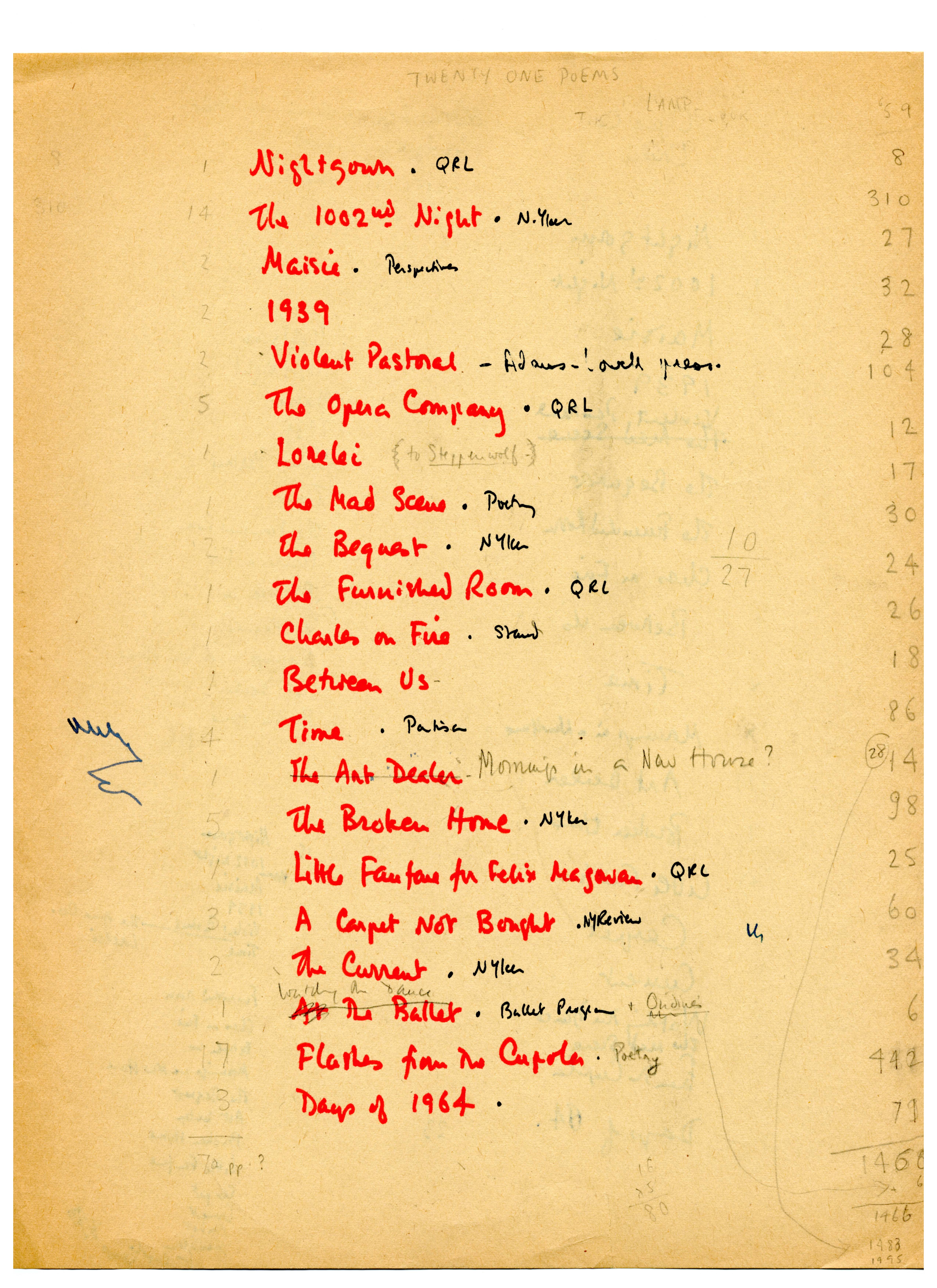 Merrill, James. 1965. “Table of Contents of Nights and Days by James Merrill”. Series V.8.C Material Toward Nights and Days, James Merrill's Poetry Manuscripts, accessed February 11, 2026, https://digitalexhibits.library.wustl.edu/s/james-merrill-poetry-manuscripts/item/30636