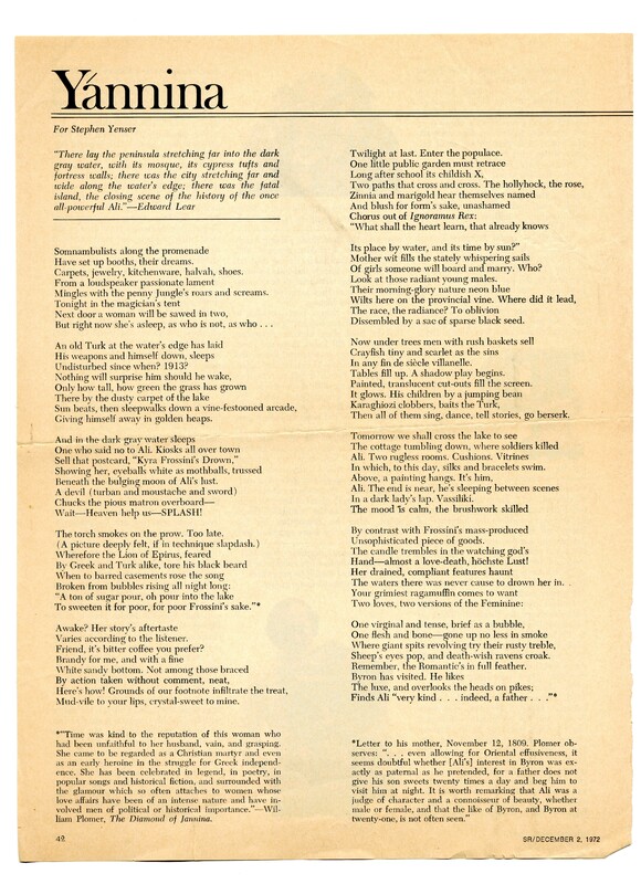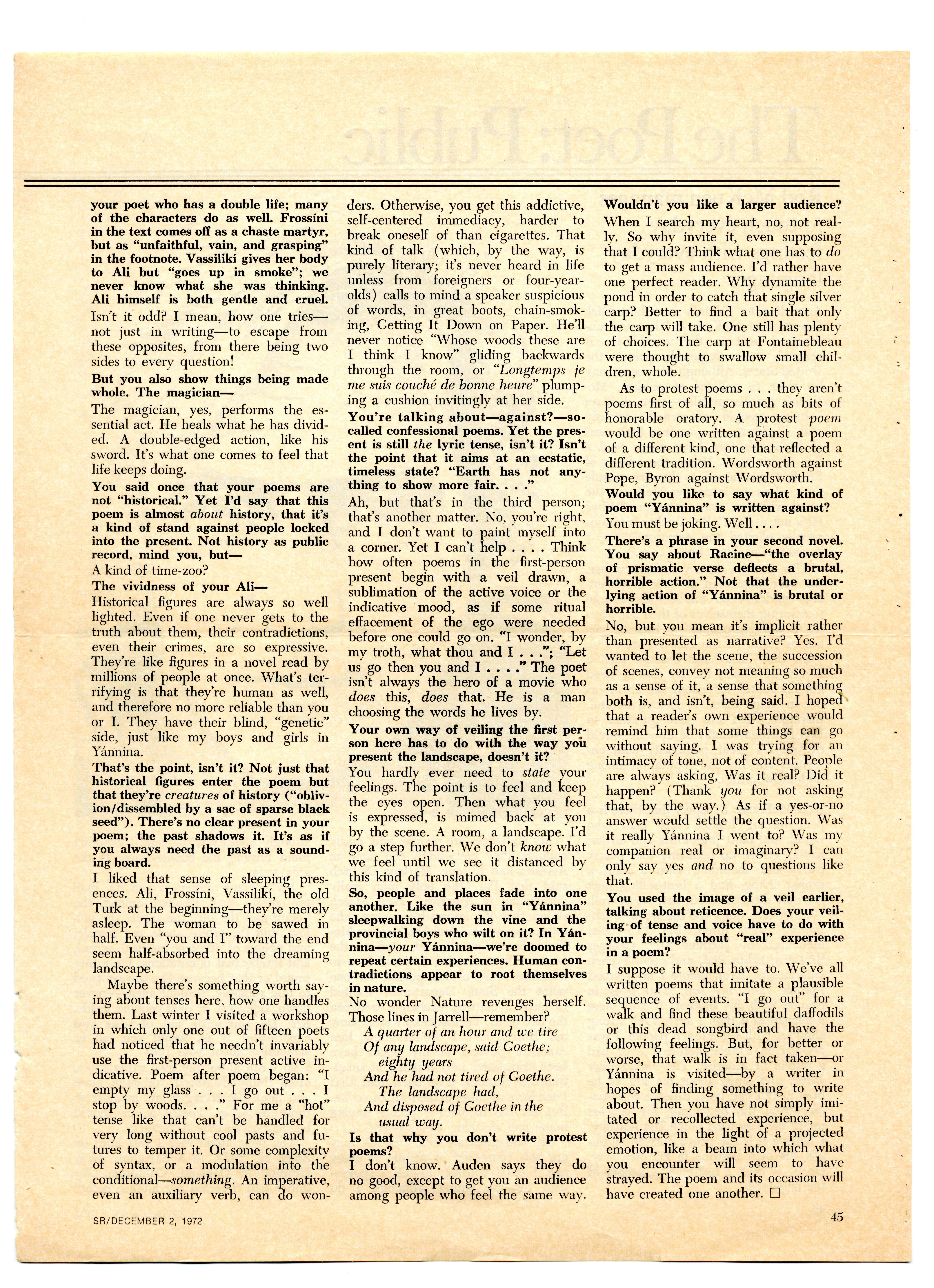 - "The Poet: Private" by David Kalstone from Saturday Review, December 2, 1972