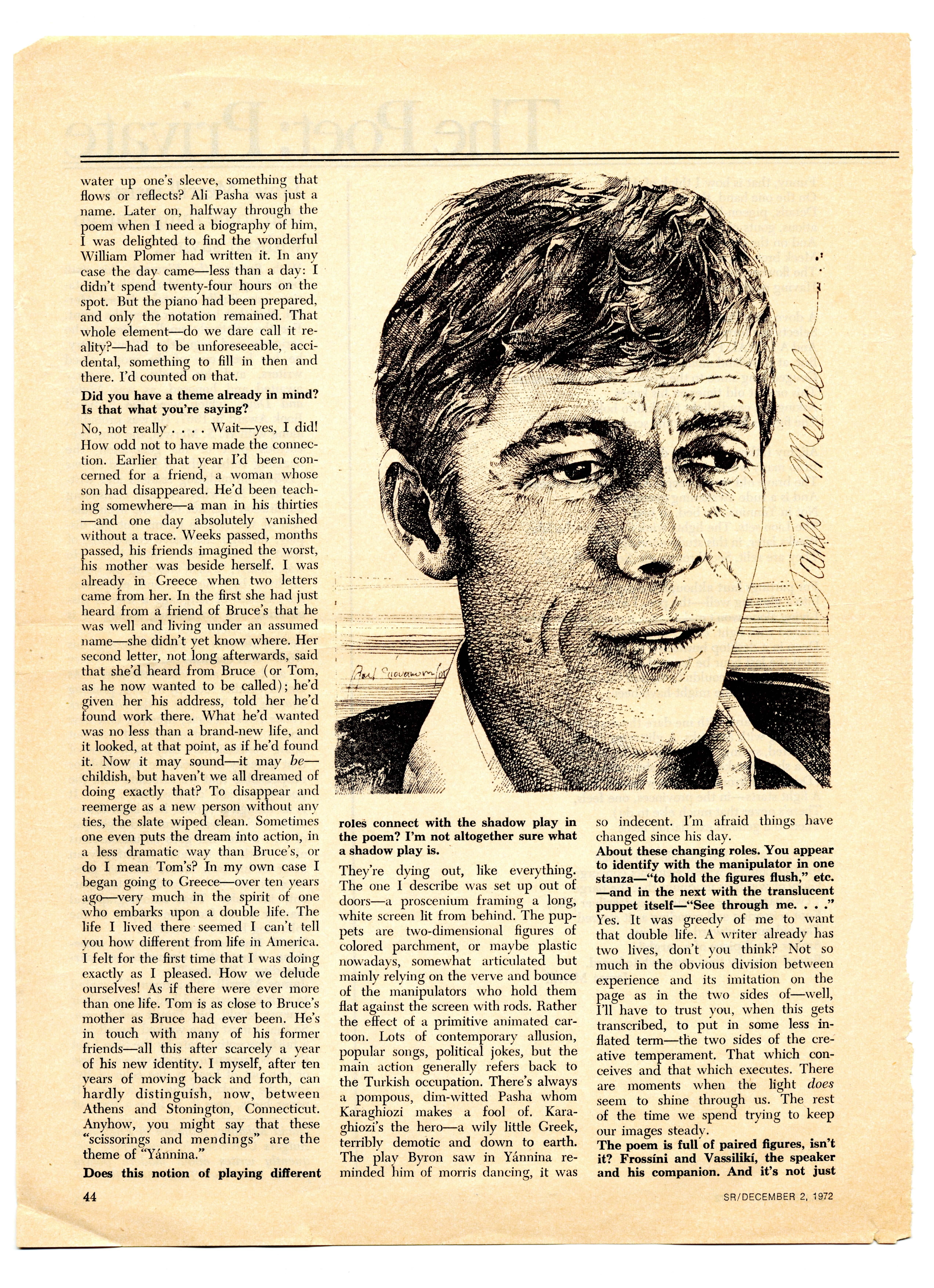- Clipping of "The Poet: Private" by David Kalstone from Saturday Review, December 2, 1972.