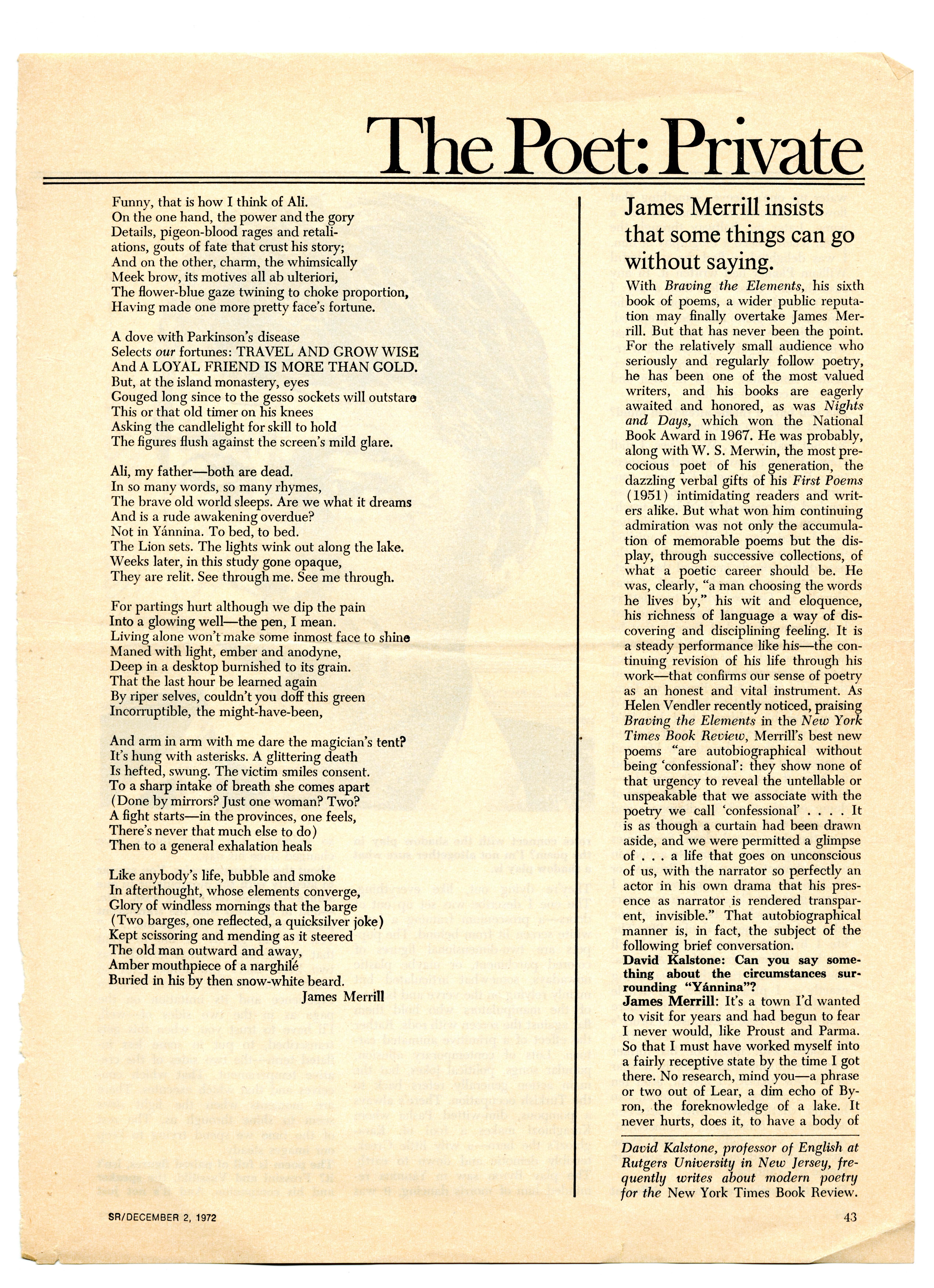 Kalstone, David. 1972. “‘The Poet: Private’ by David Kalstone from Saturday Review, December 2, 1972”. Series VIII.2.a.I Ephemera - Clippings. Saturday Review, James Merrill's Poetry Manuscripts, accessed February 11, 2026, https://digitalexhibits.library.wustl.edu/s/james-merrill-poetry-manuscripts/item/32845
