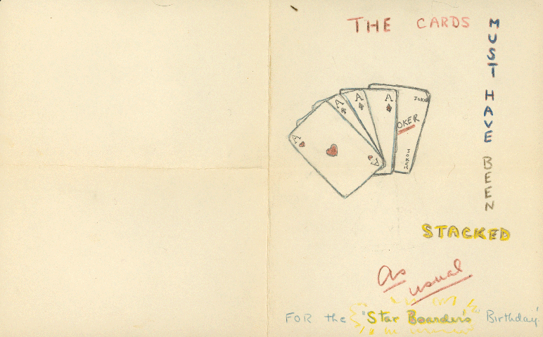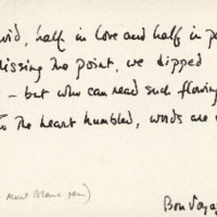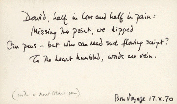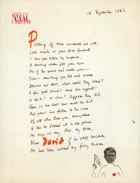 - In poems expressed as party invitations, birthday sentiments, holiday wishes, love notes, get-well cards, epithalamia, postcards, and accompaniments to gifts, James Merrill brought verse into everyday life. These occasionals commemorate stilled moments — intersections between the poet and his mother, friends, and lovers — yet they are not dampened or limited by the grounding moment for which they were written. Rather, in these works, Merrill imbues the everyday with metaphor, humor, and new meanings for those closest to him. Many of the poems Merrill wrote for celebrations create gifts that can only be given through metaphor. By figuratively inscribing interpretation onto an image, these poems symbolically offer meanings. In a poem for David Jackson's fortieth birthday, Merrill moves beyond consolation to offer a solution to time's loss. The poem touchingly, and, of course, humorously hands over a manner of thinking that might alleviate Jackson's anxiety over aging. "A Birthday Cake for David" gives a metaphorical cake that can be, like one's affection, both lasting and consumed. The more austere poem that Merrill wrote for his mother's wedding offers an interpretive gift, one that draws the wedding into the classical orchard. The manner of giving in these poems lays bare Merrill's deep trust in language and its ability to concretize sentiment and meaning more tangibly than any actual object. All of Merrill's poems for occasions illustrate his constant, often incorrigible engagement with language. The depth of this engagement announces itself in the many revisions of the occasional poems Merrill presented as quickly drafted notes. For one such poem, a four-line note he wrote to accompany the gift of a pen, Merrill refigured the poem at least six times before he presented it, and then one more time before he preserved it on a running sheet of such notes. While the initial version of the poem begins, "The writing on the wall was plain. / Missing the point, one dipped one's pen," the version given with the gift begins, "Dear David, so much joy and so much pain / Missing the point we dipped / our pens." A variation on this line appears in Merrill's poem "Yannina" in Divine Comedies: "For partings hurt although we dip the pain / Into a glowing well — the pen I mean." The relationship between "pen" and "pain," between writing and remembering, clearly haunts Merrill's vision and revision; even a small note, for one person's eyes only, is troubled by the pressure to transcribe the correlation between the terms. The final line of the final version, the wording of which is almost identical to the initial version, reads: "Where hearts are humbled, words are vain." While Merrill might be seen as relinquishing the demands of experience to be transcribed, he is offering this line as he offers the essential tool of writing. Often the notes that Merrill wrote were surprisingly spontaneous, off the cuff, and off-color. He celebrates a six-week hiatus from cigarettes in a quatrain of rhyming dimeter to his mother, for example, and then in another quatrain, he invites a lover to smoke a joint. Merrill is playfully self-aware of the contradiction between his public writing and the sometimes-doggerel verse that employs the poetic forms and techniques elsewhere turned to elegance. The occasionals release Merrill, in specific moments, from the constraints of his aesthetic and his reputation. Where else can Merrill write of himself, as he does in a bon voyage postcard picturing an Indian royal tent: "Many's the day / JM just went / And sulked inside / his disconTENT."? Often, with humor and irony and intimacy, these notes demonstrate a pleasure in language for its own sake. The occasional poems show Merrill weaving poetry and the everyday with the linguistic sensitivity for which he is known. Because these poems were written for occasions, they literalize the leaps that characterize much of Merrill's work; narrative events become an arena in which to think about the connections we have to each other and the trajectories of a life, while the arena is altered in the process.