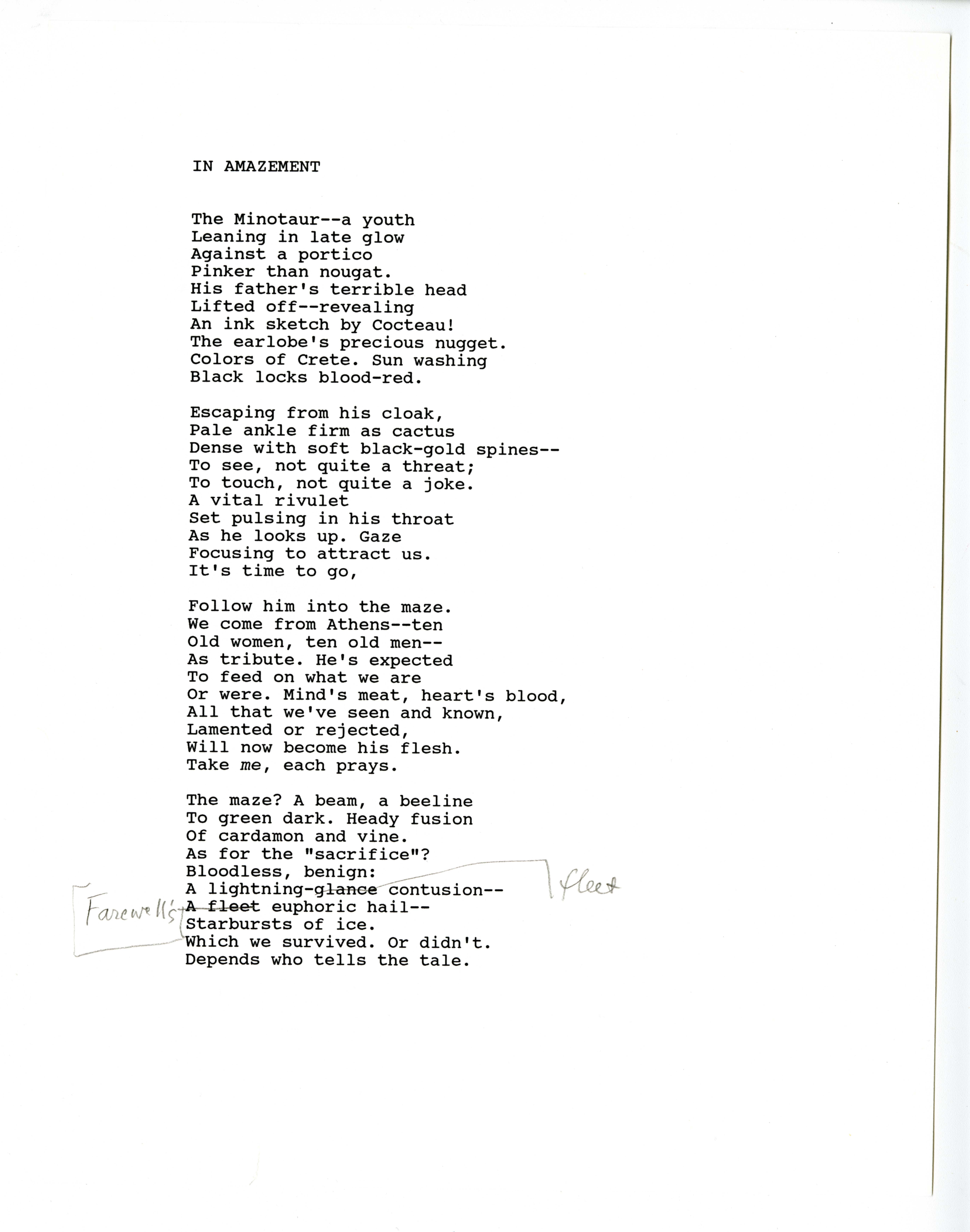 - Manuscripts of "In Amazement" and "Minotaur"