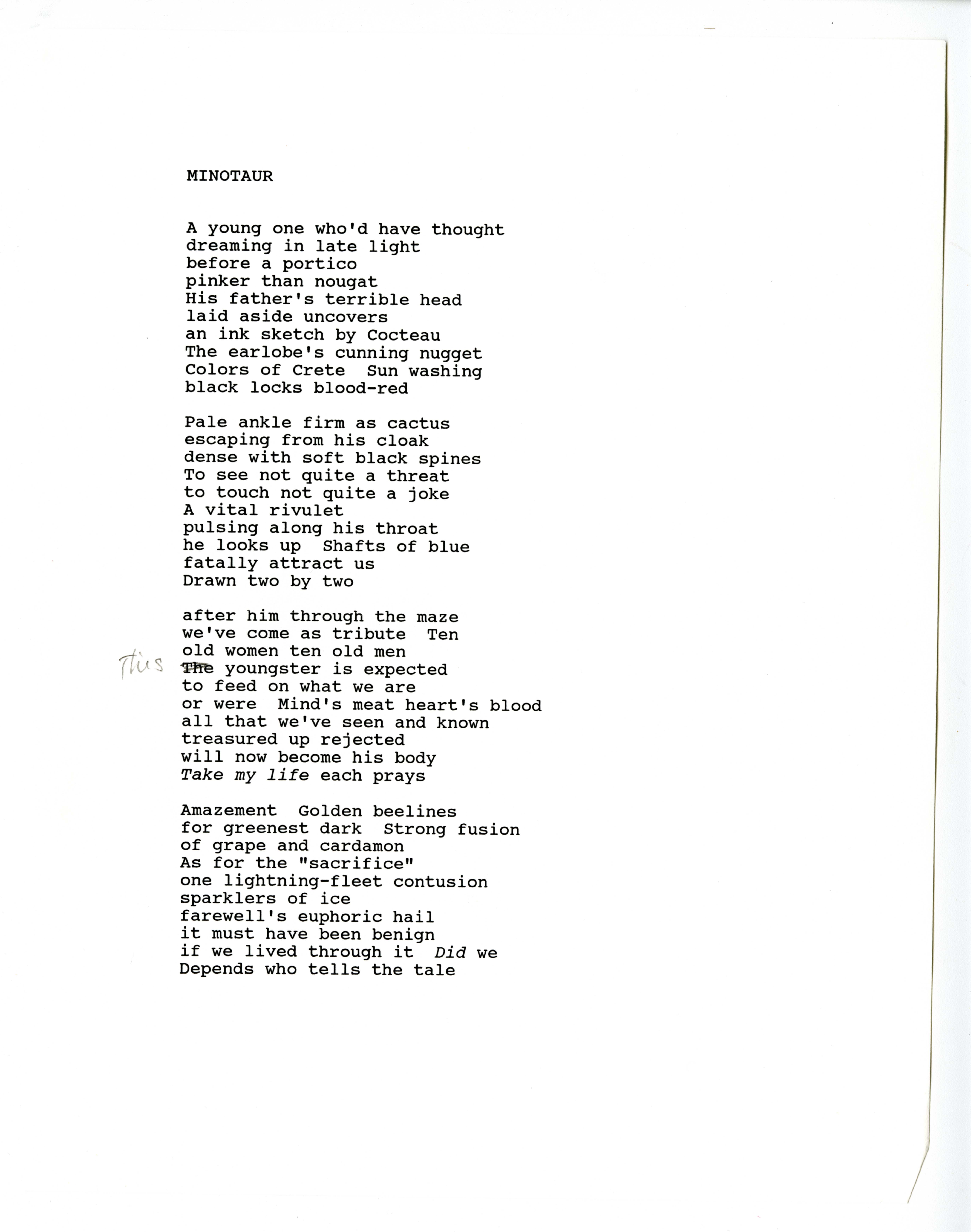- Manuscripts of "In Amazement" and "Minotaur"