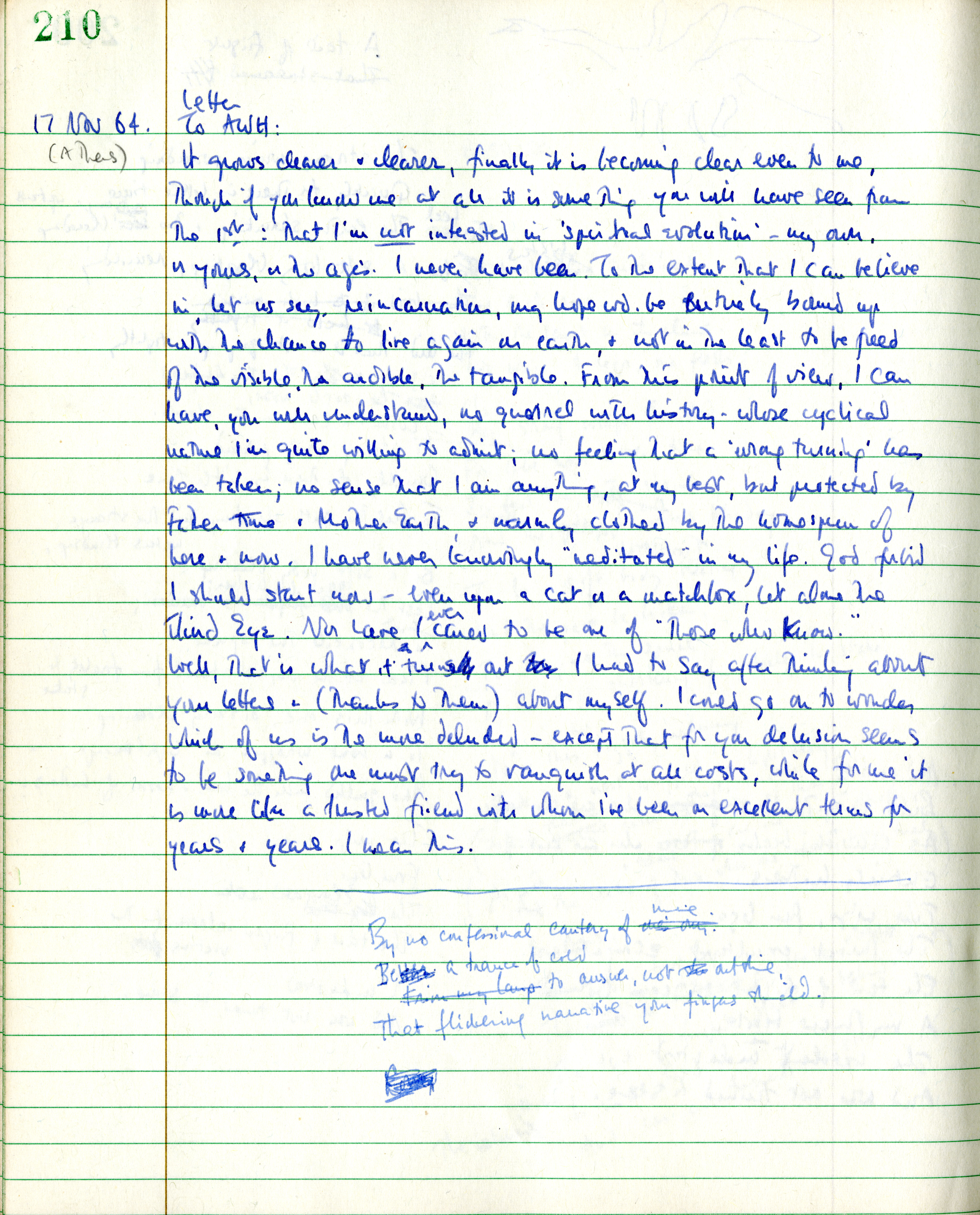- Draft of a letter to Tony Harwood about Merrill's beliefs on soul and spirituality. These would feed into "The Broken Home," "From the Cupola," and "Days of 1964."