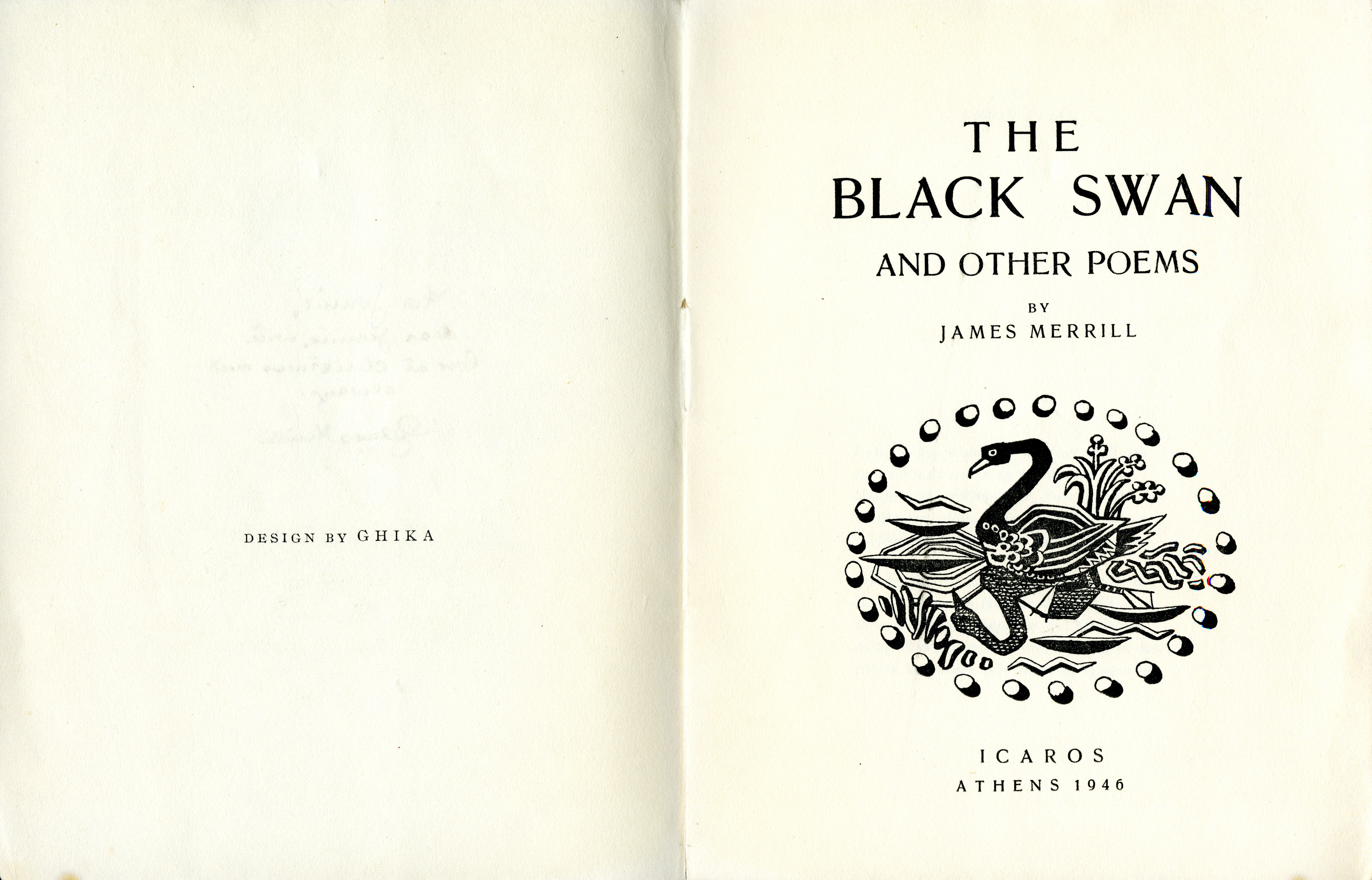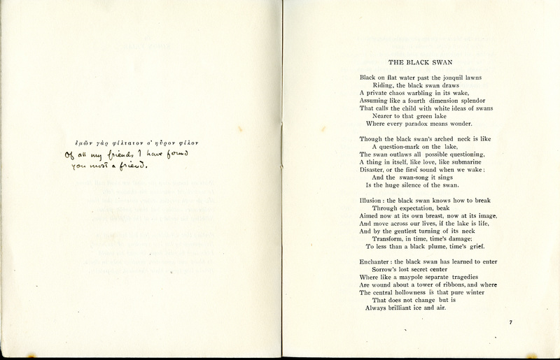 Merrill, James. 1945. “The Black Swan”. Rare Books Catalogued Items. Athens [Greece]: Icaros, James Merrill's Poetry Manuscripts, accessed February 11, 2026, https://digitalexhibits.library.wustl.edu/s/james-merrill-poetry-manuscripts/item/38724