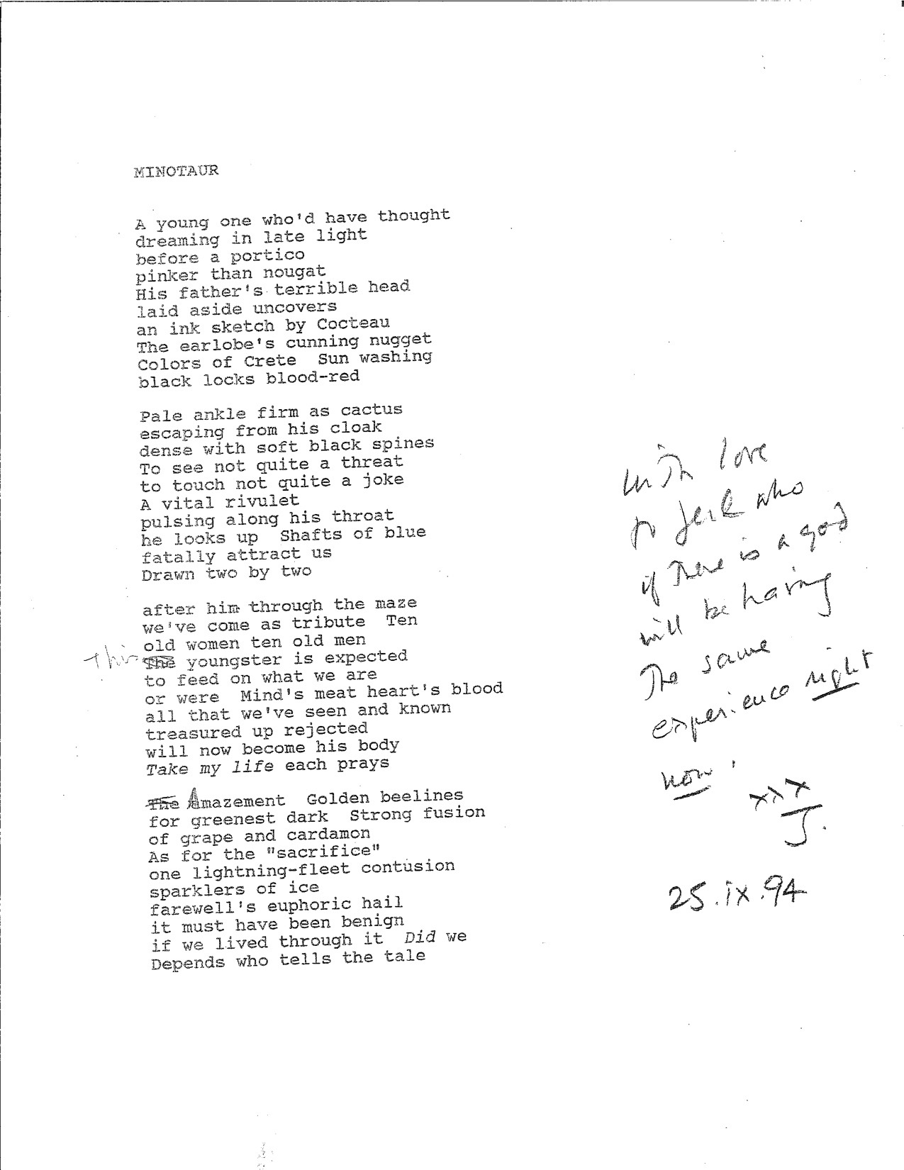 - Manuscripts of "In Amazement" and "Minotaur"