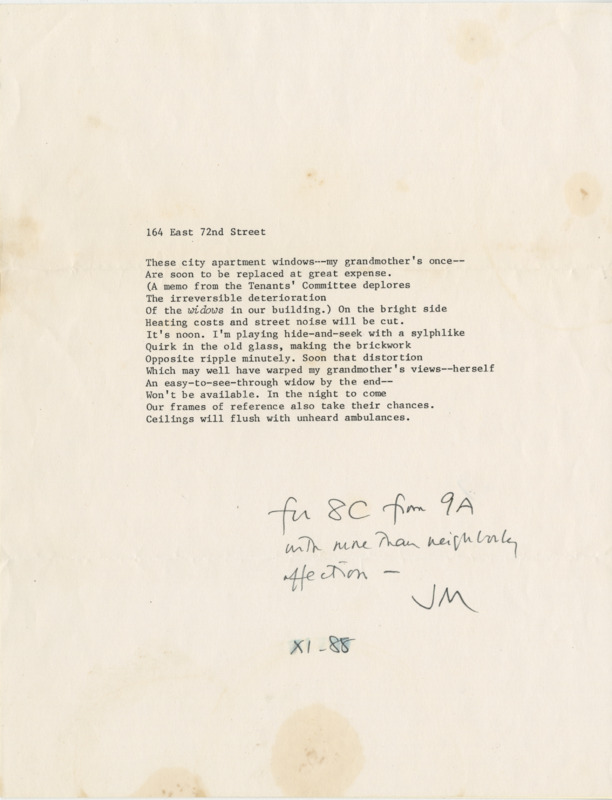 Typescript given to Bannon McHenry: "for 8c from 9A with more than neighborly affection — JM. xi.88." Courtesy of the Bannon McHenry James Merrill Collection. Vassar College Libraries.