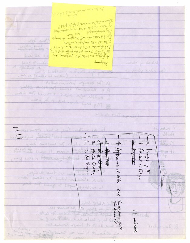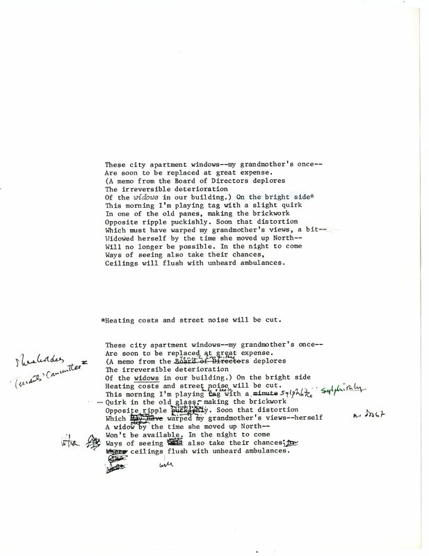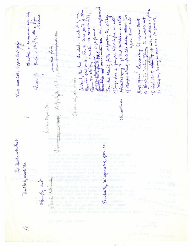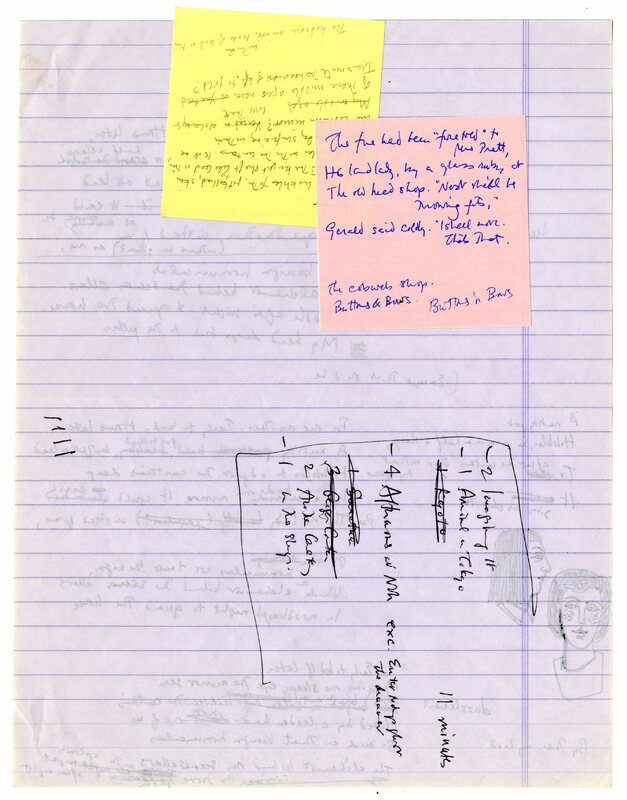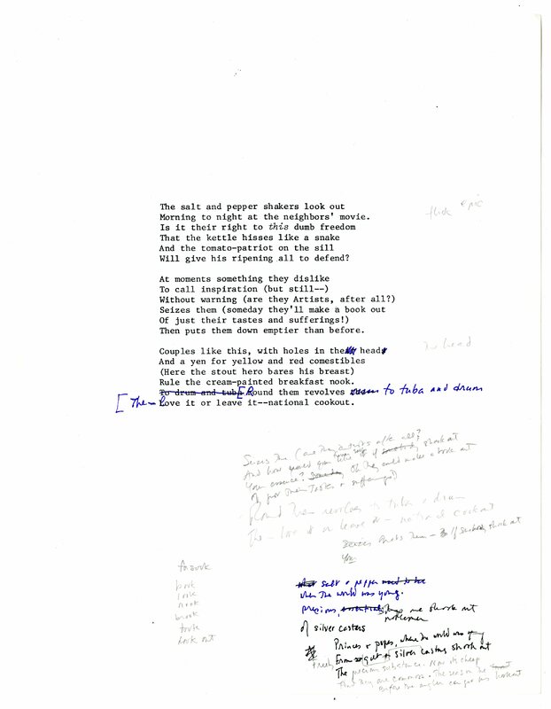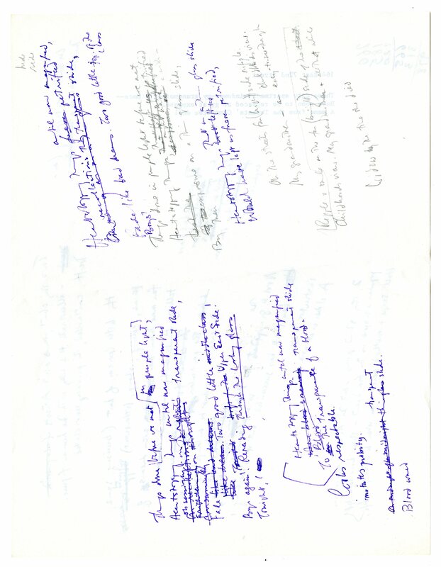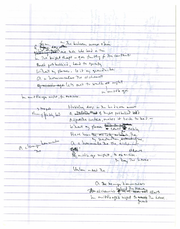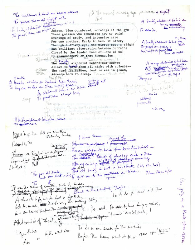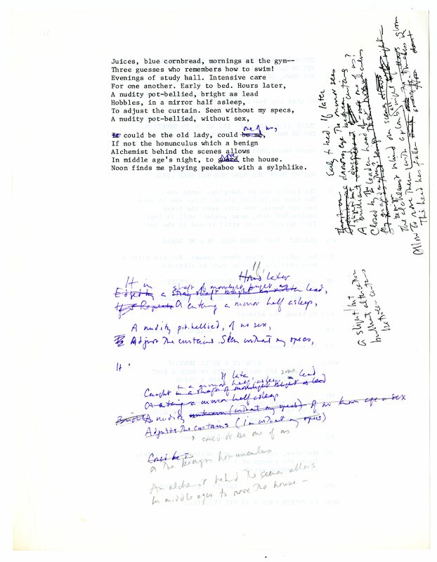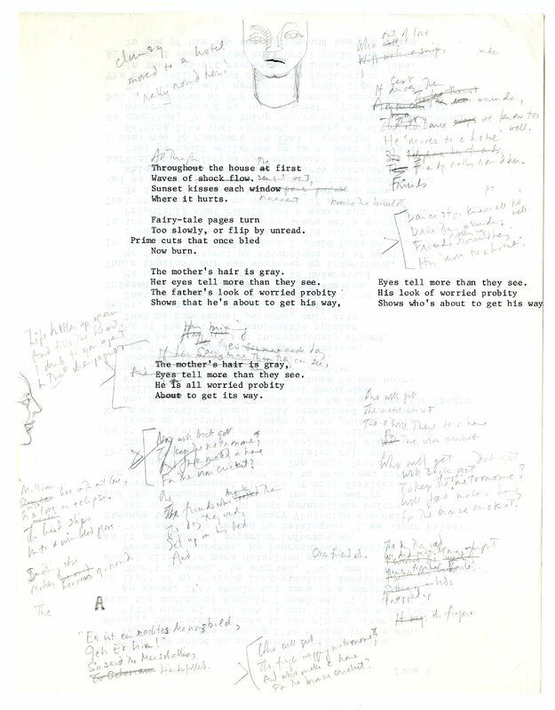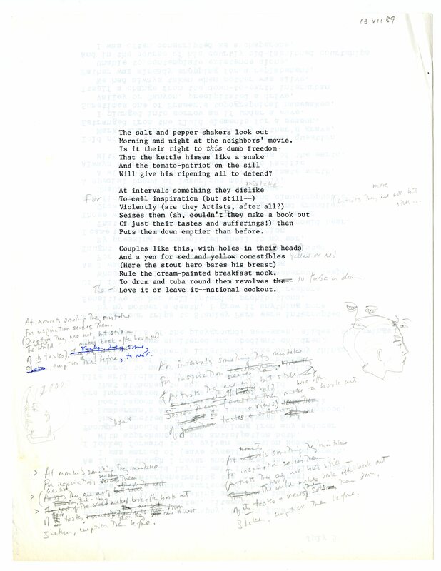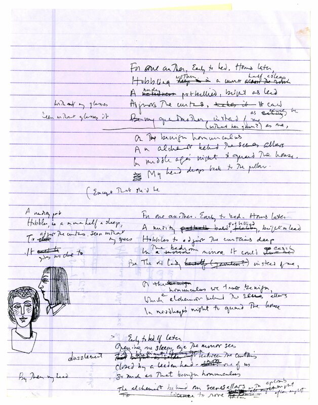 14. "clumsy moved to a hotel 'rally round her.'" Two pencil drawings. Draft of Merrill's poem "Pledge," A Scattering of Salts (New York: Knopf, 1995).