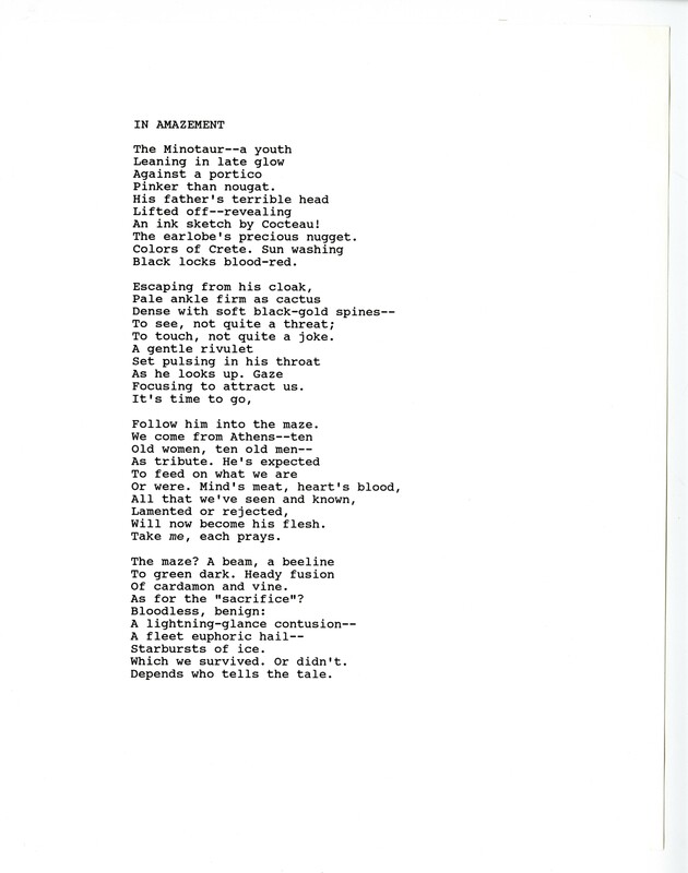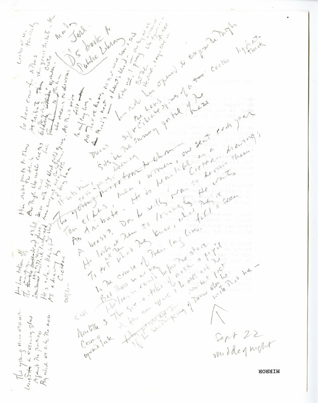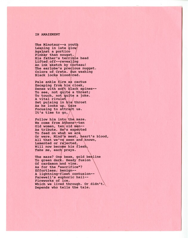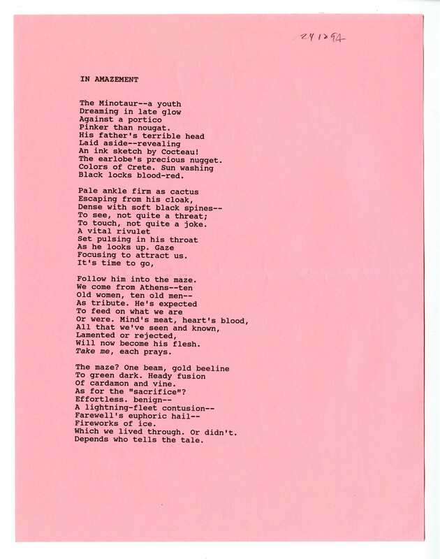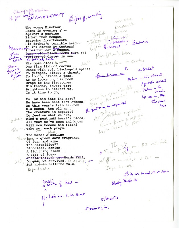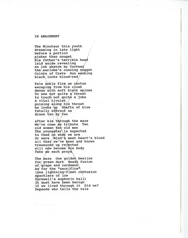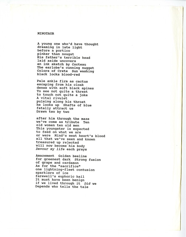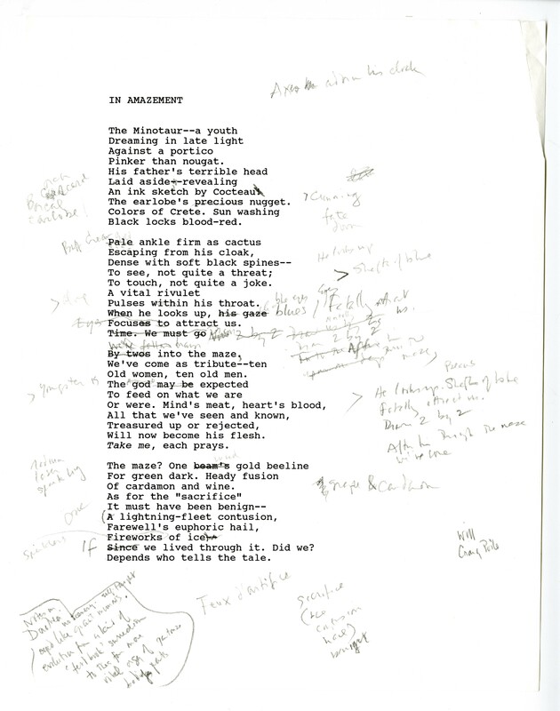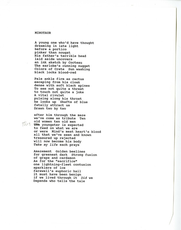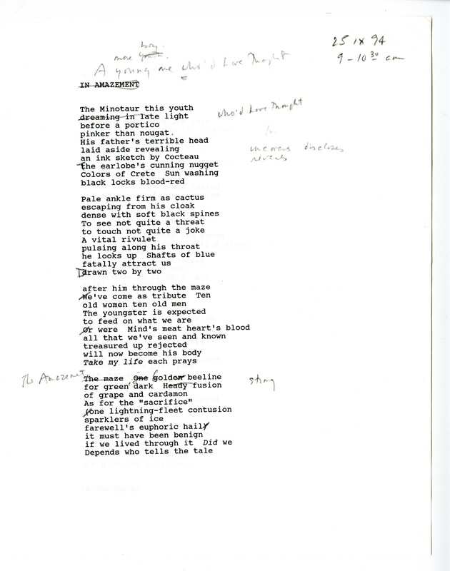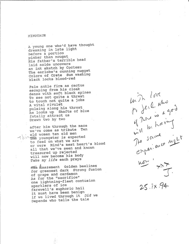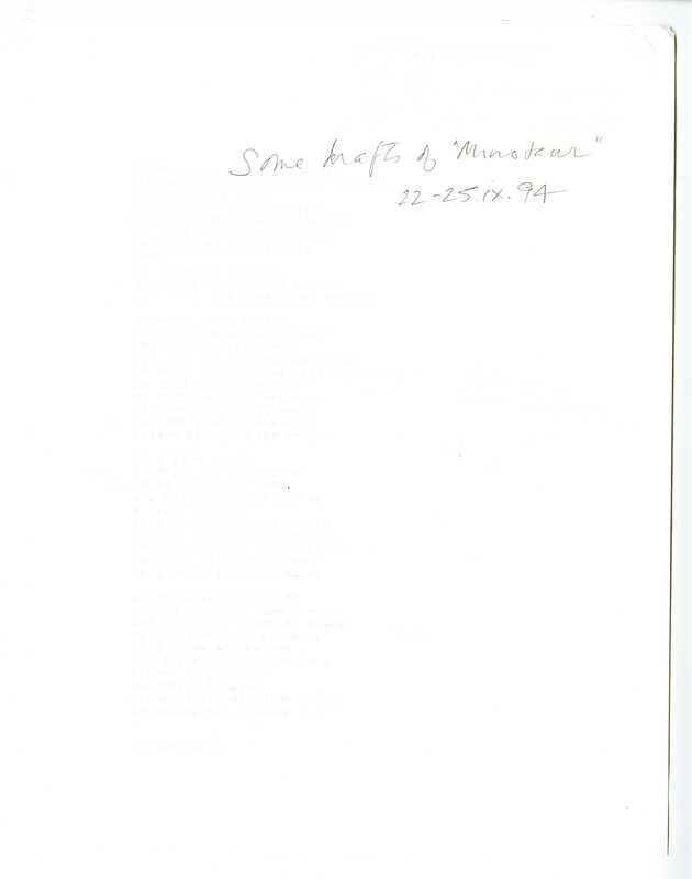 8) "The young Minotaur. 22 - 23 ix 94." Revisons in pencil. Note at bottom in red ink: "The creature is <young god may be> expected to feed on all we are Minds meat & hearts blood All that we've seen & felt (known) Let me become his body Be what he knows, each prays.