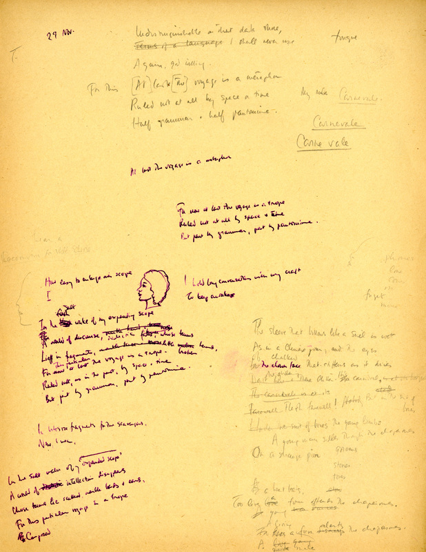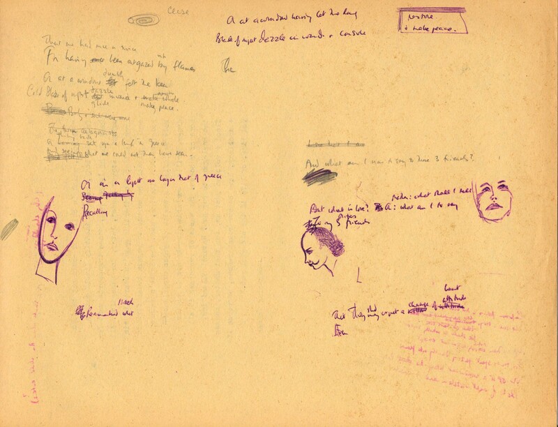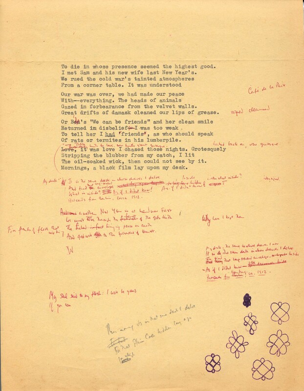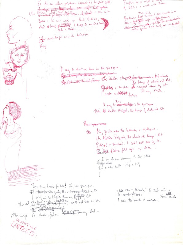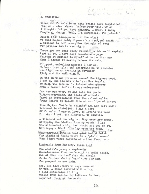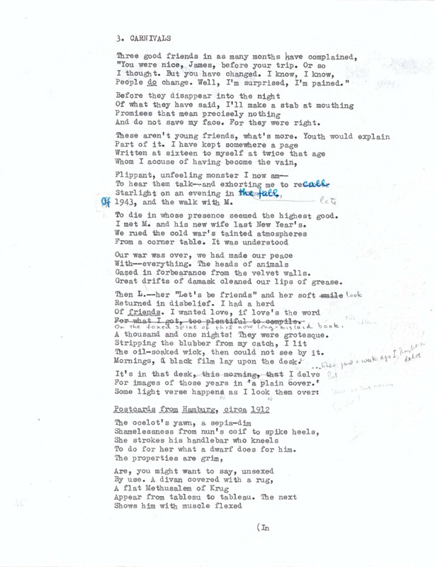 Manuscript 2 identifies the "Three good friends" that reproach the poem's narrator in the opening of "Carnivals" with a dedication:"for C., G., & K." The initial C refers to Claude Fredericks, and K to Kimon Friar. Langdon Hammer informs me that the the G refers to Merrill's friend Grace Stone. In James Merrill: Life and Art, Hammer suggests that Merrill's recently deceased friend "Taki" and Jane Bowles were also on his mind at this time. Taki is memorialized in "The Cure": "Chauffeured a truck; last Friday broke his neck / Against a tree." (Manuscript 7 contains some draft lines of the sequence's final poem on Scheherazade and the Sultan.)