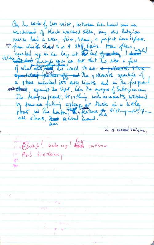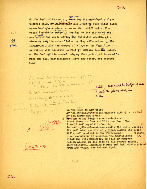 Following the sonnet form of "The Hamam," the four pentameter quatrains of this section describe the old and modern sections of Istanbul, separated by the "mirror of the Bosphorus." (The description recalls the city descriptions in the "Related Verses" section of this site.) The poem is interrupted after the first quatrain by a prose description of the wen on a beloved grandmother. Manuscript 4 is dated "Istanbul. 21 March. I."